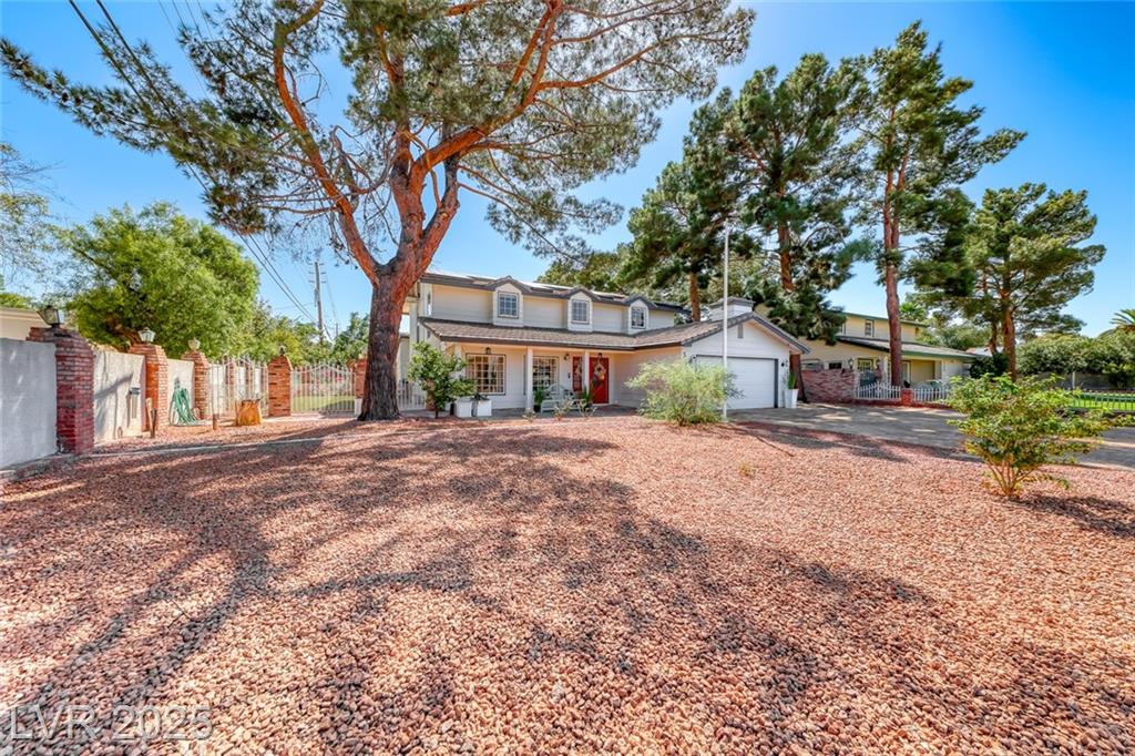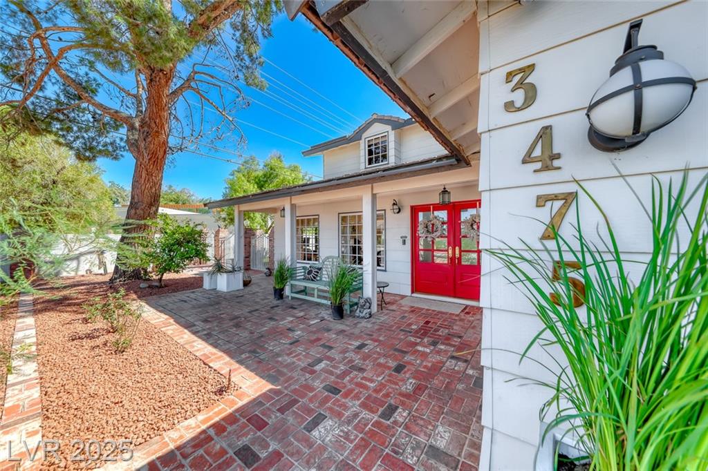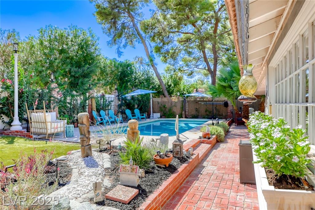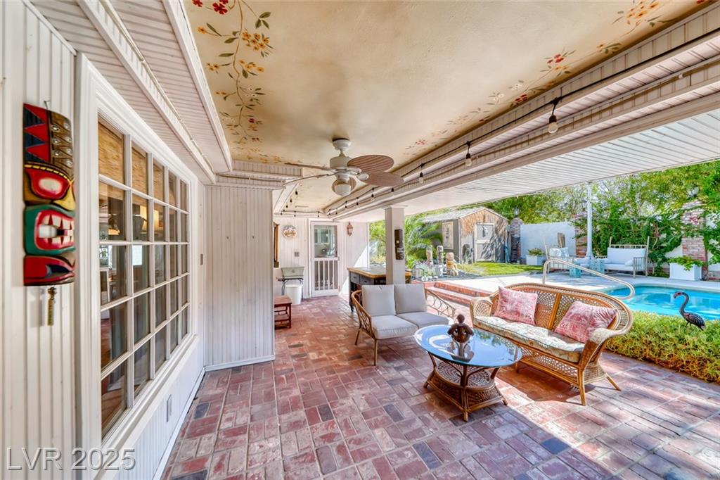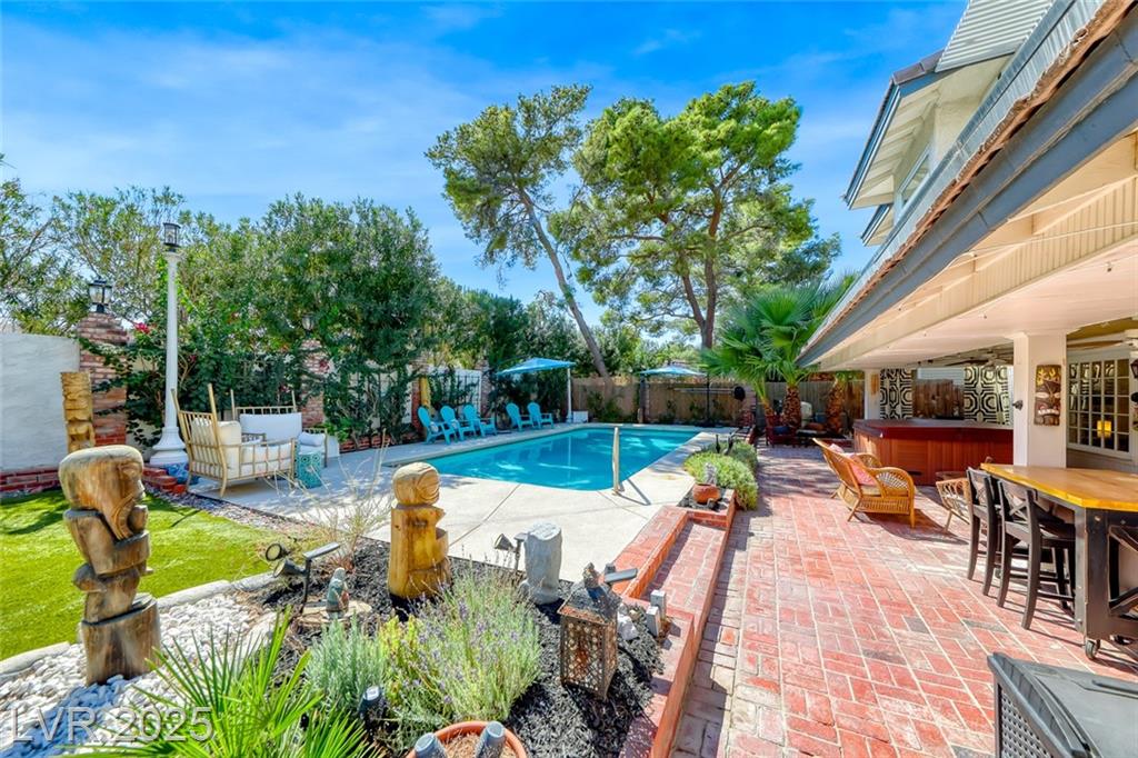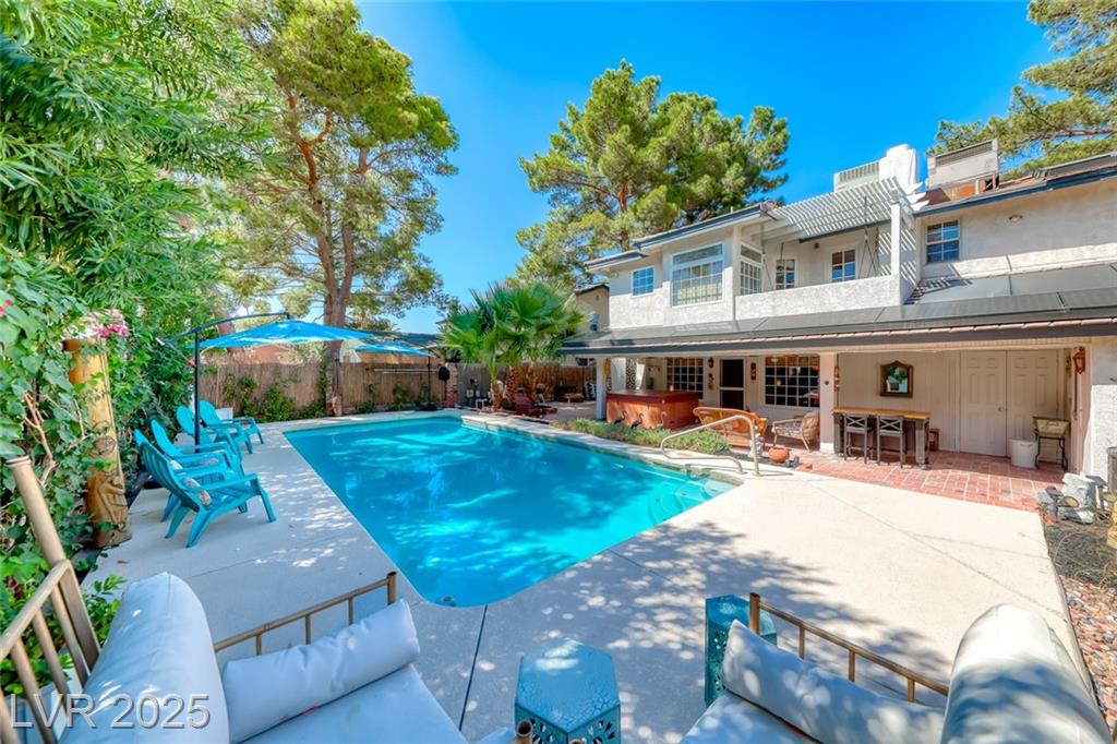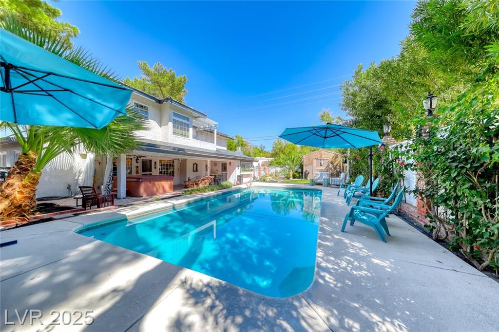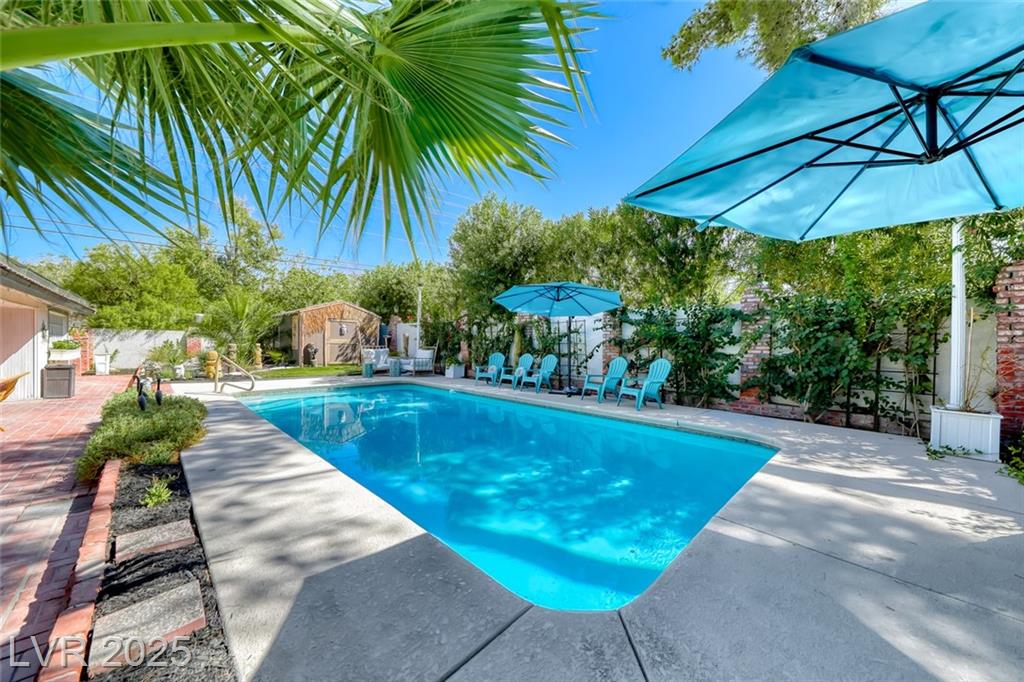 Vintage Cape Cod charm meets Las Vegas living! This 2,679 sq. ft. home blends timeless character with modern comfort. Two spacious primary suites feature spa-like bathrooms and a private balcony—perfect for morning coffee or evening sunsets. The chef’s kitchen boasts a commercial-grade stove/oven and large brick island with butcher block counter, ideal for culinary adventures. The huge family room invites gatherings with its cozy wood-burning fireplace, built-in bookcases, convenient desk, and nearby half bath. Step outside to your own private resort with a sparkling pool, an expansive covered patio for entertaining, and a 10x14 tough shed transformed into a tiki bar for year-round fun. There is an outside area perfect for furry friends at one end, and on the opposite end of the home an area for rv parking and toys. There are roof mounted solar electric panels for energy efficiency! A rare find offering personality, versatility, and endless possibilities in the heart of Las Vegas!