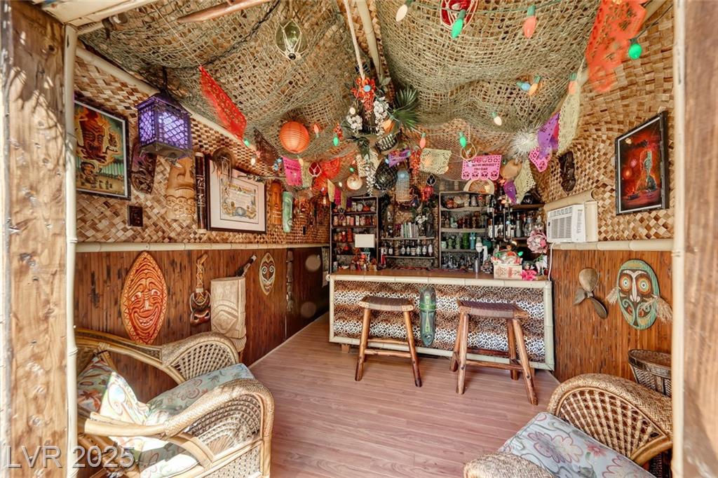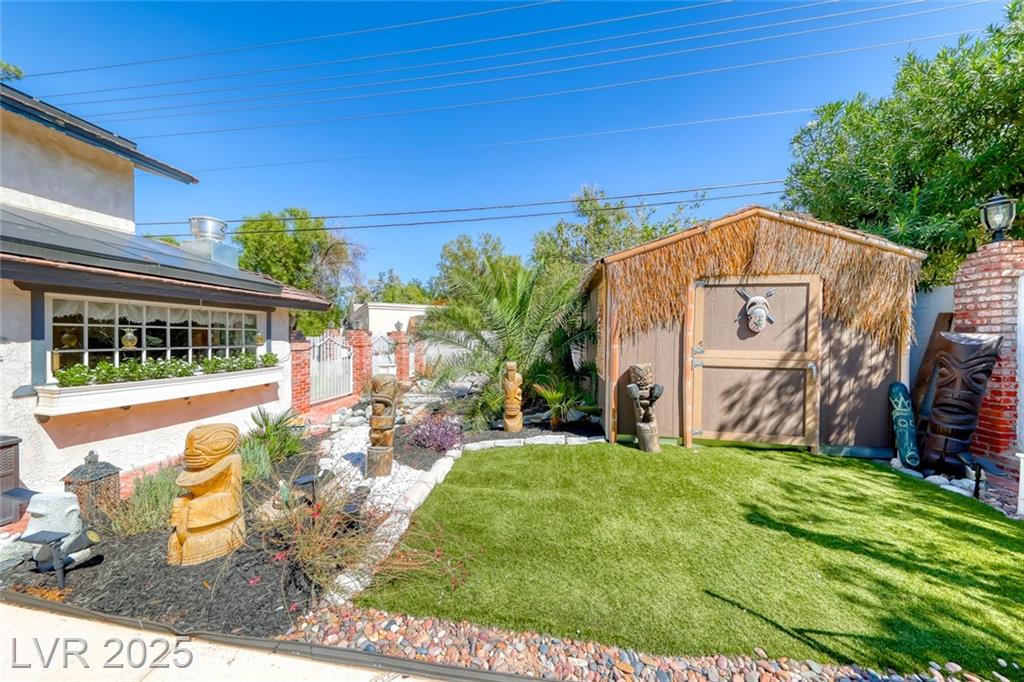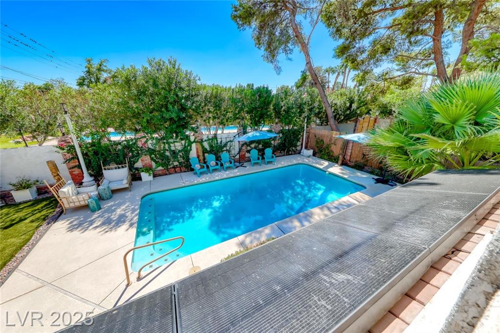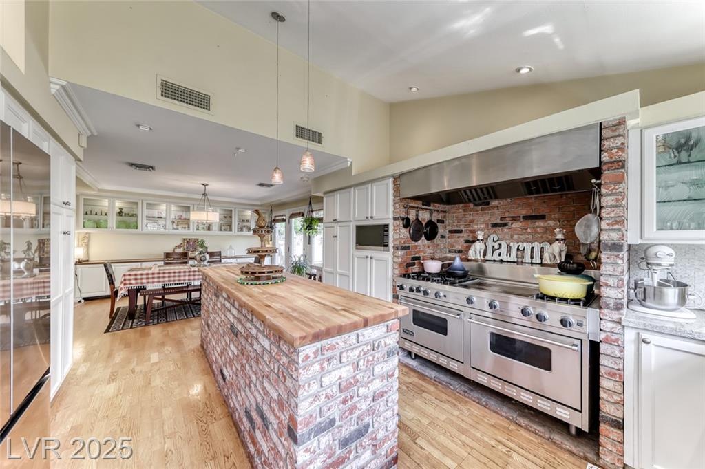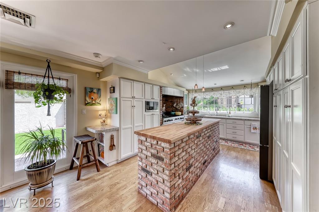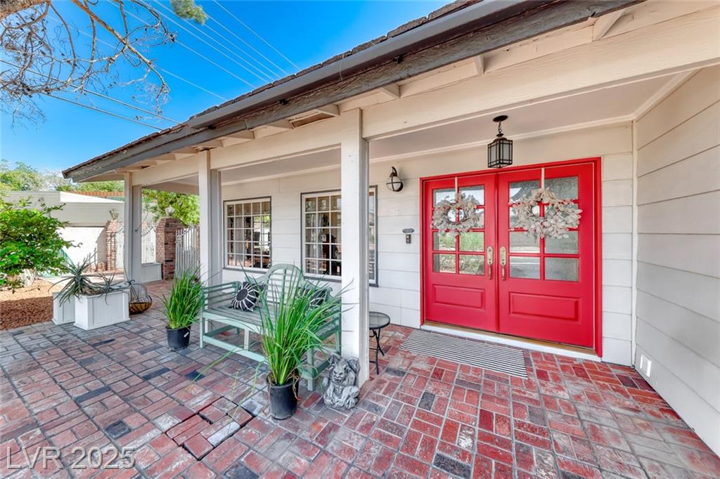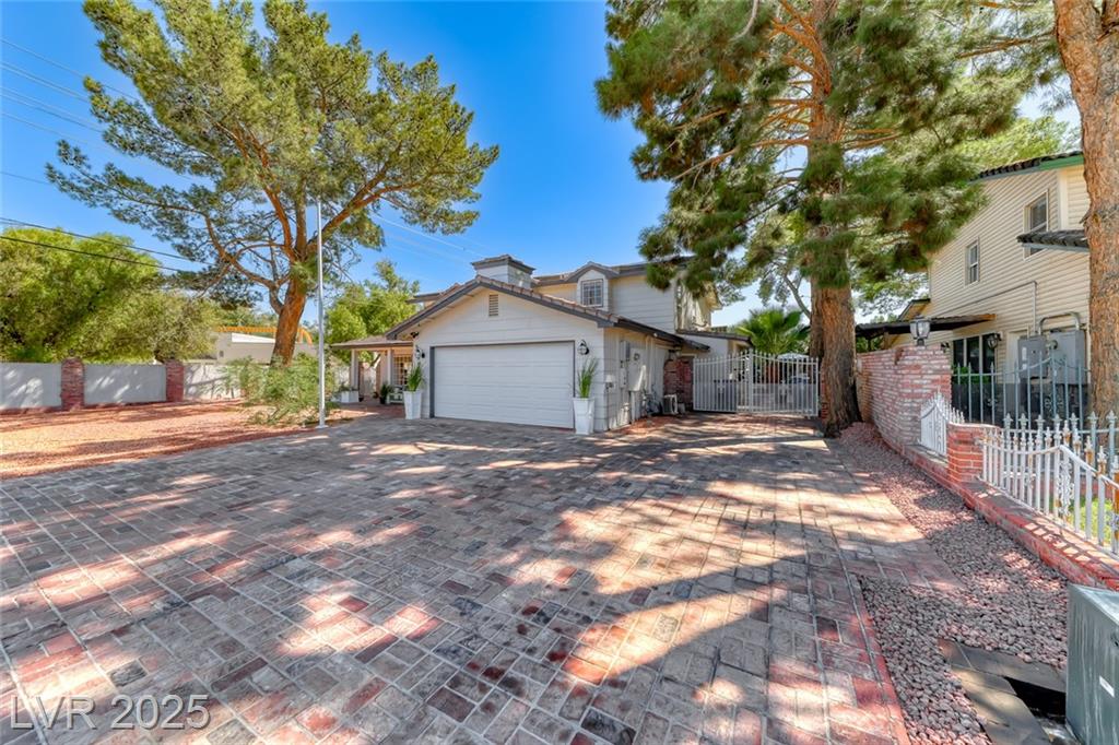 Vintage Cape Cod charm meets Las Vegas living! This 2,679 sq. ft. home blends timeless character with modern comfort. Two spacious primary suites feature spa-like bathrooms and a private balcony—perfect for morning coffee or evening sunsets. The chef’s kitchen boasts a commercial-grade stove/oven and large brick island with butcher block counter, ideal for culinary adventures. The huge family room invites gatherings with its cozy wood-burning fireplace, built-in bookcases, convenient desk, and nearby half bath. Step outside to your own private resort with a sparkling pool, an expansive covered patio for entertaining, and a 10x14 tough shed transformed into a tiki bar for year-round fun. There is an outside area perfect for furry friends at one end, and on the opposite end of the home an area for rv parking and toys. There are roof mounted solar electric panels for energy efficiency! A rare find offering personality, versatility, and endless possibilities in the heart of Las Vegas!