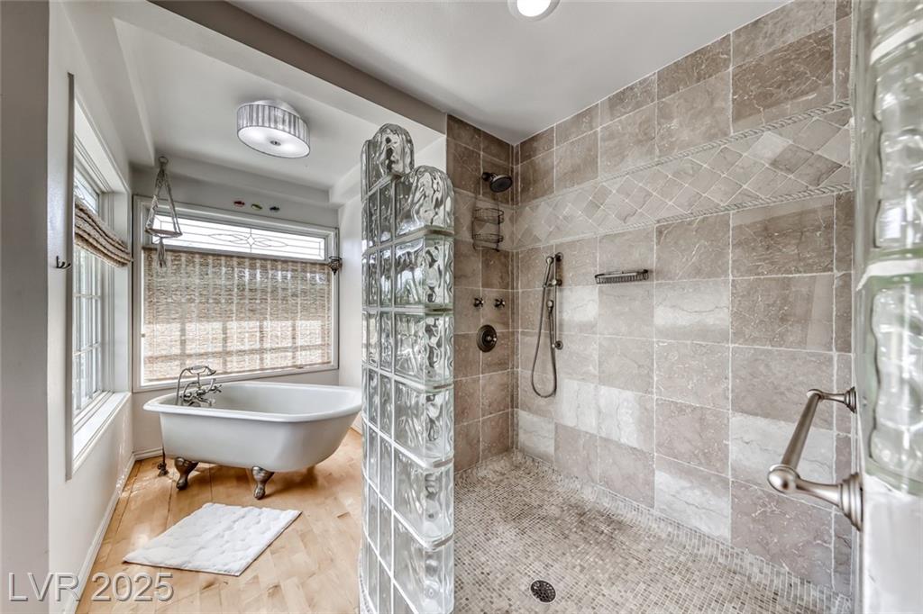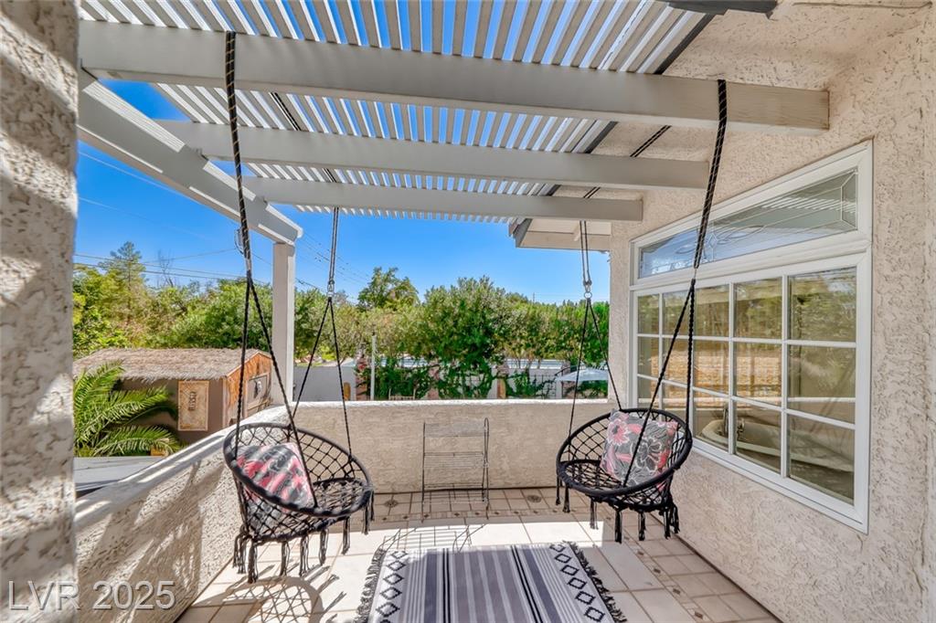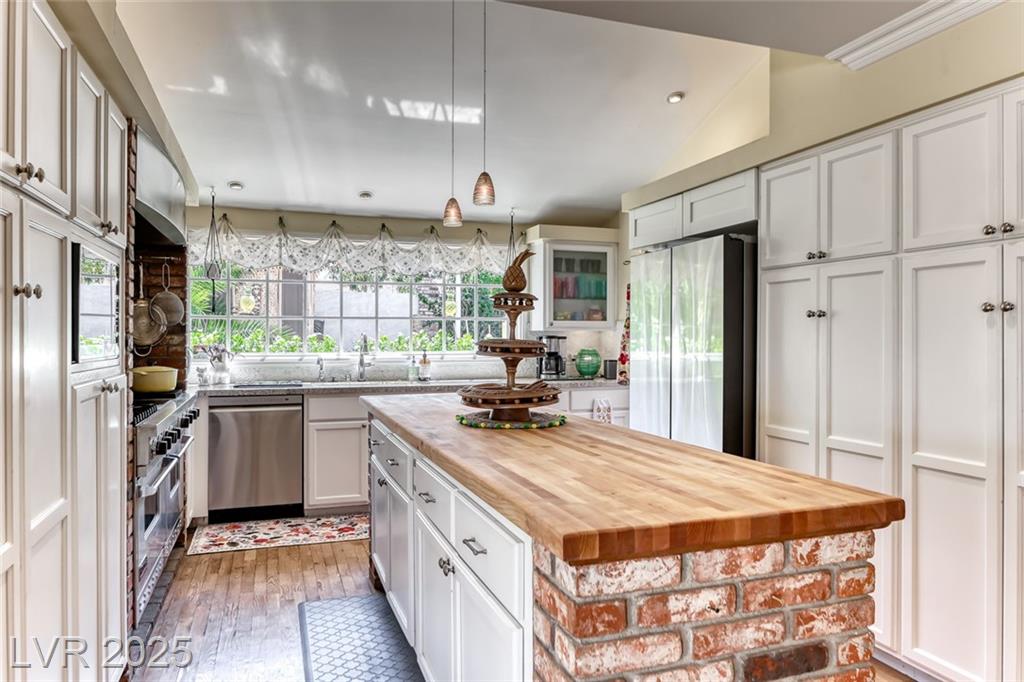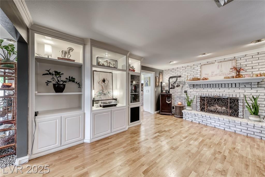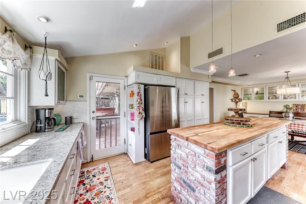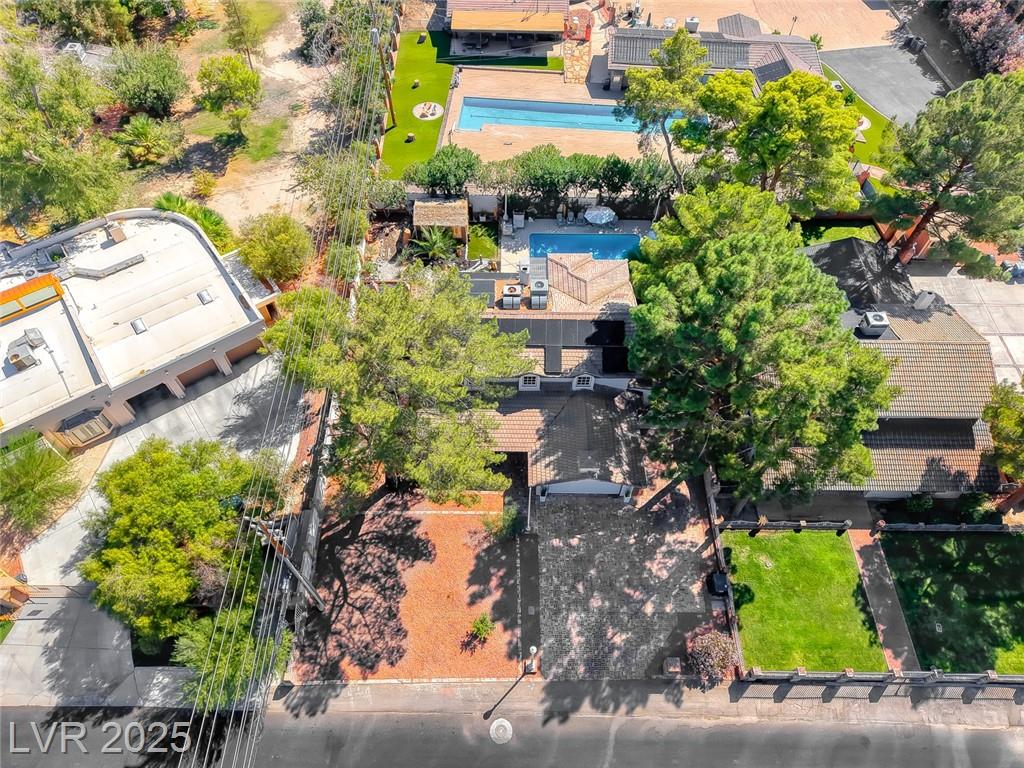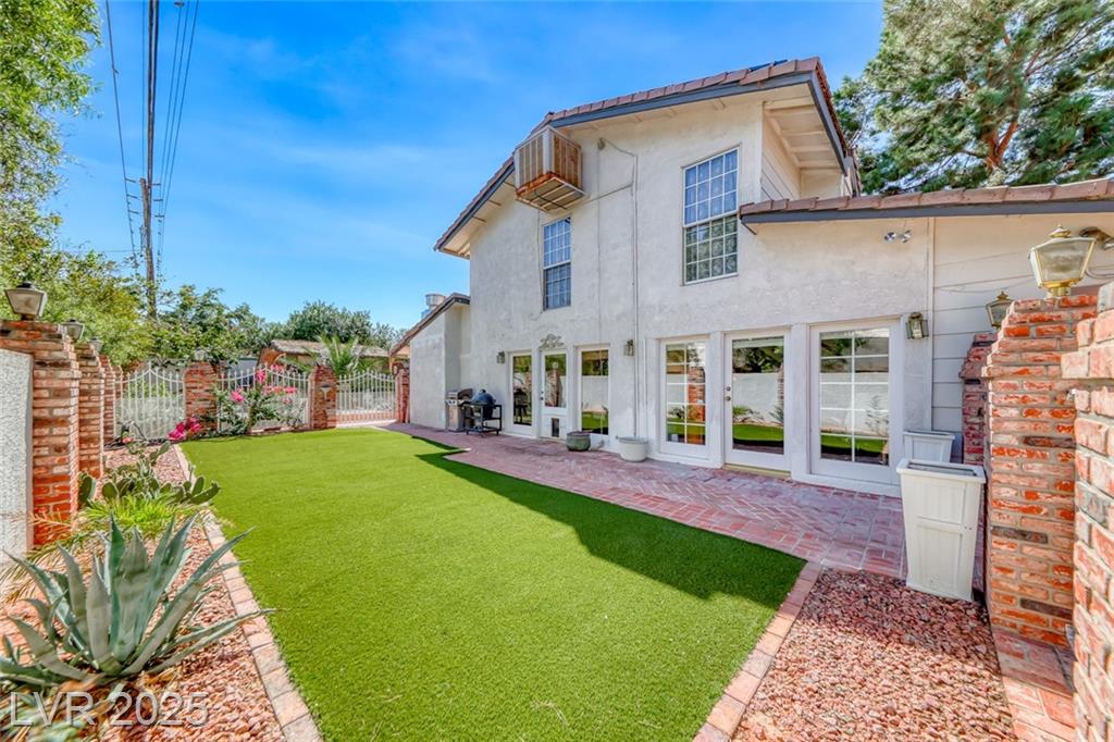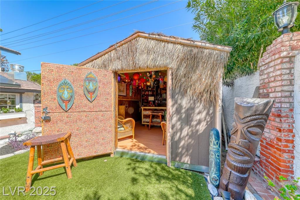Vintage Cape Cod charm meets Las Vegas living! This 2,679 sq. ft. home blends timeless character with modern comfort. Two spacious primary suites feature spa-like bathrooms and a private balcony—perfect for morning coffee or evening sunsets. The chef’s kitchen boasts a commercial-grade stove/oven and large brick island with butcher block counter, ideal for culinary adventures. The huge family room invites gatherings with its cozy wood-burning fireplace, built-in bookcases, convenient desk, and nearby half bath. Step outside to your own private resort with a sparkling pool, an expansive covered patio for entertaining, and a 10x14 tough shed transformed into a tiki bar for year-round fun. There is an outside area perfect for furry friends at one end, and on the opposite end of the home an area for rv parking and toys. There are roof mounted solar electric panels for energy efficiency! A rare find offering personality, versatility, and endless possibilities in the heart of Las Vegas!