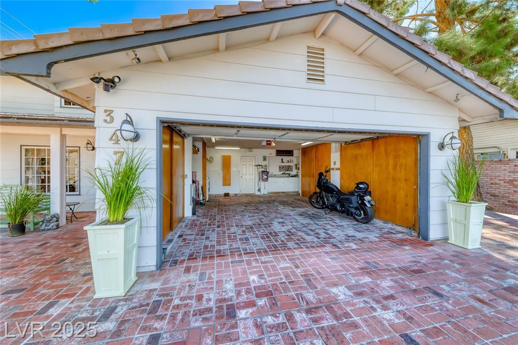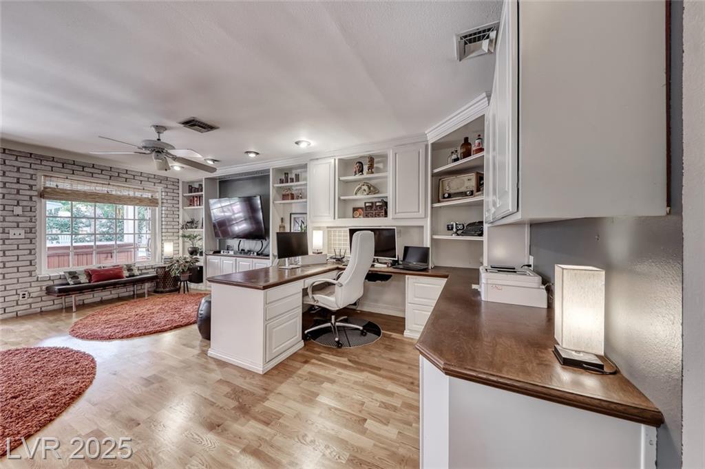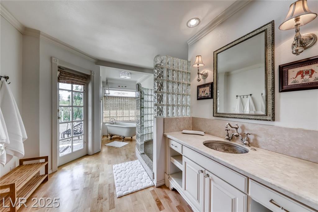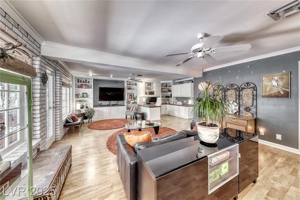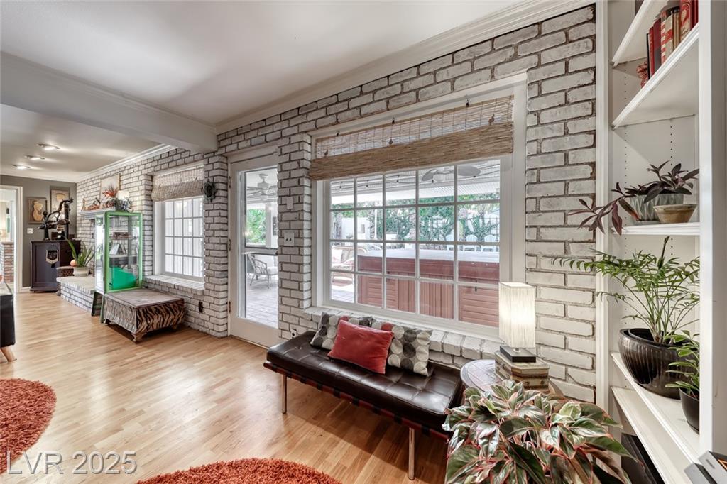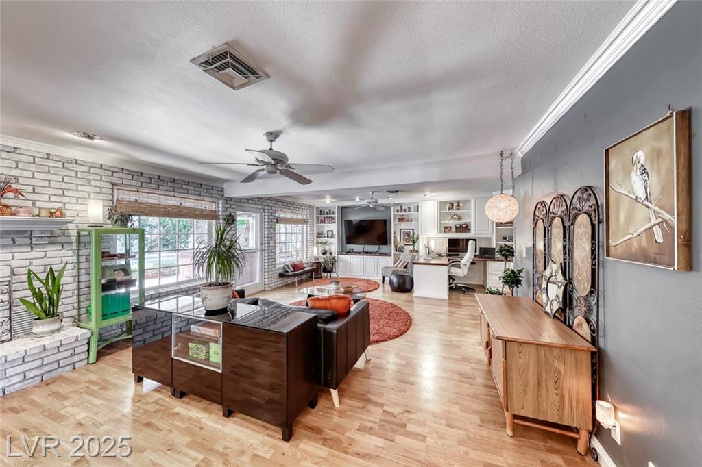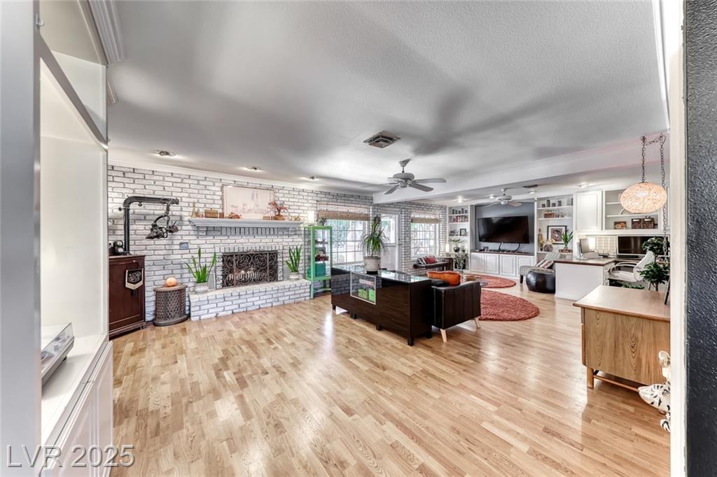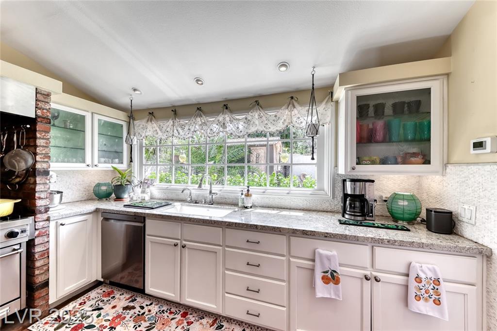 Vintage Cape Cod charm meets Las Vegas living! This 2,679 sq. ft. home blends timeless character with modern comfort. Two spacious primary suites feature spa-like bathrooms and a private balcony—perfect for morning coffee or evening sunsets. The chef’s kitchen boasts a commercial-grade stove/oven and large brick island with butcher block counter, ideal for culinary adventures. The huge family room invites gatherings with its cozy wood-burning fireplace, built-in bookcases, convenient desk, and nearby half bath. Step outside to your own private resort with a sparkling pool, an expansive covered patio for entertaining, and a 10x14 tough shed transformed into a tiki bar for year-round fun. There is an outside area perfect for furry friends at one end, and on the opposite end of the home an area for rv parking and toys. There are roof mounted solar electric panels for energy efficiency! A rare find offering personality, versatility, and endless possibilities in the heart of Las Vegas!