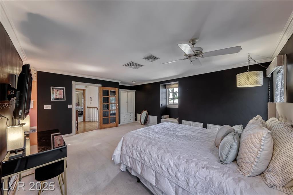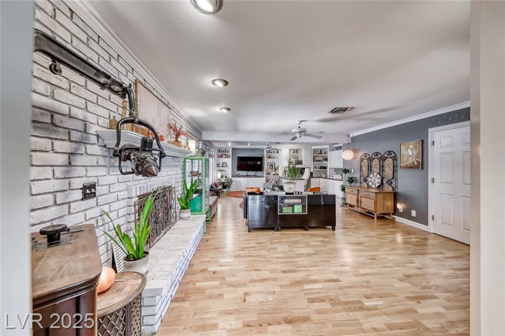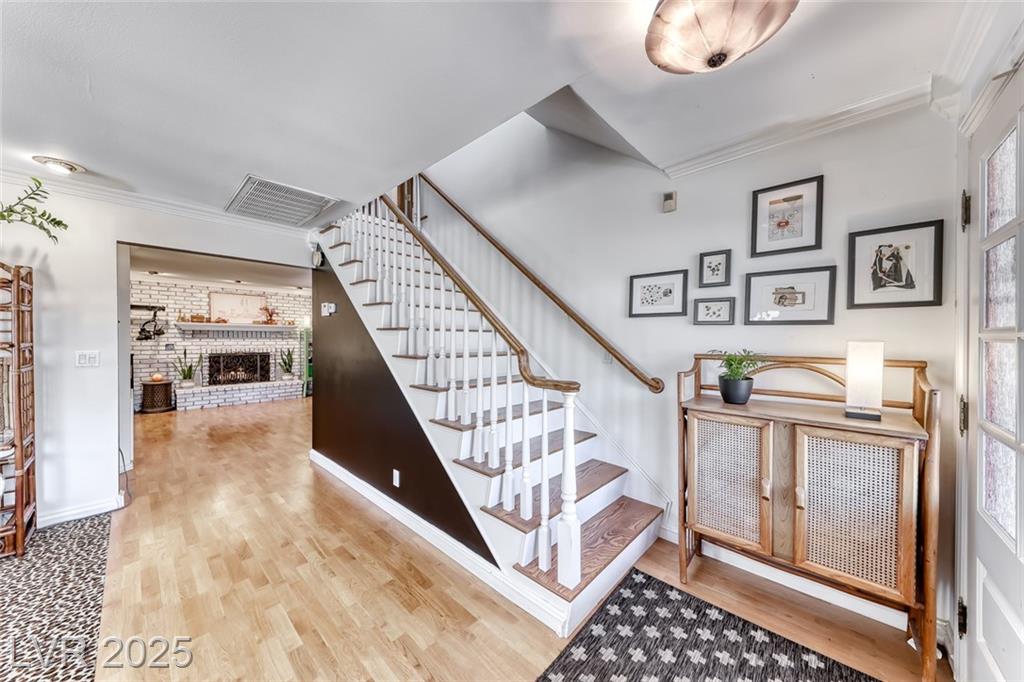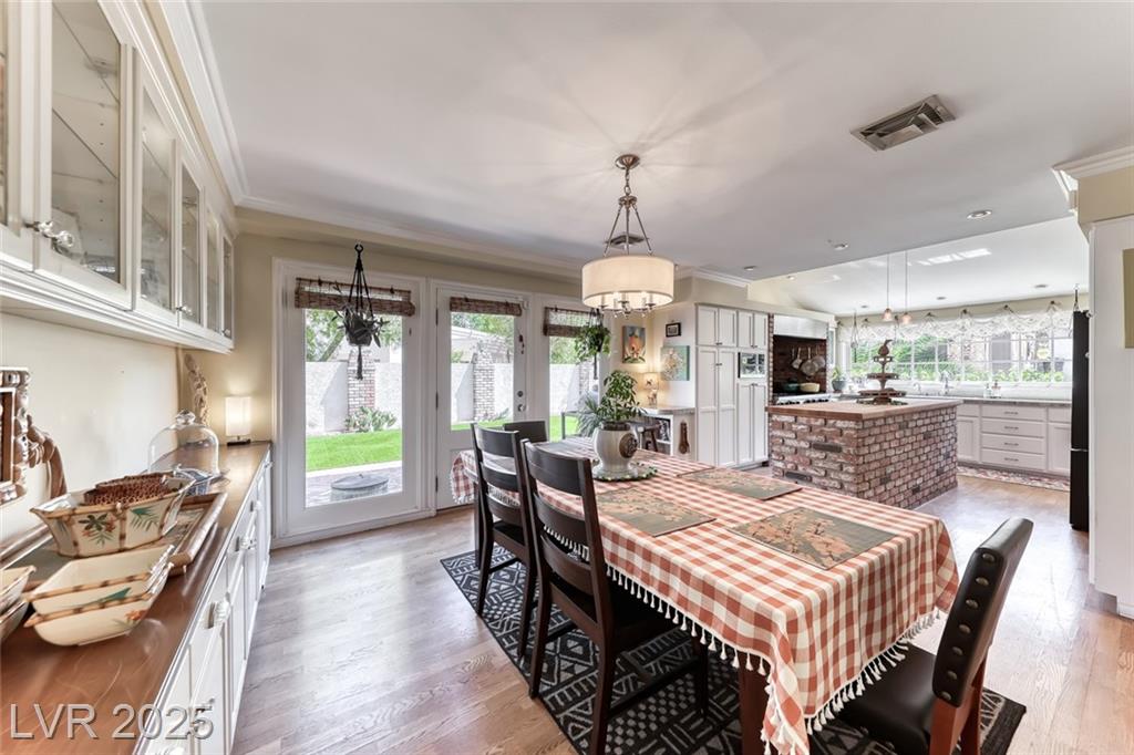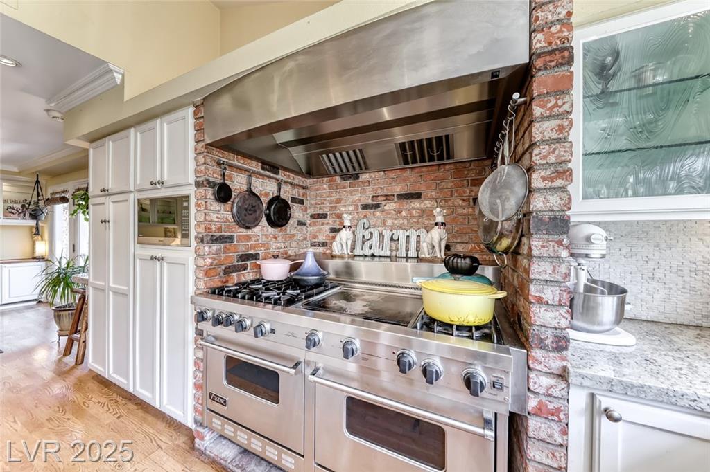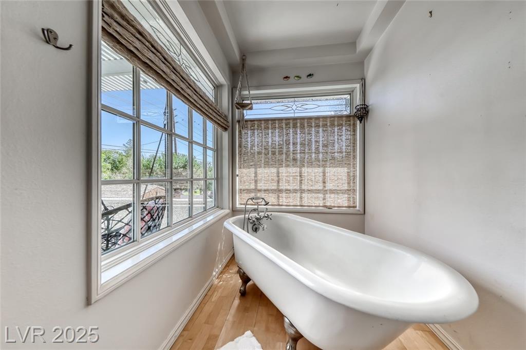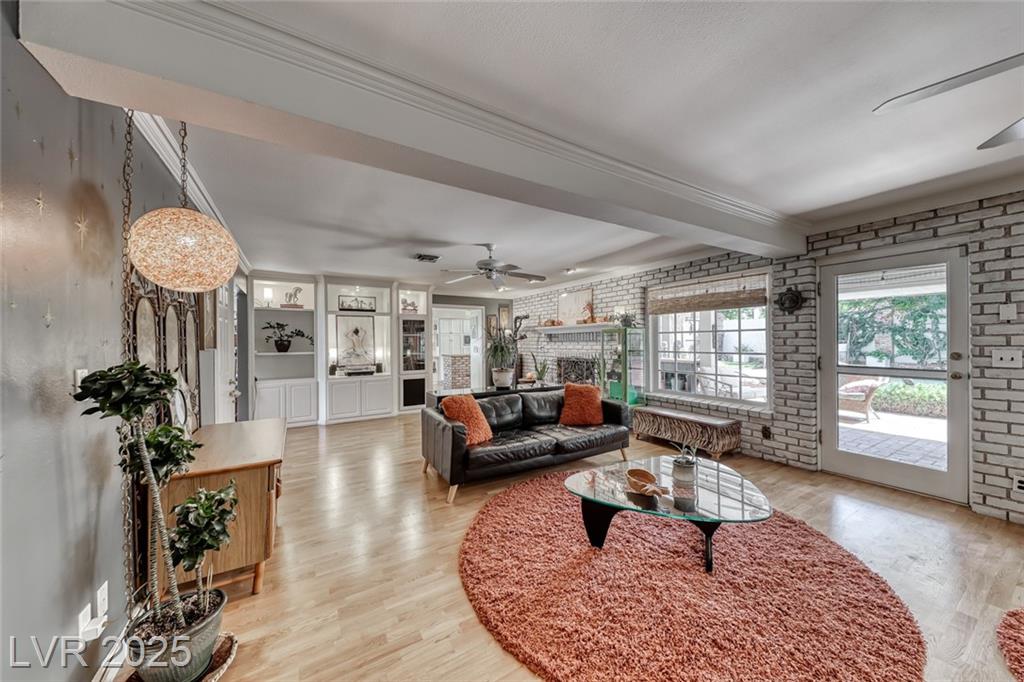 Vintage Cape Cod charm meets Las Vegas living! This 2,679 sq. ft. home blends timeless character with modern comfort. Two spacious primary suites feature spa-like bathrooms and a private balcony—perfect for morning coffee or evening sunsets. The chef’s kitchen boasts a commercial-grade stove/oven and large brick island with butcher block counter, ideal for culinary adventures. The huge family room invites gatherings with its cozy wood-burning fireplace, built-in bookcases, convenient desk, and nearby half bath. Step outside to your own private resort with a sparkling pool, an expansive covered patio for entertaining, and a 10x14 tough shed transformed into a tiki bar for year-round fun. There is an outside area perfect for furry friends at one end, and on the opposite end of the home an area for rv parking and toys. There are roof mounted solar electric panels for energy efficiency! A rare find offering personality, versatility, and endless possibilities in the heart of Las Vegas!