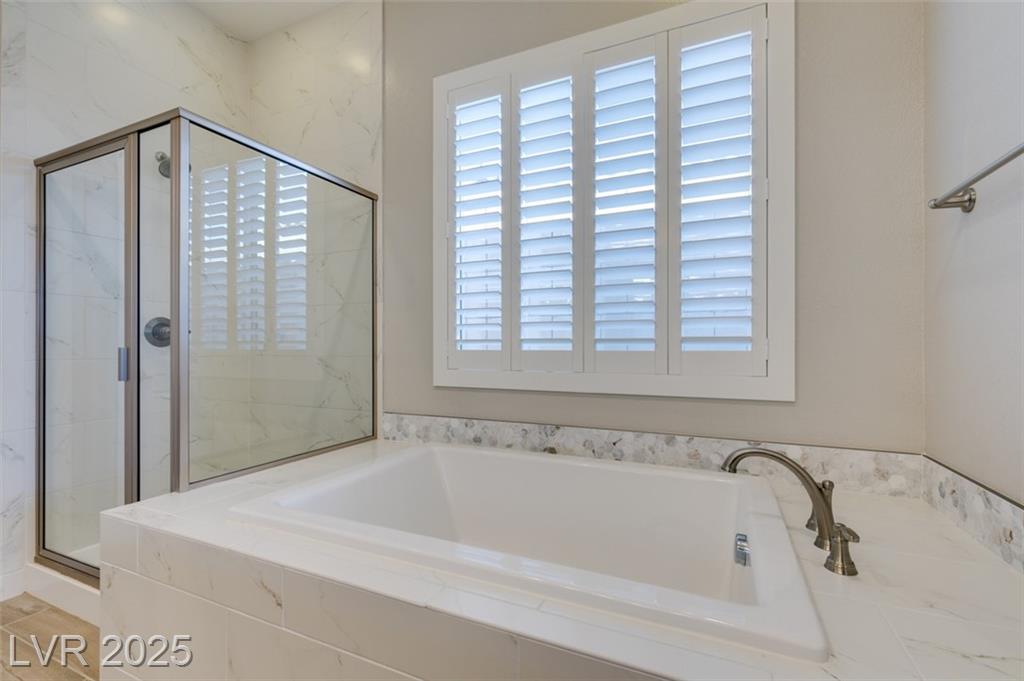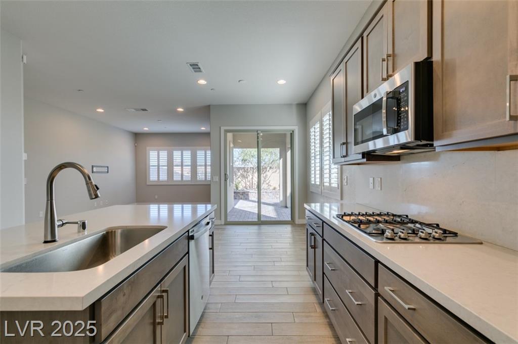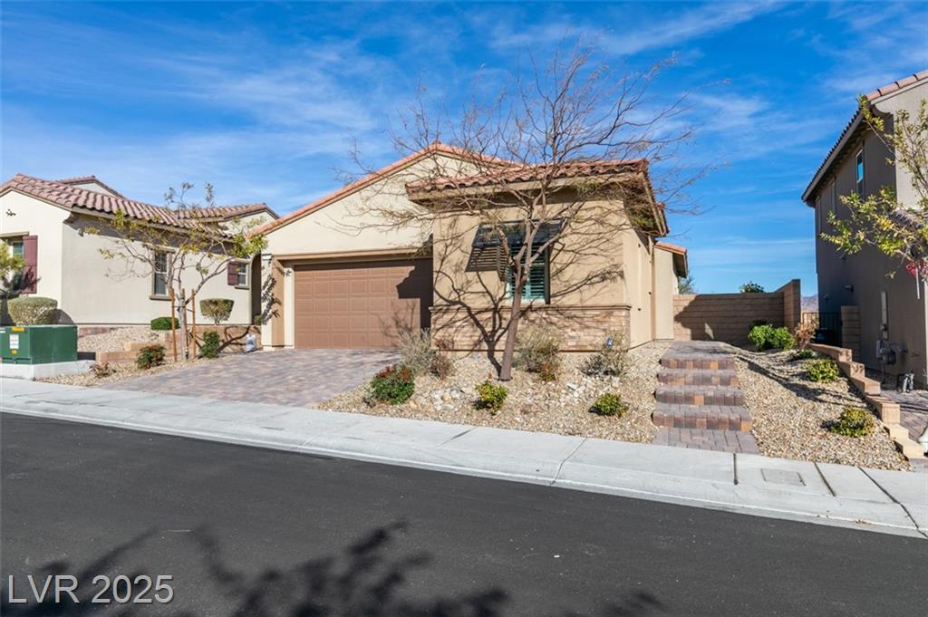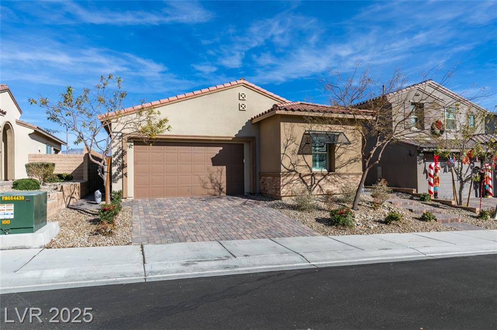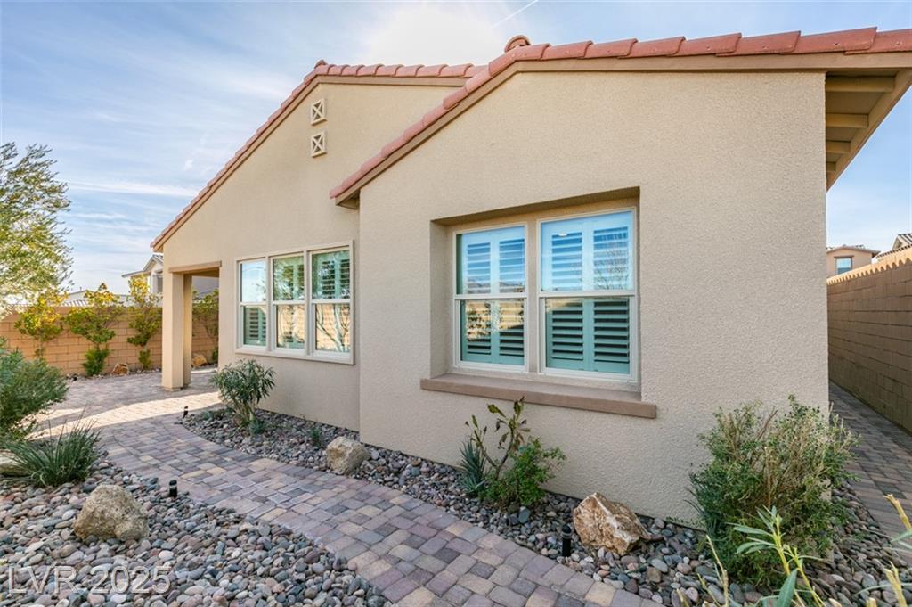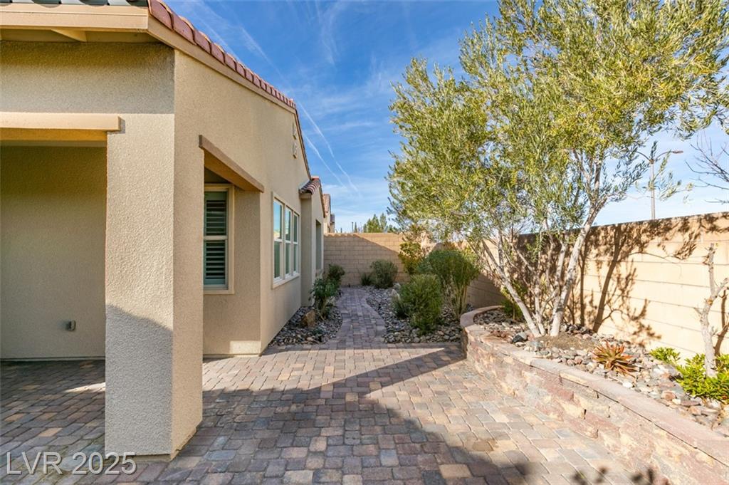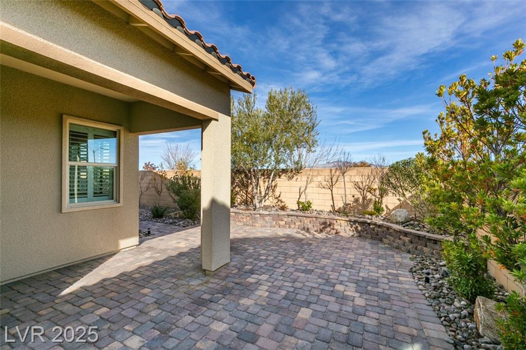 Gorgeous Single-Story Home in Gated Skye Canyon Community! This home boasts an open floor plan with elegant wood-look tile flooring throughout, complemented by neutral two-tone paint and custom shutters for a timeless, modern touch. The chef-inspired kitchen features a large breakfast bar island, quartz countertops, stainless steel appliances, and a spacious walk-in pantry. The private master suite is thoughtfully separated from the other bedrooms and includes a double vanity, walk-in shower, garden tub, and an expansive walk-in closet. A dedicated oversized laundry room provides ample storage space. Outside, enjoy the extensive use of pavers, which create a charming pathway around the home, a quaint covered patio perfect for relaxation, and a raised flower bed for added charm. Situated near Skye Canyon Park, this community offers exceptional amenities, including a Coffee House, a swimming pool, a fitness center, and a variety of community activities and gathering spaces.