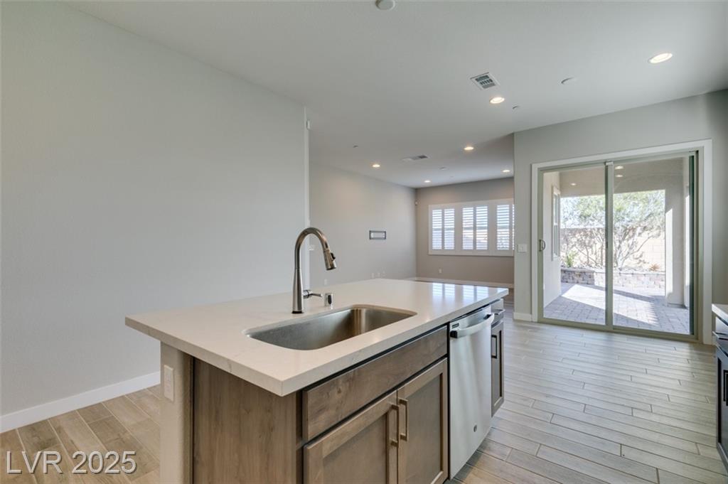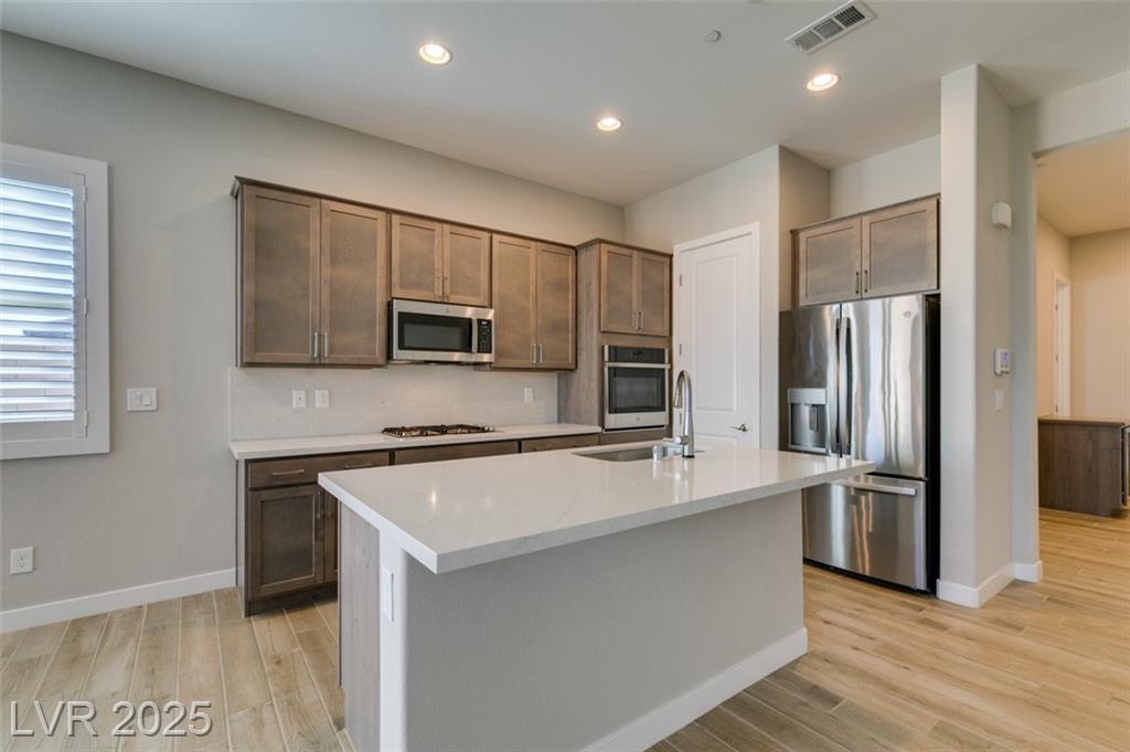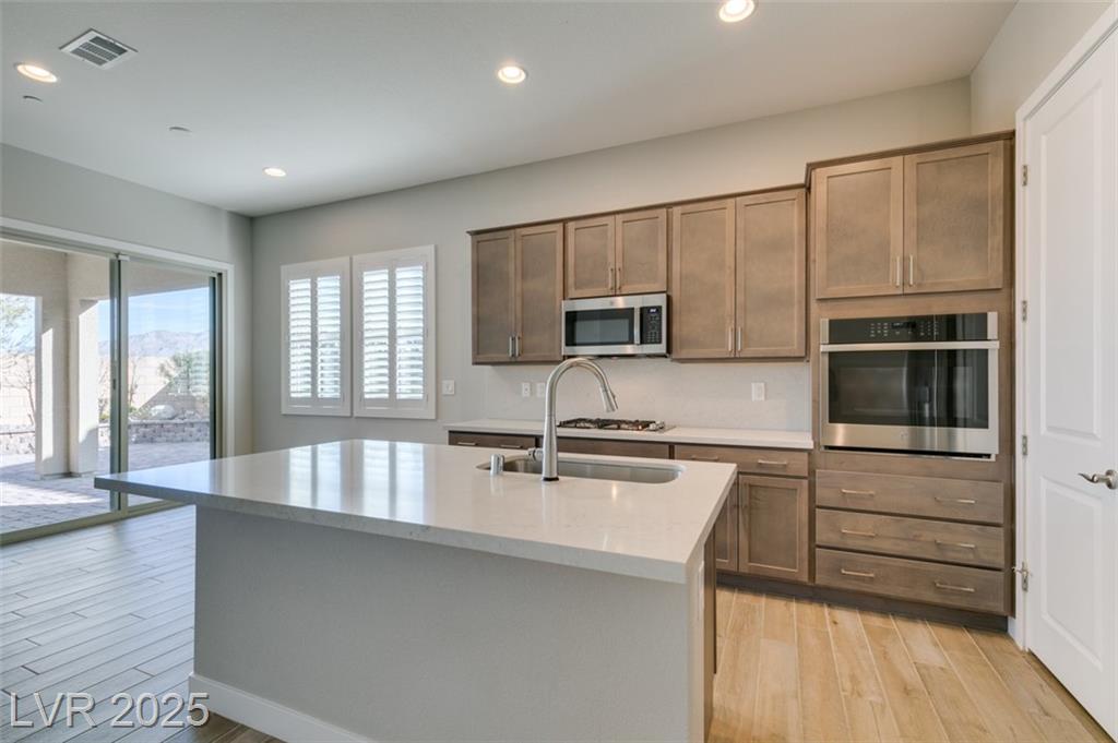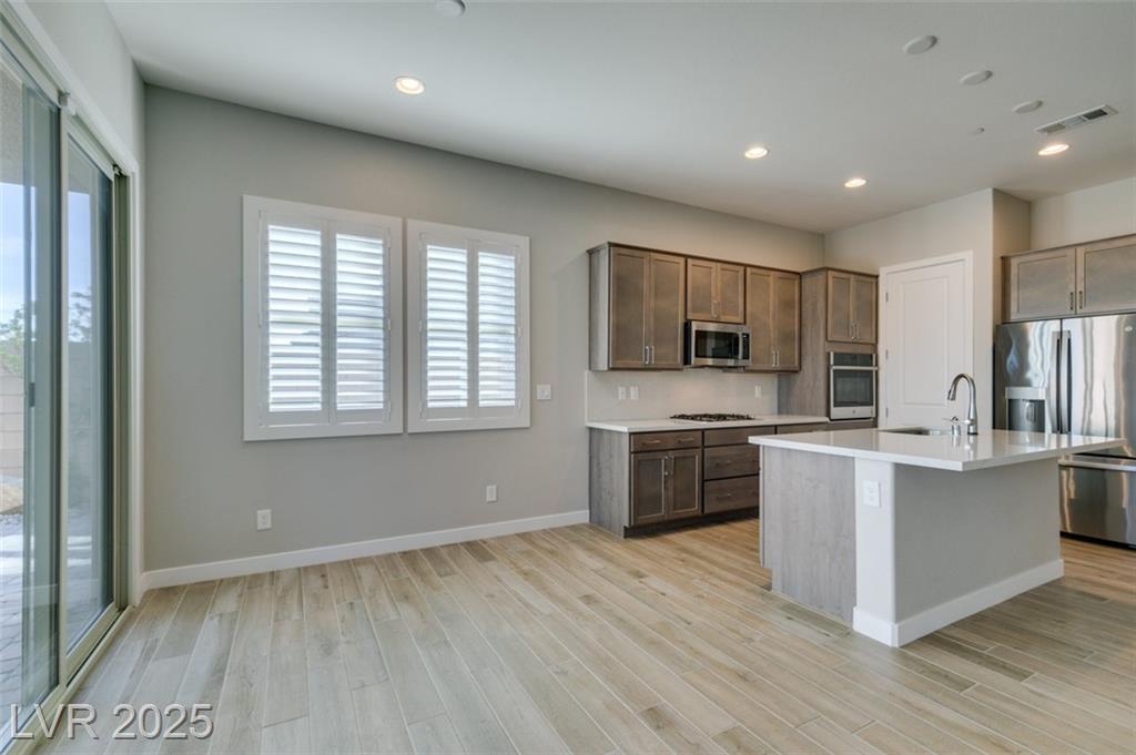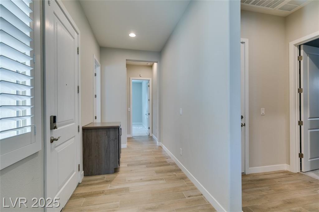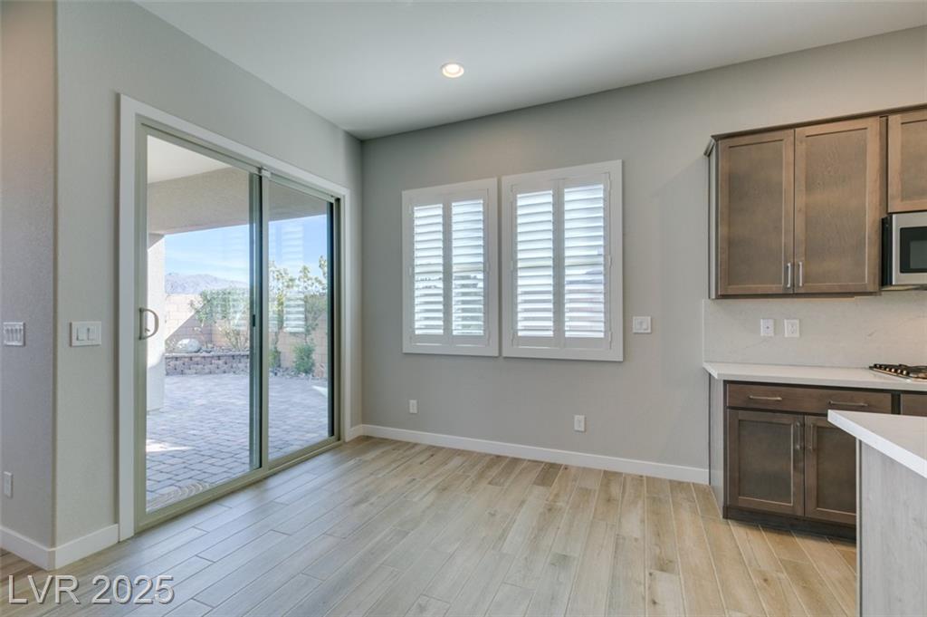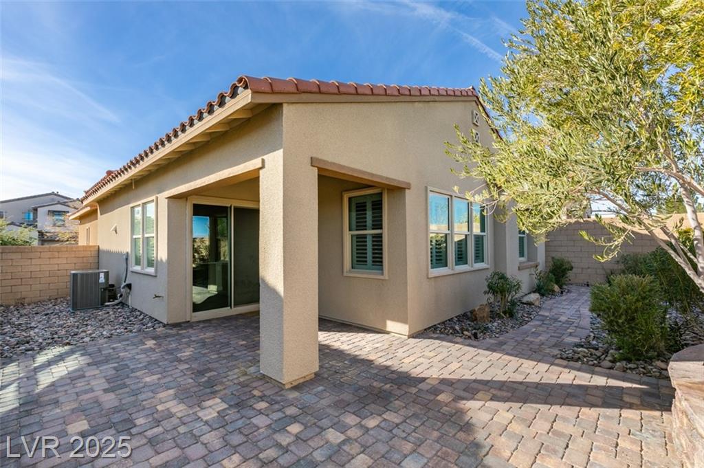 Gorgeous Single-Story Home in Gated Skye Canyon Community! This home boasts an open floor plan with elegant wood-look tile flooring throughout, complemented by neutral two-tone paint and custom shutters for a timeless, modern touch. The chef-inspired kitchen features a large breakfast bar island, quartz countertops, stainless steel appliances, and a spacious walk-in pantry. The private master suite is thoughtfully separated from the other bedrooms and includes a double vanity, walk-in shower, garden tub, and an expansive walk-in closet. A dedicated oversized laundry room provides ample storage space. Outside, enjoy the extensive use of pavers, which create a charming pathway around the home, a quaint covered patio perfect for relaxation, and a raised flower bed for added charm. Situated near Skye Canyon Park, this community offers exceptional amenities, including a Coffee House, a swimming pool, a fitness center, and a variety of community activities and gathering spaces.