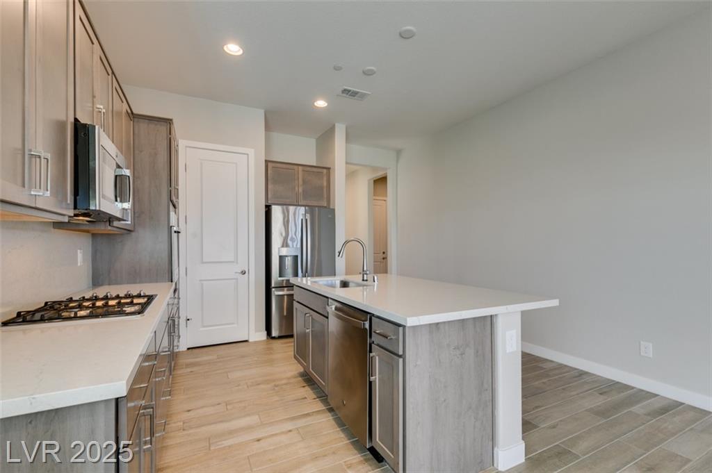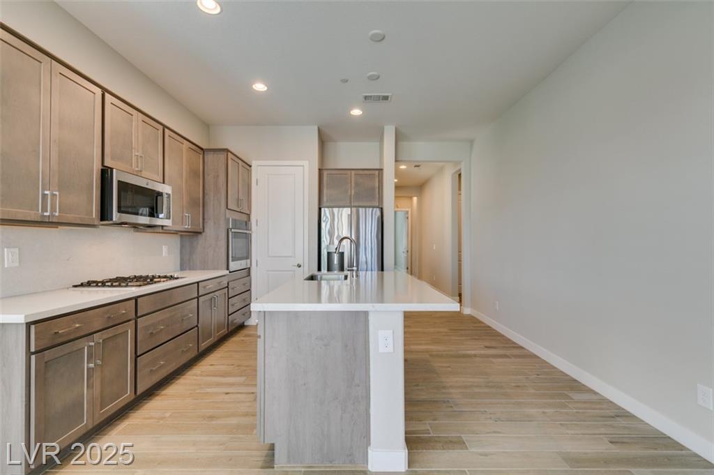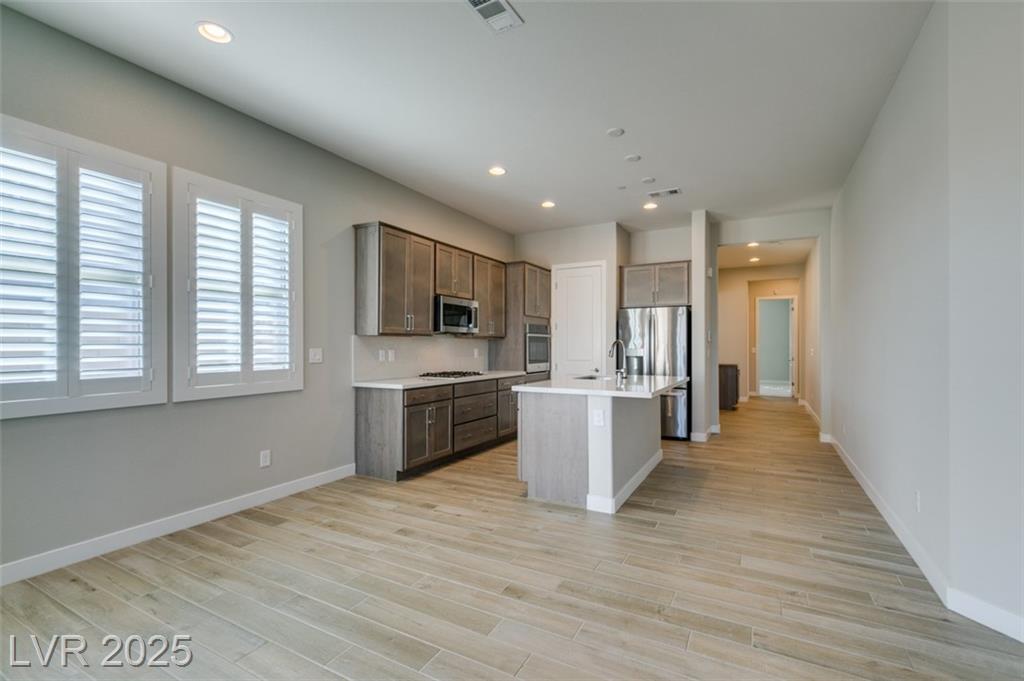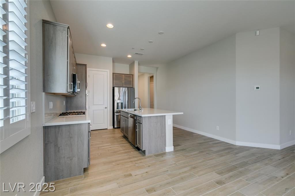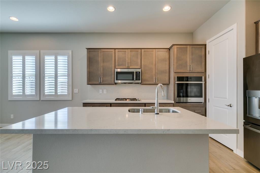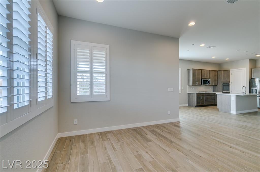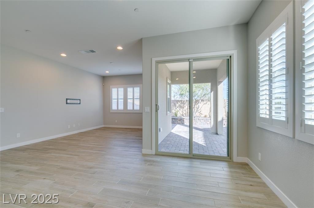 Gorgeous Single-Story Home in Gated Skye Canyon Community! This home boasts an open floor plan with elegant wood-look tile flooring throughout, complemented by neutral two-tone paint and custom shutters for a timeless, modern touch. The chef-inspired kitchen features a large breakfast bar island, quartz countertops, stainless steel appliances, and a spacious walk-in pantry. The private master suite is thoughtfully separated from the other bedrooms and includes a double vanity, walk-in shower, garden tub, and an expansive walk-in closet. A dedicated oversized laundry room provides ample storage space. Outside, enjoy the extensive use of pavers, which create a charming pathway around the home, a quaint covered patio perfect for relaxation, and a raised flower bed for added charm. Situated near Skye Canyon Park, this community offers exceptional amenities, including a Coffee House, a swimming pool, a fitness center, and a variety of community activities and gathering spaces.