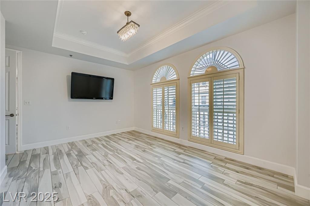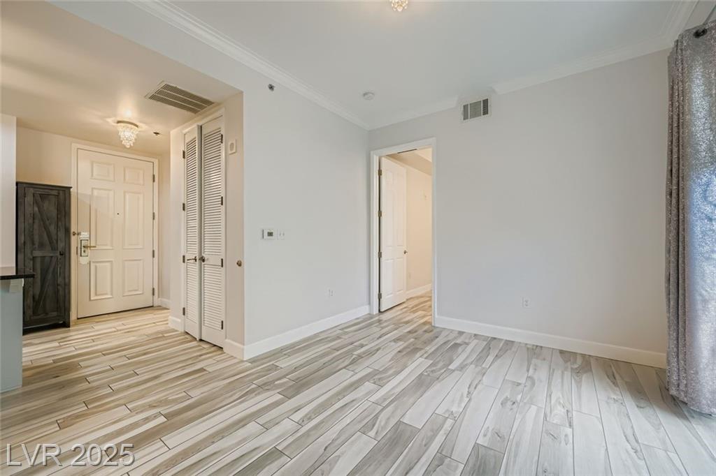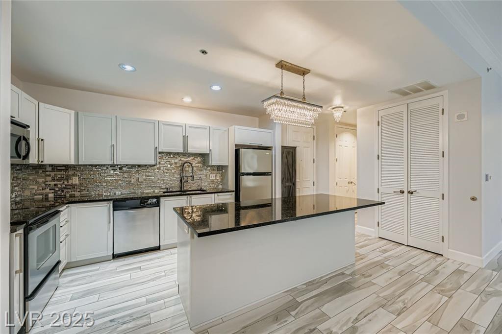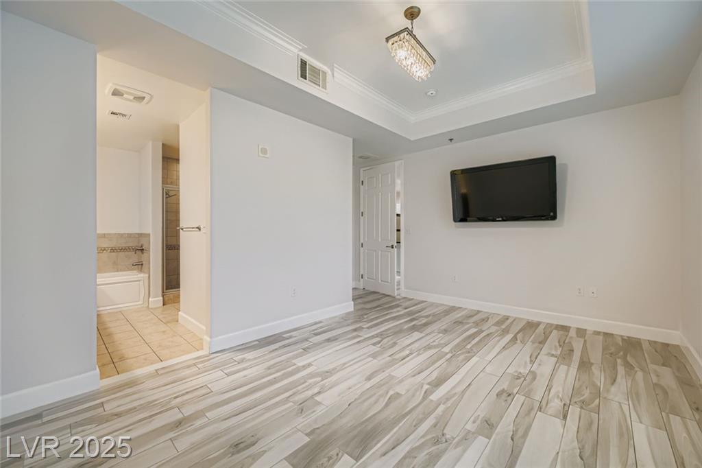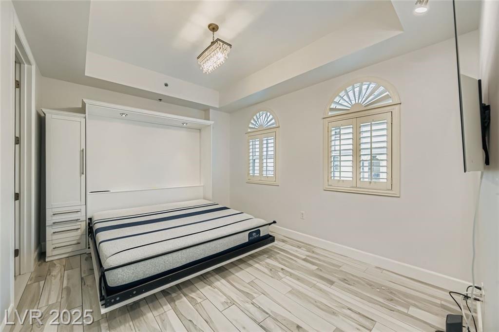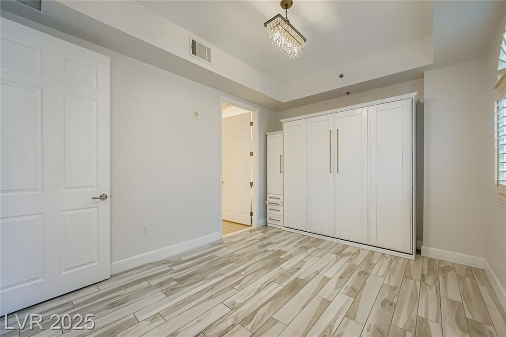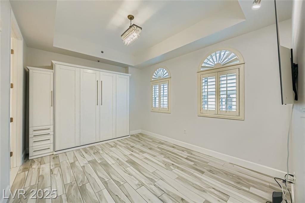 Fantastic move in ready 2 bedroom condo - 1196 SF @ Boca Raton conveniently located on the south end of the Las Vegas Strip. Enjoy updated kitchen w/ island, stainless steel appliances & modern wood-look porcelain tiles throughout. 2 full primary bedrooms w/ walk-in customized closets. 2 spacious primary bathrooms. One of the primary bedrooms has built in king size Wilding Murphy bed allowing for office by day and bedroom at night. LED light fixtures & Plantation shutters throughout. HVAC installed in 2022 w/ air purifying system. Wash/dryer combo in closet. 24/7 guard gated entry, fitness center, pool with cabanas, 2 spas, steam & massage room, BBQ areas, dog park, computer/theater rooms & conceirge services. Near I-15 & 215 freeways, shopping less than 4 minutes away and close to airport. 3 mounted 50" plus Televisions, located in the living room & both primary bedrooms, included in the sale of the property. Condo was being rented at $1800 monthly - great investment opportunity.