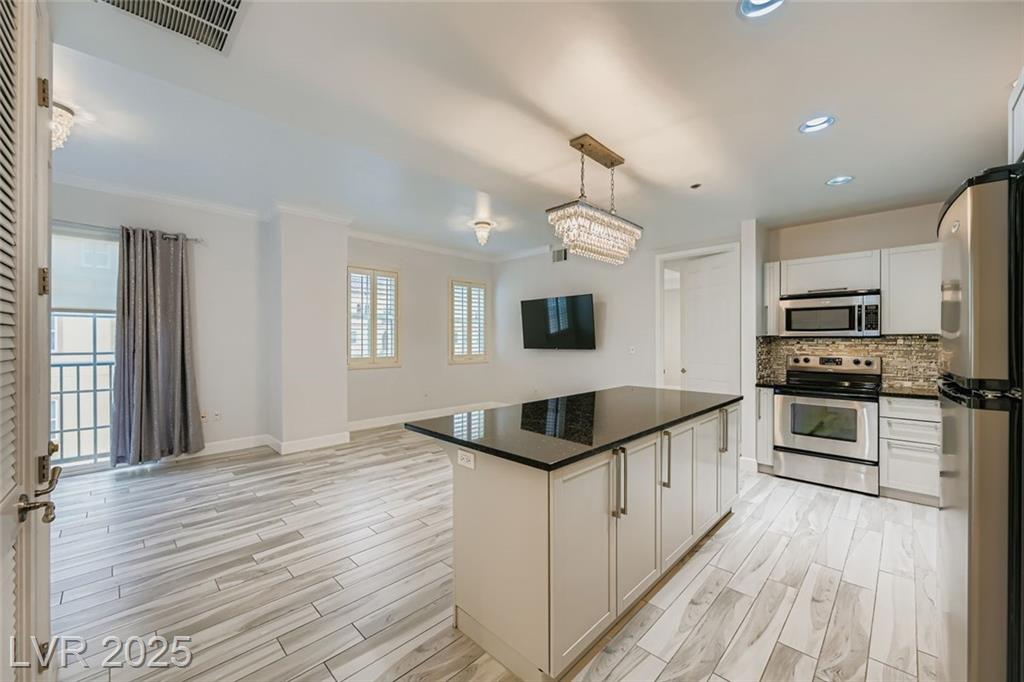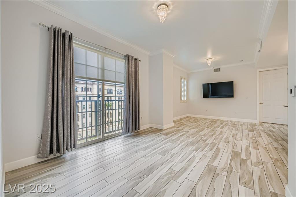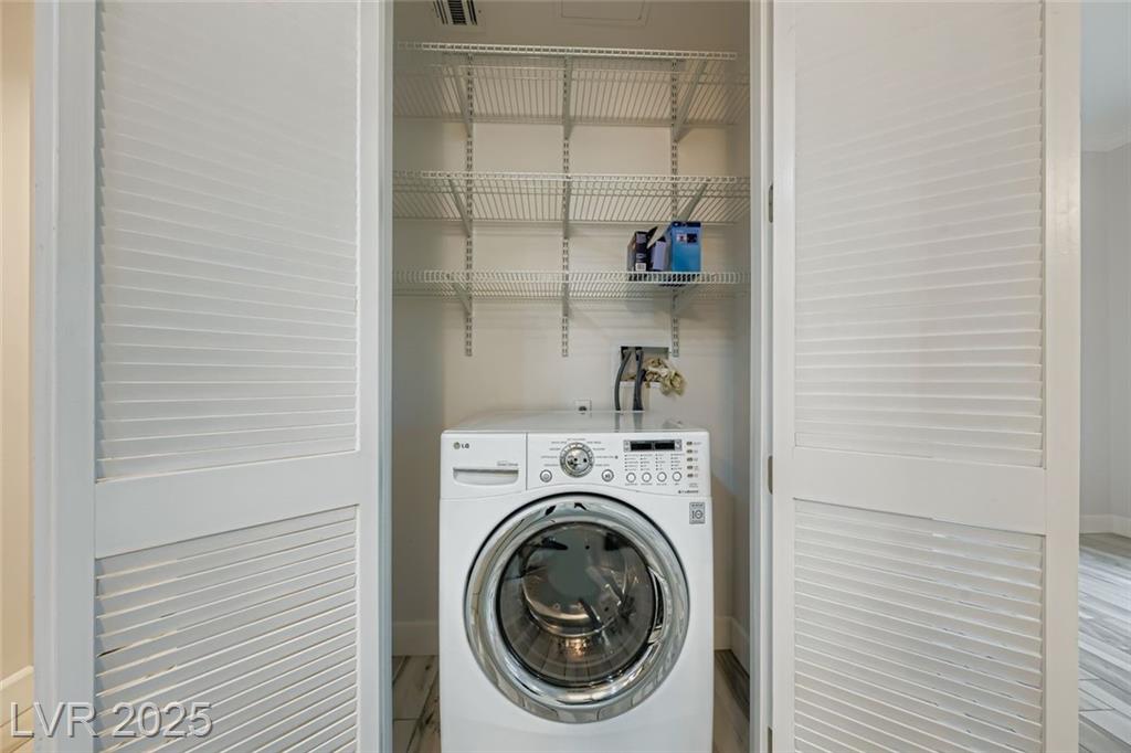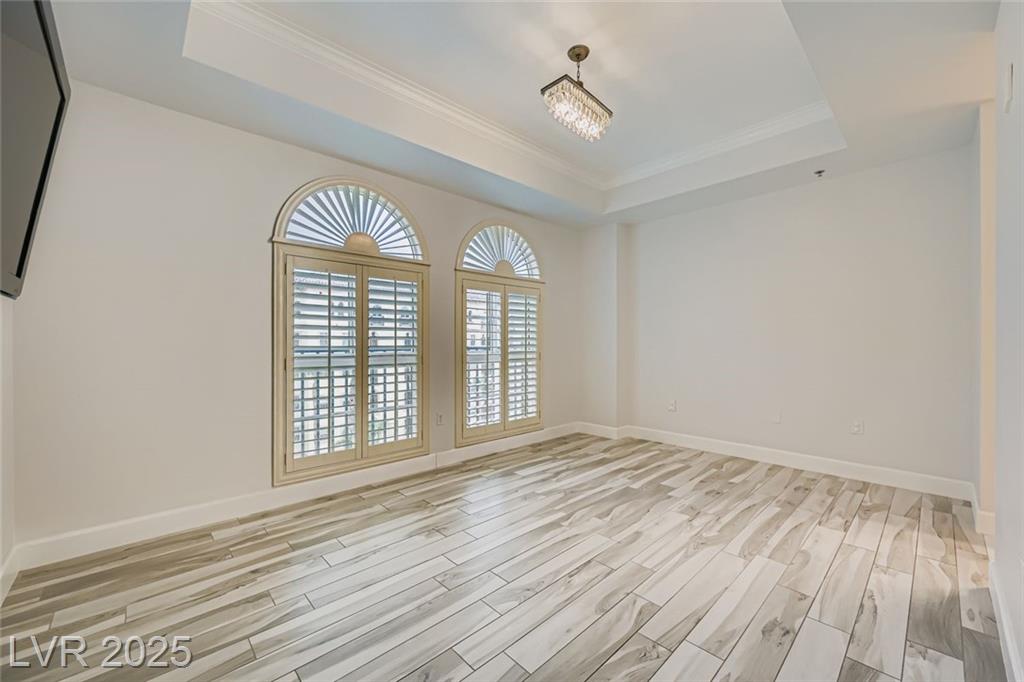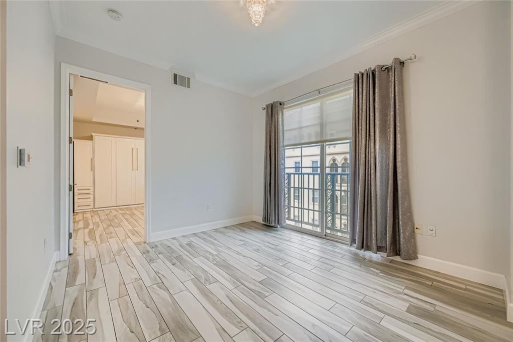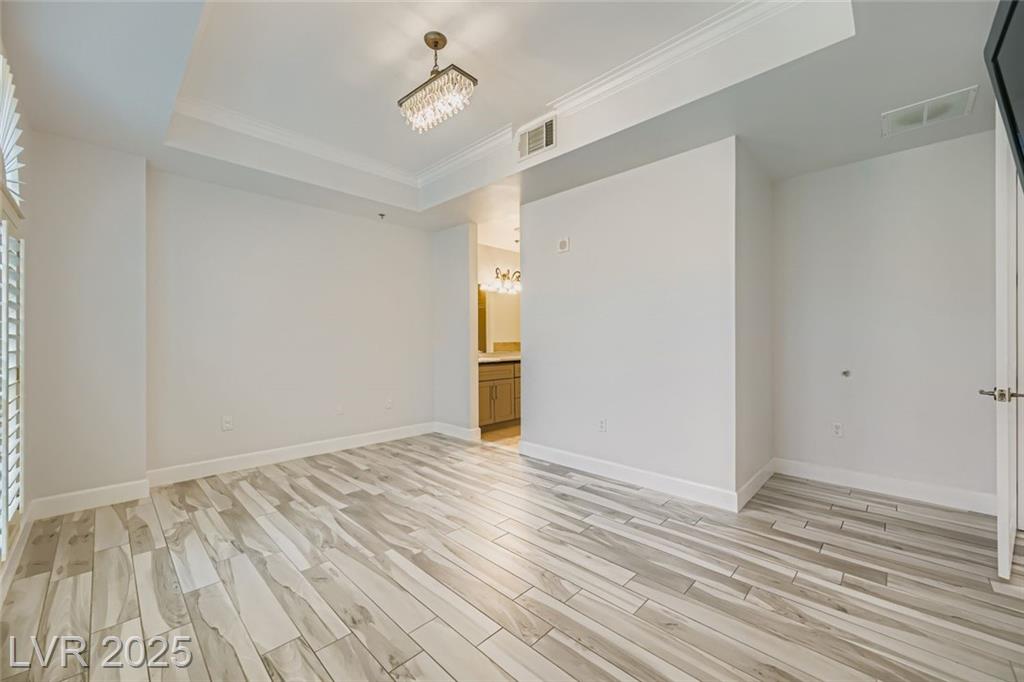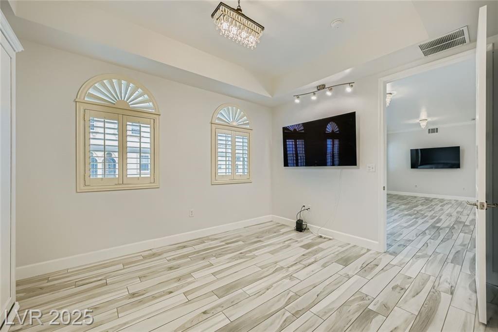 Fantastic move in ready 2 bedroom condo - 1196 SF @ Boca Raton conveniently located on the south end of the Las Vegas Strip. Enjoy updated kitchen w/ island, stainless steel appliances & modern wood-look porcelain tiles throughout. 2 full primary bedrooms w/ walk-in customized closets. 2 spacious primary bathrooms. One of the primary bedrooms has built in king size Wilding Murphy bed allowing for office by day and bedroom at night. LED light fixtures & Plantation shutters throughout. HVAC installed in 2022 w/ air purifying system. Wash/dryer combo in closet. 24/7 guard gated entry, fitness center, pool with cabanas, 2 spas, steam & massage room, BBQ areas, dog park, computer/theater rooms & conceirge services. Near I-15 & 215 freeways, shopping less than 4 minutes away and close to airport. 3 mounted 50" plus Televisions, located in the living room & both primary bedrooms, included in the sale of the property. Condo was being rented at $1800 monthly - great investment opportunity.