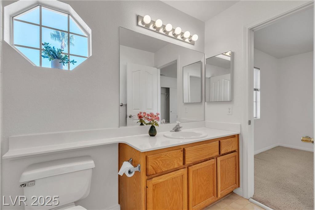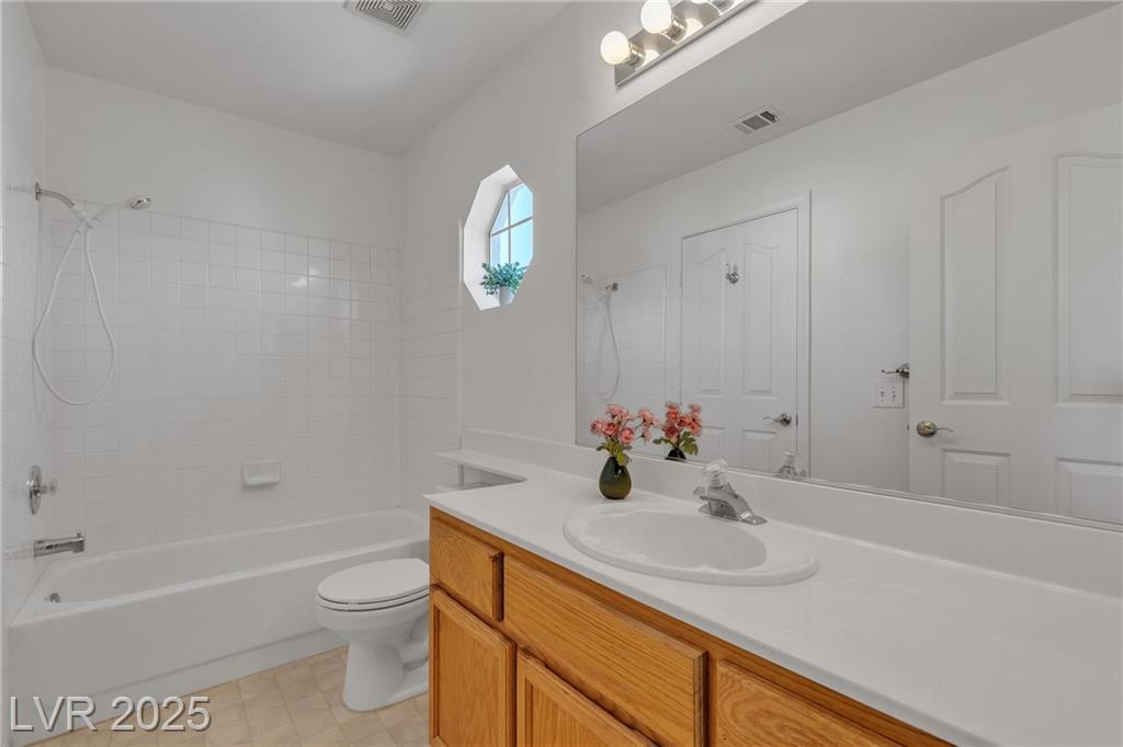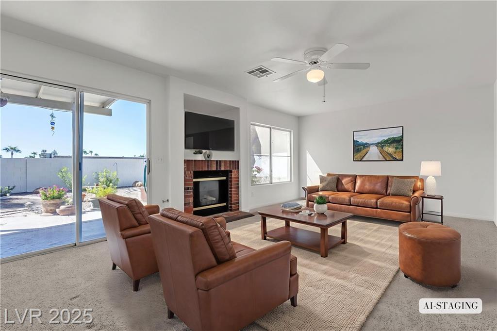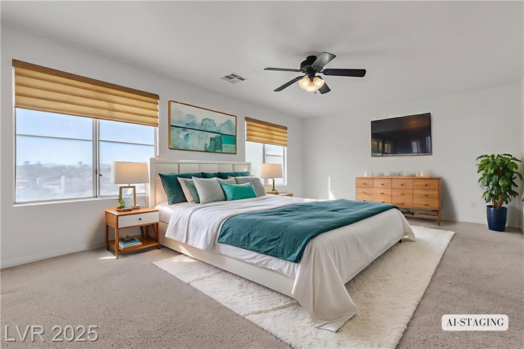 Bright and inviting 4-bed, 3-bath home (2,213 sf) in desirable Cobblestone/Green Valley community. Enjoy mountain views to the south, a pool-size backyard, and gated RV parking. The open floor plan features formal living and dining rooms plus a separate family room with gas fireplace that opens to a covered patio and built-in BBQ—perfect for entertaining. The kitchen offers an island, breakfast bar, and tile counters. Downstairs bedroom and full bath provide flexibility for guests or multigenerational living. Upstairs, the spacious primary suite features a walk-in closet, dual sinks, and a separate tub and shower. Two additional bedrooms share a full bath. Additional features include a tile roof, 2-car garage, shed, and all appliances (refrigerator/washer/dryer) included. Low HOA—approx. $125/qtr. Close to parks, dining, shopping, and easy I-215 access via Windmill. Video tour available!