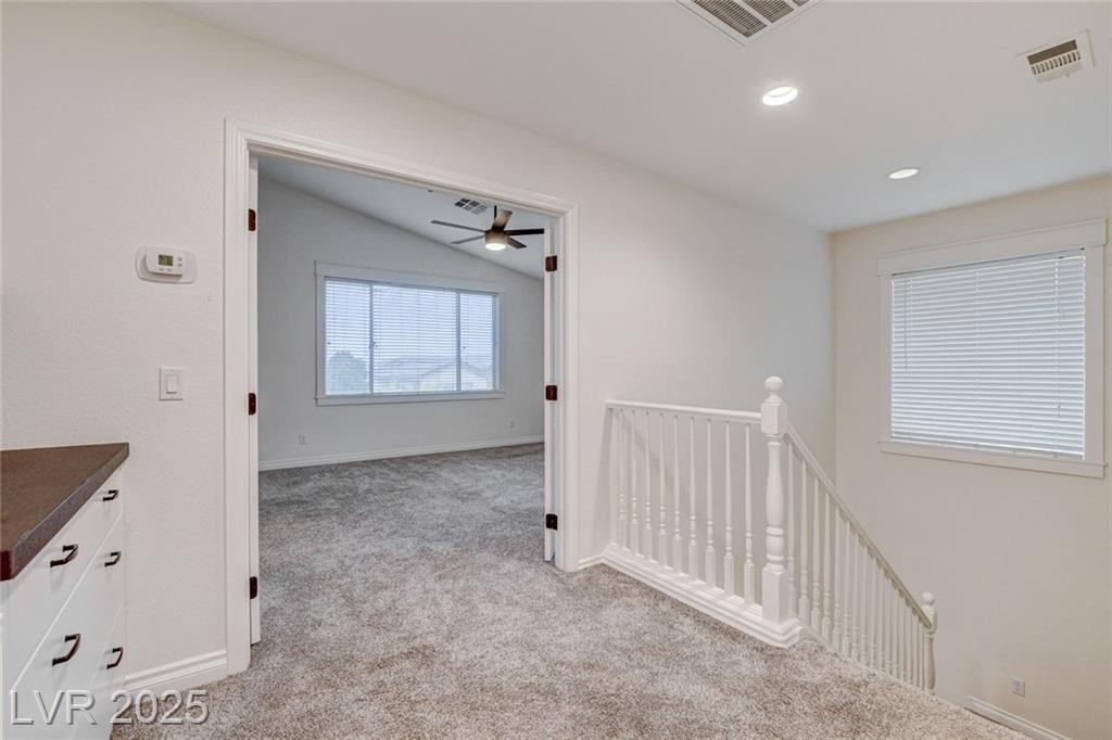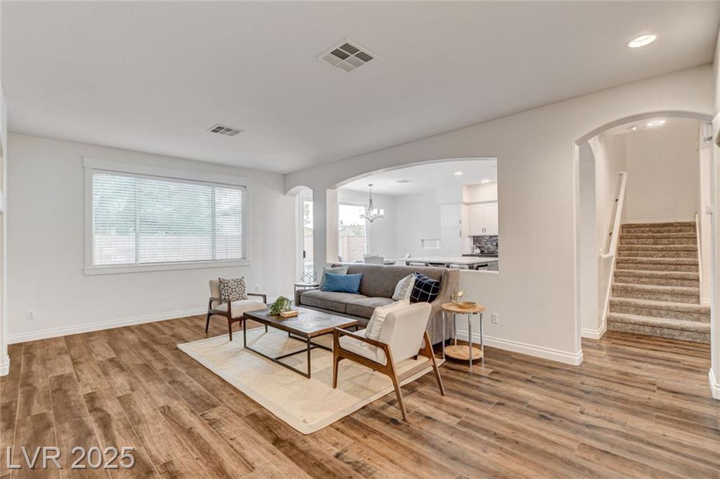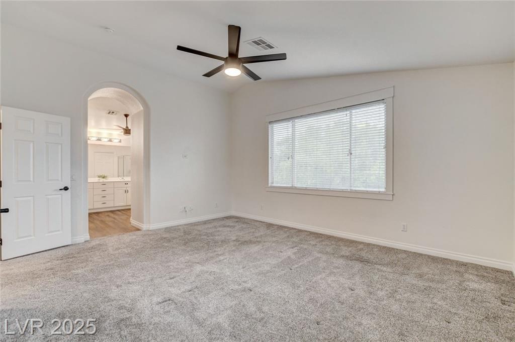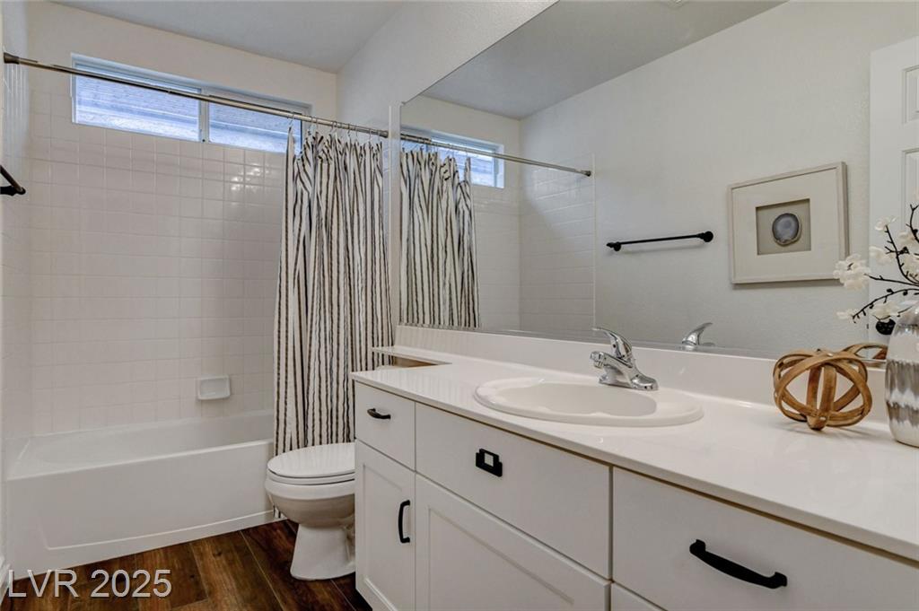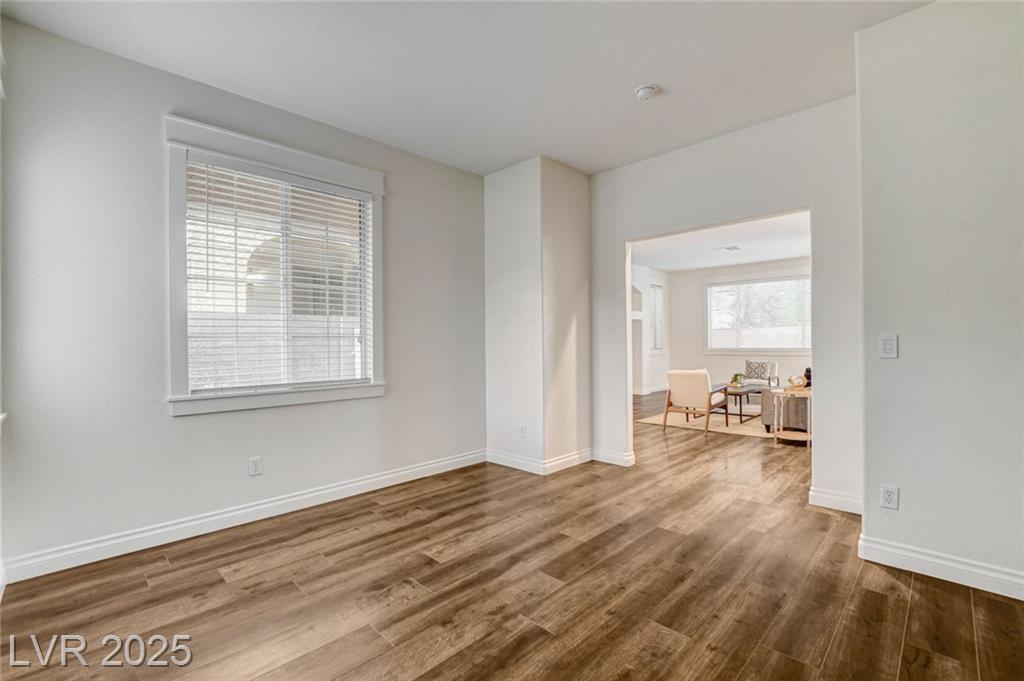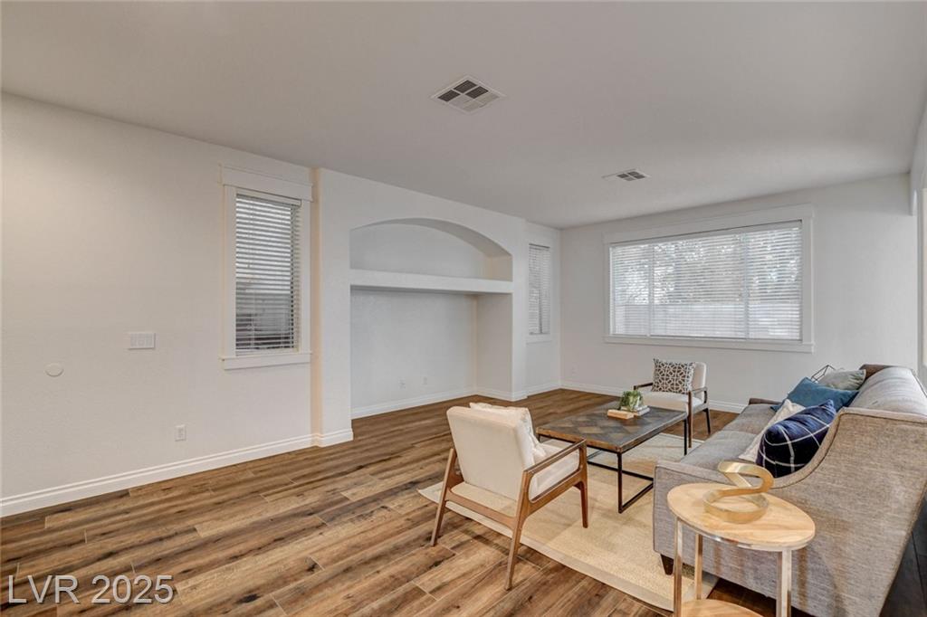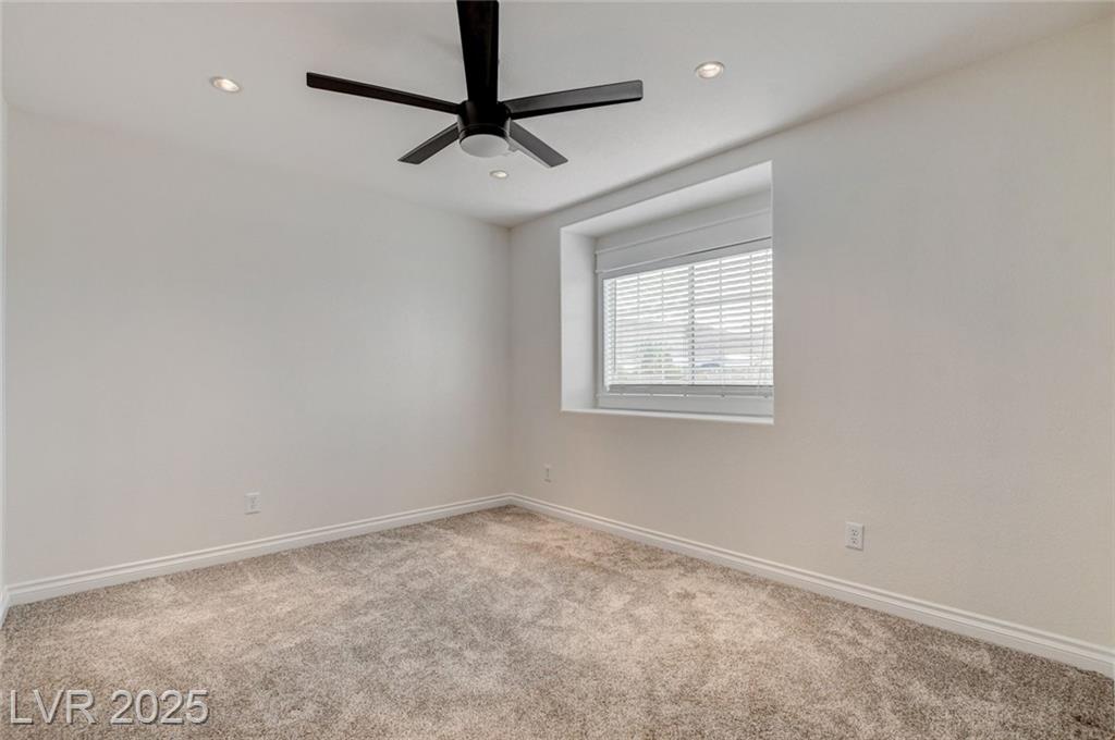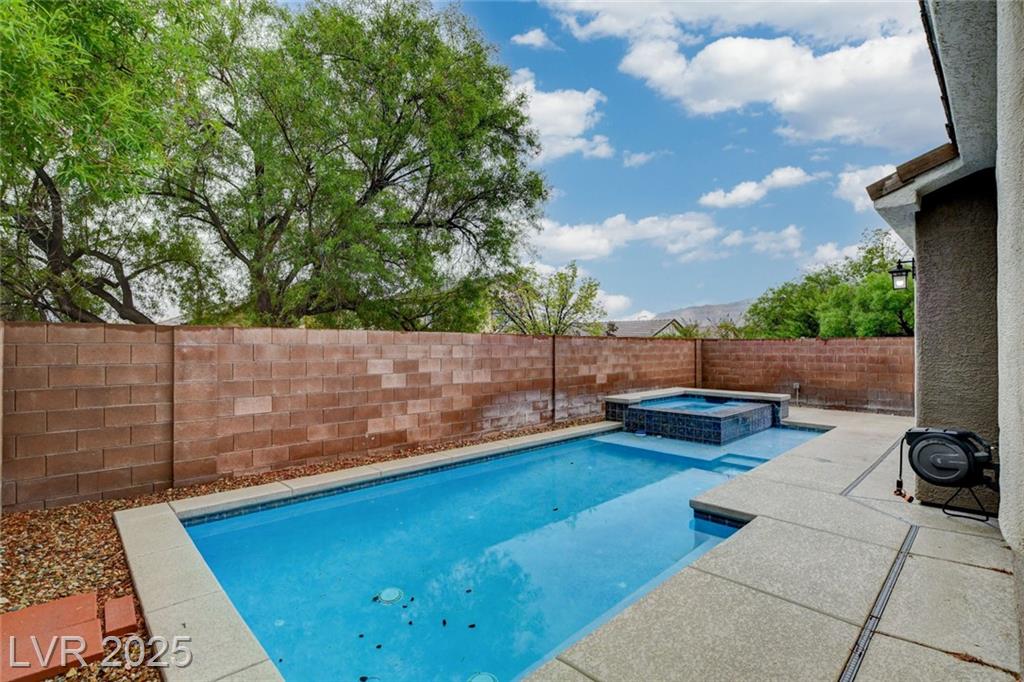 Welcome to this beautifully refreshed 3 bed + Den, home in the heart of Summerlin South! With fresh interior paint & neutral flooring, the inviting layout creates a warm, move-in ready atmosphere from the moment you step inside. The spacious great room flows seamlessly into the kitchen, which features ample cabinetry, sleek countertops, black stainless steel appliances, and a center island. Upstairs, the primary suite offers a true retreat w/ a walk-in closet & a spa-inspired en suite bathroom showcasing a dual-sink vanity, a walk-in shower, & a separate soaking tub. Step outside & enjoy your own private backyard oasis, complete w/ a sparkling blue pool, waterfall spa, & a turf side yard. Additonal features include watersoftener, closet auto lights & garage zoned AC.