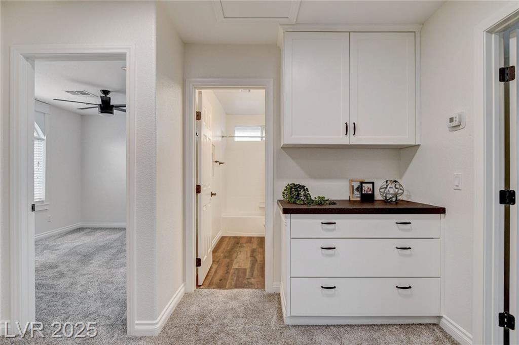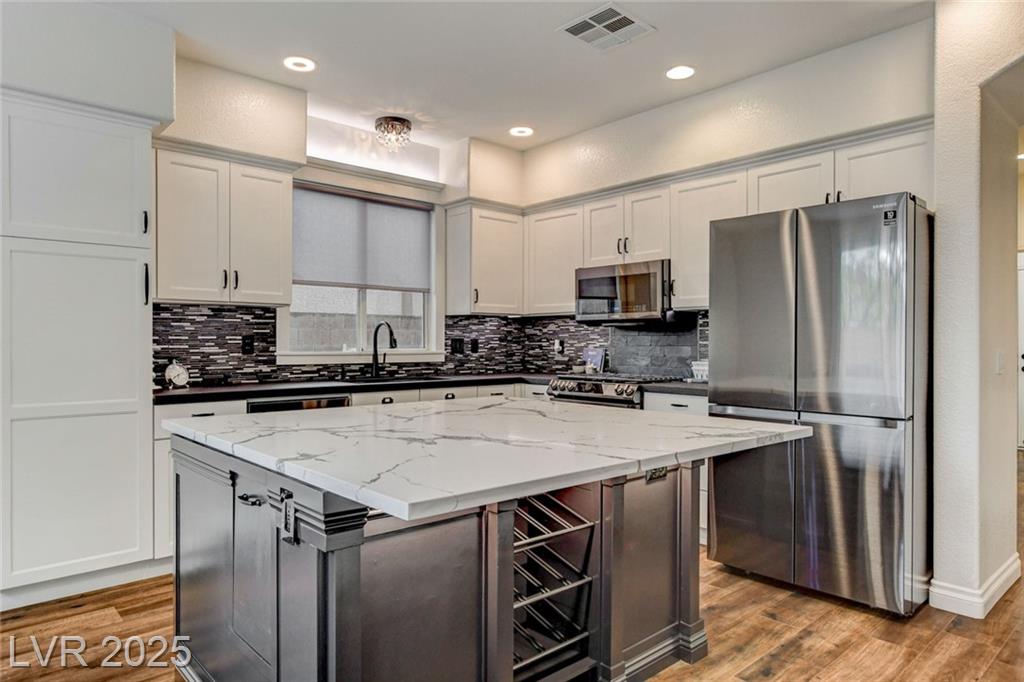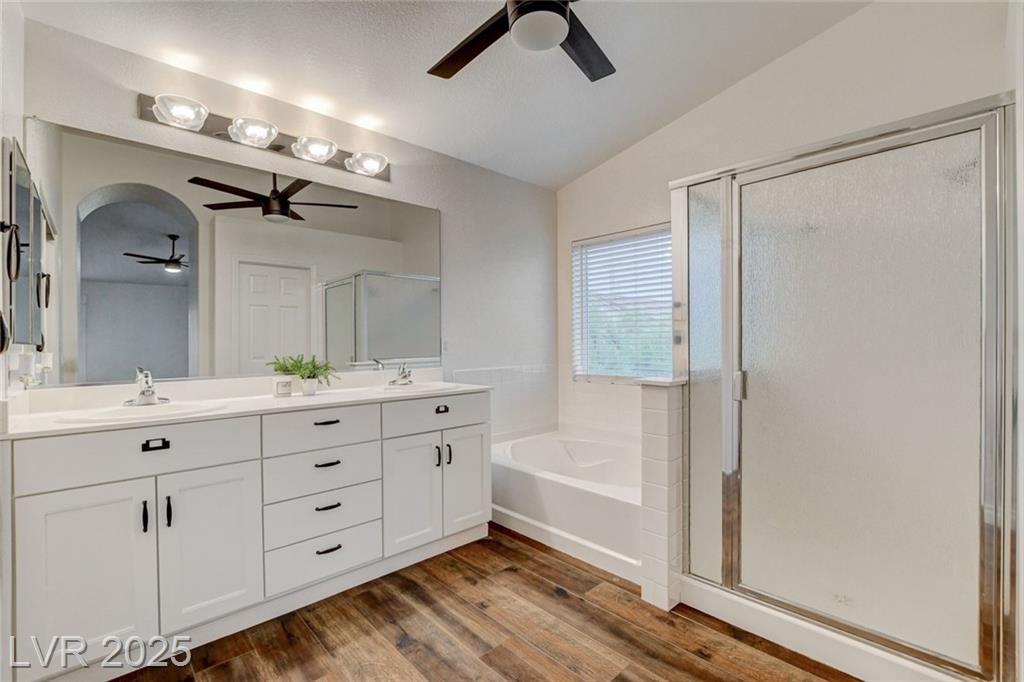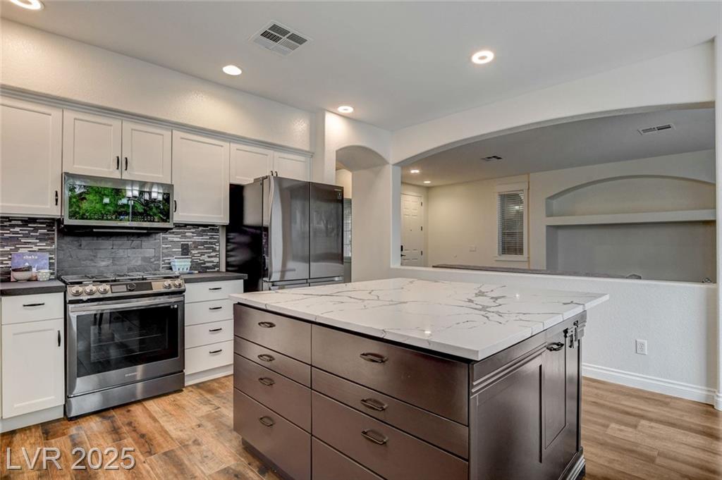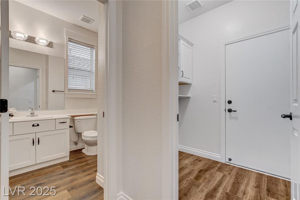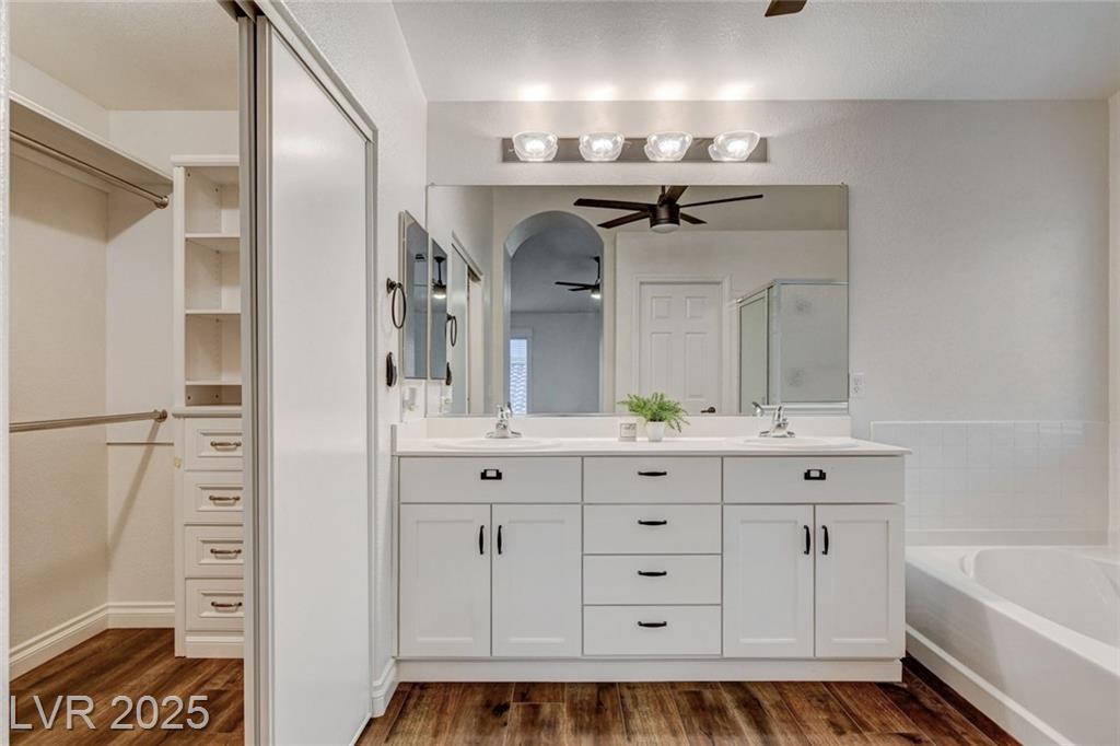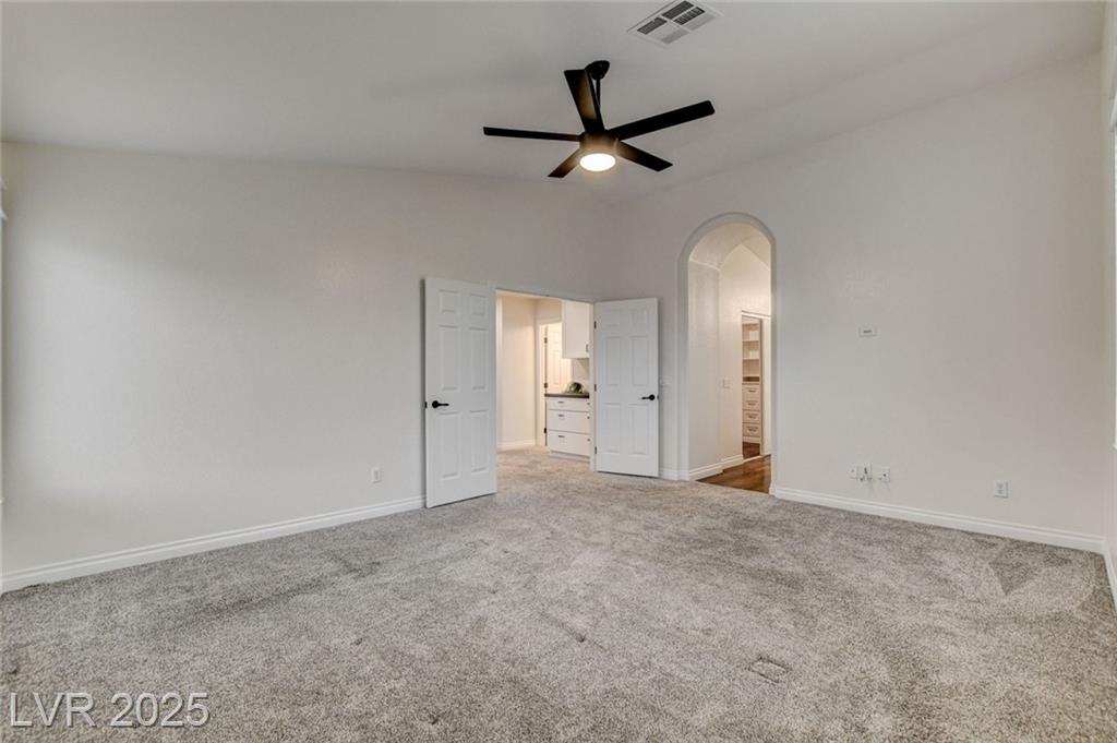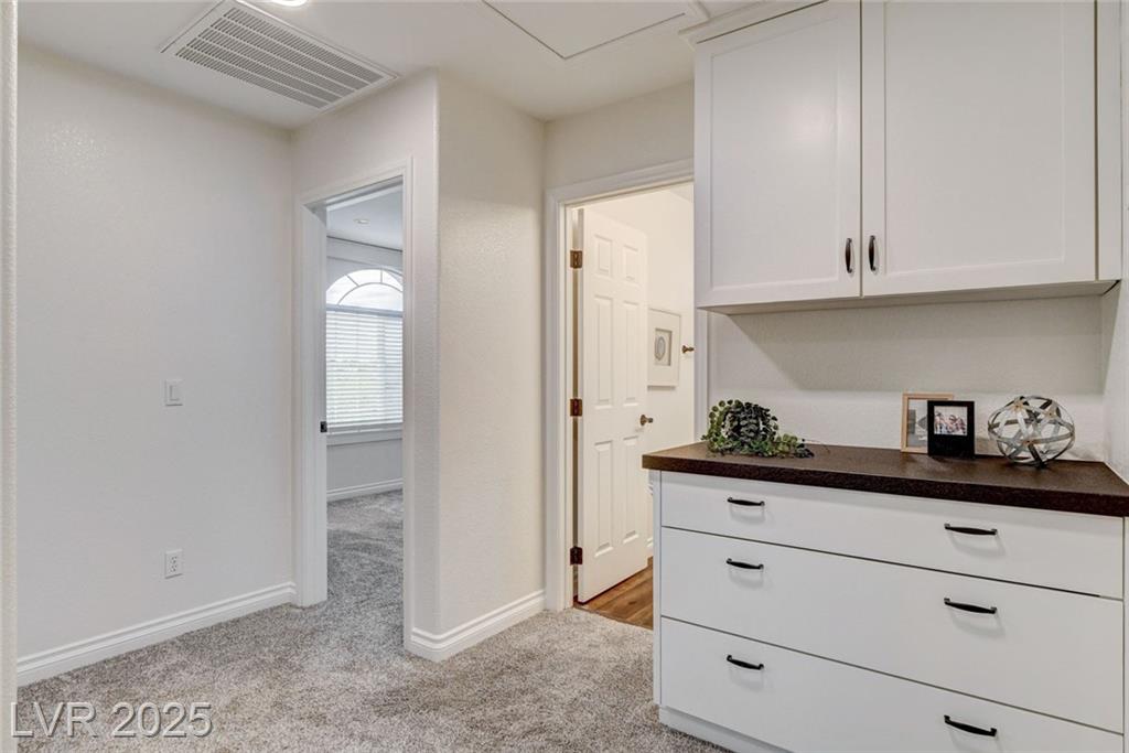 Welcome to this beautifully refreshed 3 bed + Den, home in the heart of Summerlin South! With fresh interior paint & neutral flooring, the inviting layout creates a warm, move-in ready atmosphere from the moment you step inside. The spacious great room flows seamlessly into the kitchen, which features ample cabinetry, sleek countertops, black stainless steel appliances, and a center island. Upstairs, the primary suite offers a true retreat w/ a walk-in closet & a spa-inspired en suite bathroom showcasing a dual-sink vanity, a walk-in shower, & a separate soaking tub. Step outside & enjoy your own private backyard oasis, complete w/ a sparkling blue pool, waterfall spa, & a turf side yard. Additonal features include watersoftener, closet auto lights & garage zoned AC.