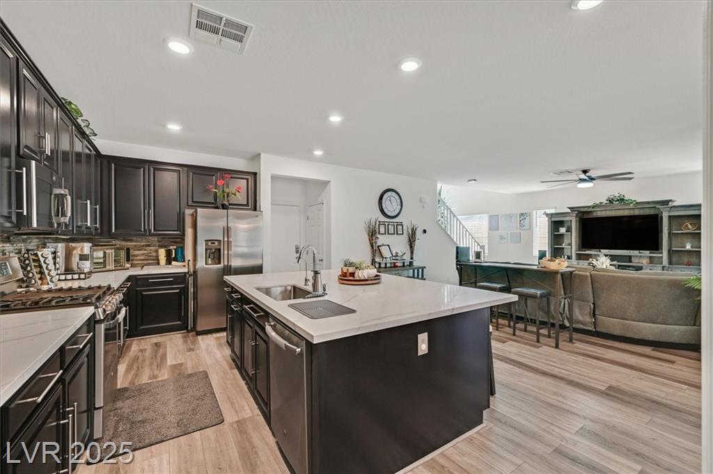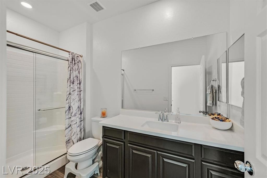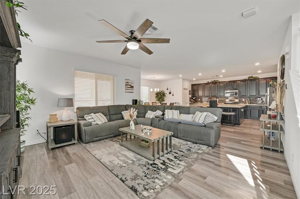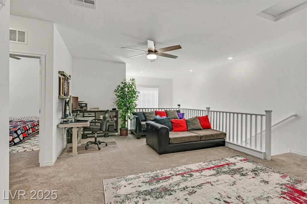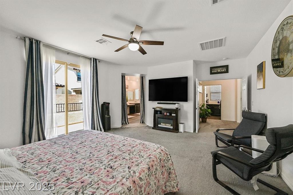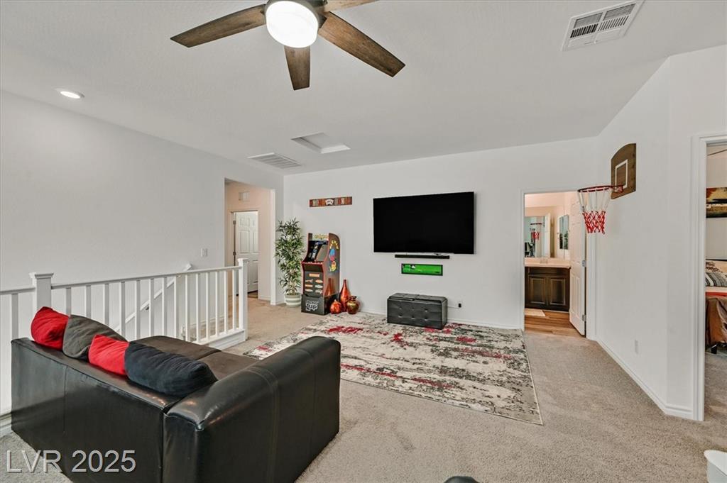 Pride of ownership! Look no further than this desirable corner lot home in gated community located in the heart of Skye Canyon! This home features 4 bedrooms and 3 bathrooms with 1 bedroom located on the first floor! Upon entry you're greeted with soaring ceilings and an abundance of natural light leading you to an open floor plan! The kitchen offers quartz countertops, tile backsplash, stainless appliances, large kitchen island and a walk-in pantry! Upstairs the primary en-suite is separate from the other bedrooms and boasts an expansive bathroom with walk-in shower, soaking tub, double vanities, walk-in closet plus a private balcony! Additionally you have the secondary bedrooms with shared bathroom, dedicated laundry room and large loft! The backyard features a covered patio, synthetic grass, dog-run with drain and mature landscaping! Smart home tech equipped, 2-car attached garage with EV charger! Community amenities include resort-style pool, fitness center, clubhouse and parks!