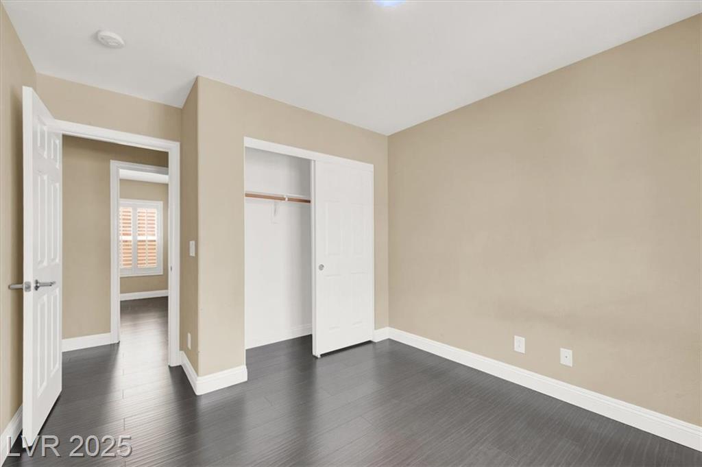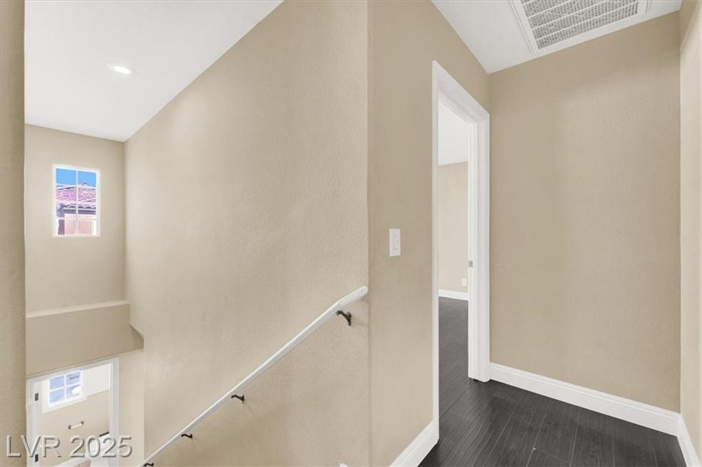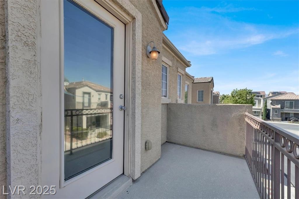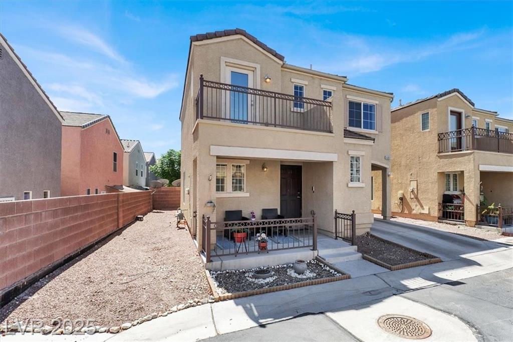 Welcome to this beautifully upgraded 3-bedroom, 2.5-bath home in southwest Las Vegas. This move-in ready residence features an open-concept floor plan with laminate flooring throughout the living room and upstairs areas—no carpet! The kitchen is equipped with granite countertops, custom cabinets, and stainless-steel appliances, complemented by wood shutter windows for added charm. The primary suite offers a walk-in closet, while one upstairs bedroom features a private balcony. The front yard provides a relaxing retreat, perfect for summer evenings. Community amenities include two sparkling pools, parks, picnic areas, and playgrounds. Conveniently located near the 215 freeway, shopping, and dining.
