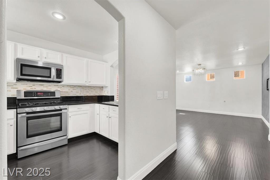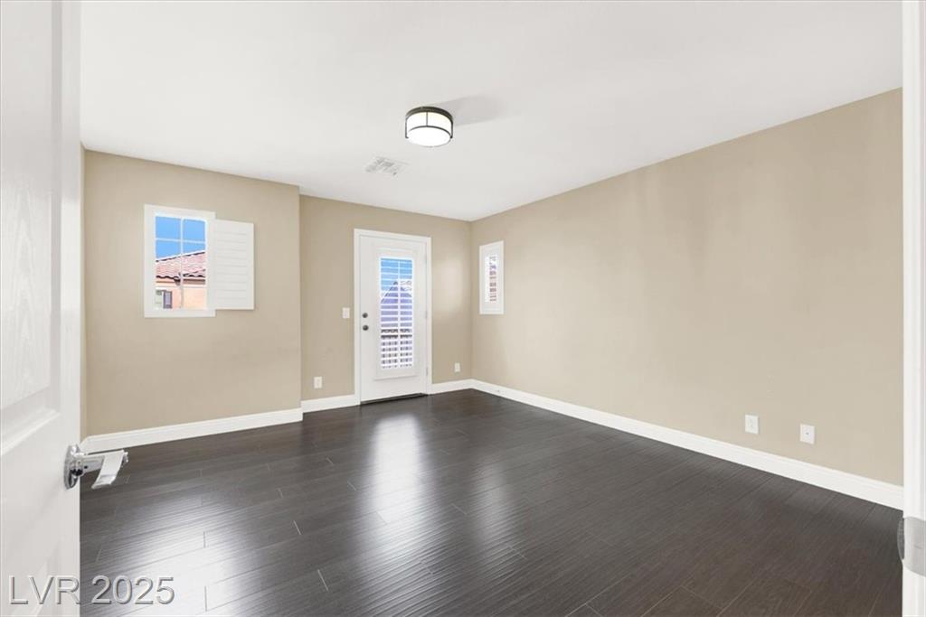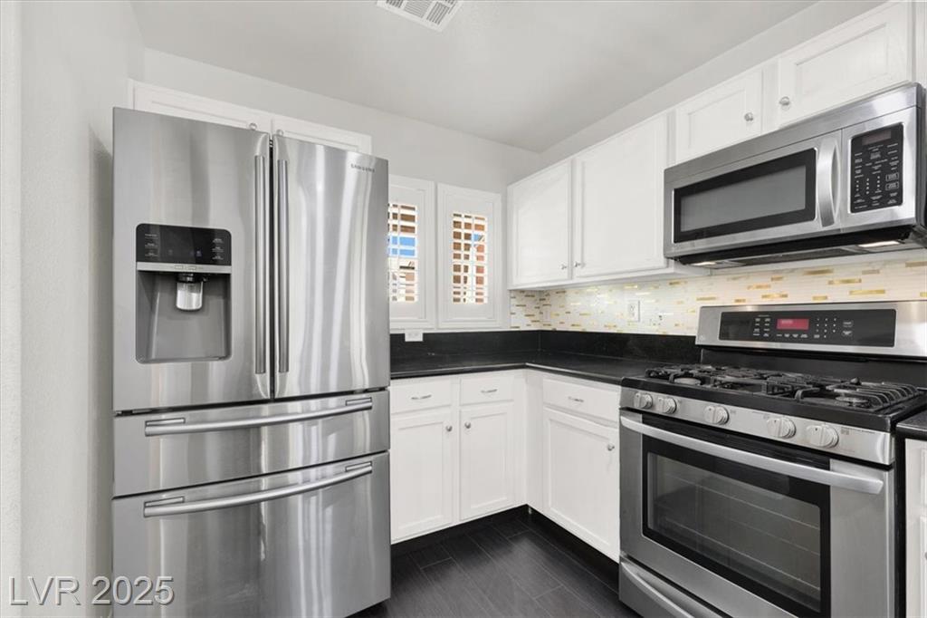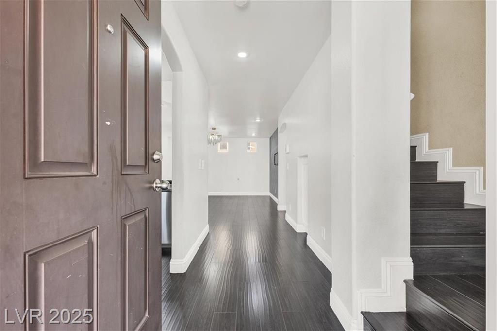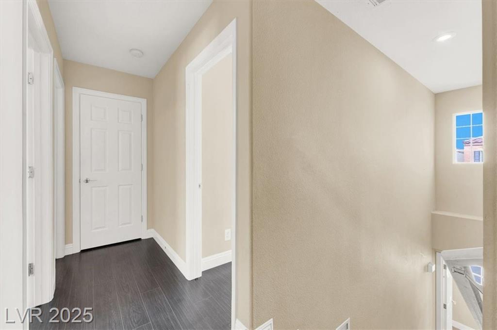Welcome to this beautifully upgraded 3-bedroom, 2.5-bath home in southwest Las Vegas. This move-in ready residence features an open-concept floor plan with laminate flooring throughout the living room and upstairs areas—no carpet! The kitchen is equipped with granite countertops, custom cabinets, and stainless-steel appliances, complemented by wood shutter windows for added charm. The primary suite offers a walk-in closet, while one upstairs bedroom features a private balcony. The front yard provides a relaxing retreat, perfect for summer evenings. Community amenities include two sparkling pools, parks, picnic areas, and playgrounds. Conveniently located near the 215 freeway, shopping, and dining.