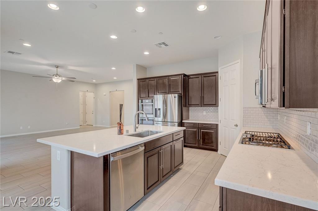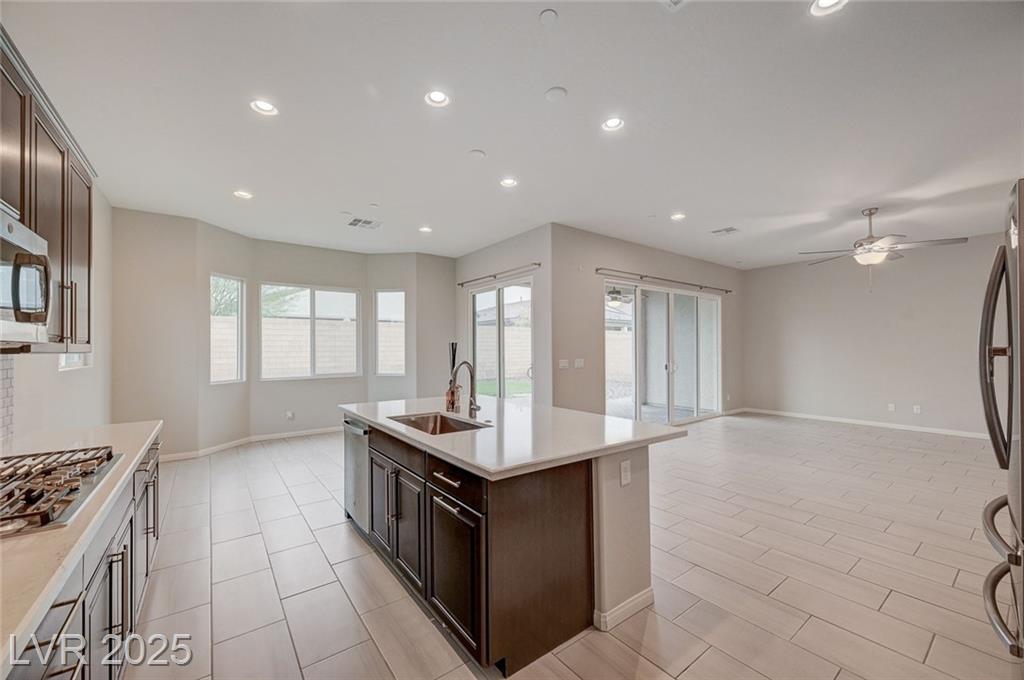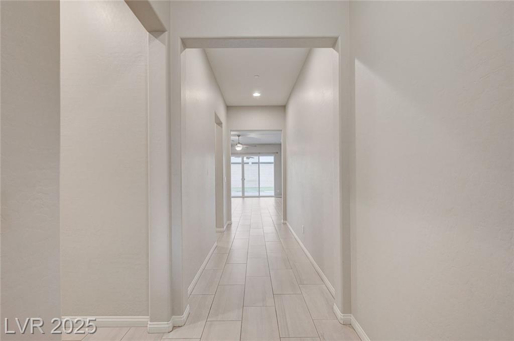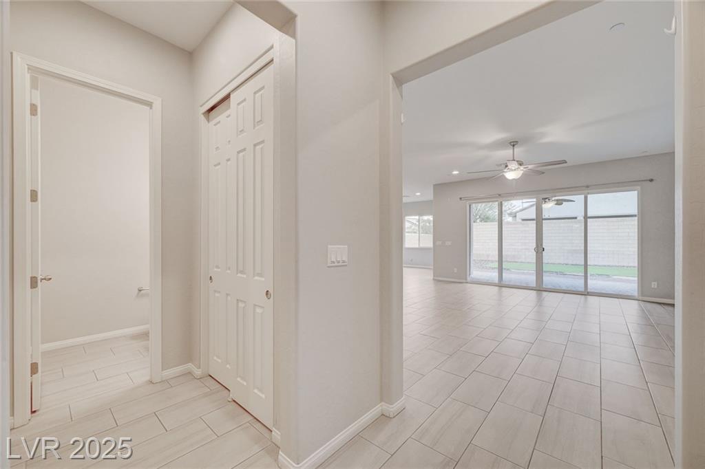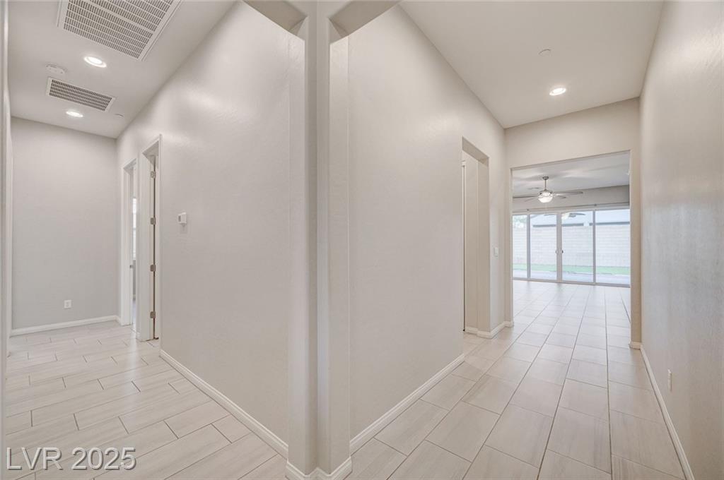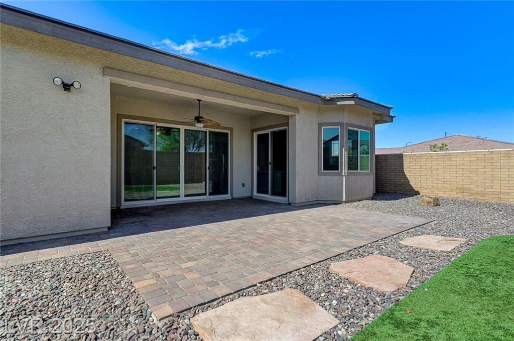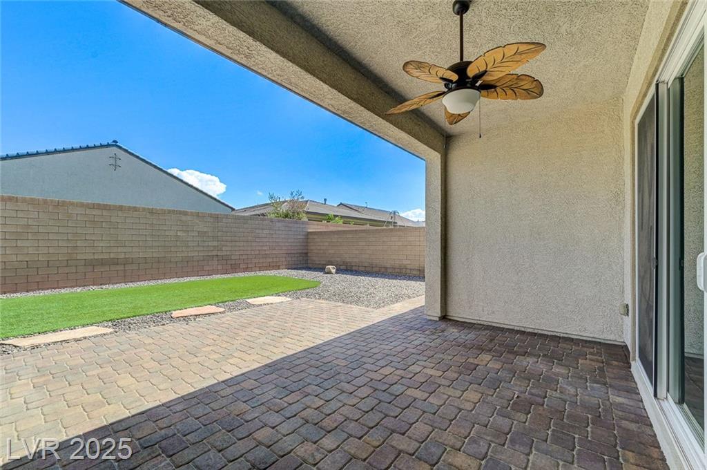 Welcome to this beautifully maintained 3 bedroom 3 bathroom home with a spacious den perfect for a home office or guest room. Situated on a premium corner lot, this single-story gem boasts a thoughtfully designed open floor plan. Step inside to find a large living room with an oversized sliding glass door, filling the space with natural light and creating a seamless indoor-outdoor flow. The chef’s kitchen features like-new stainless steel appliances, abundant cabinetry, and plenty of counter space. Enjoy modern conveniences like keyless garage entry, ceiling fans with lights in every room, a separate laundry room, and ample storage throughout. The primary suite is a true retreat, with a spa-like bathroom, dual vanities, a soaking tub, and a spacious walk-in shower. Outside, relax under your covered patio or cozy front porch. The low-maintenance yard and energy-efficient solar system adds even more value to this exceptional home.
