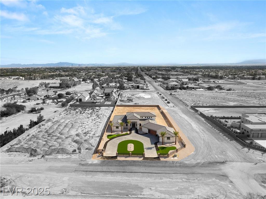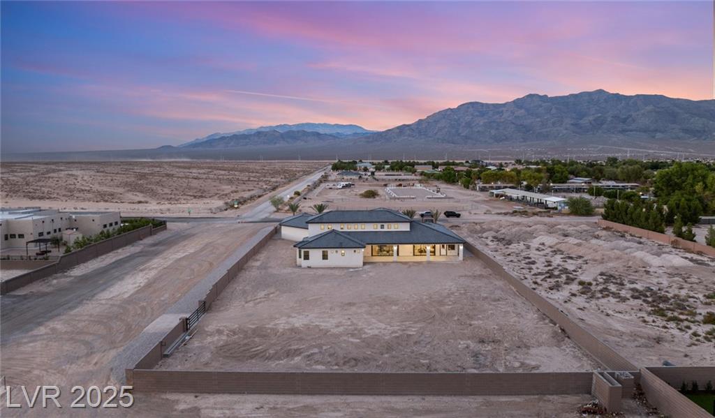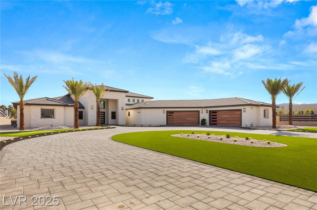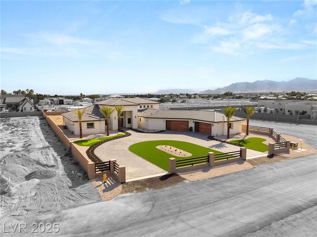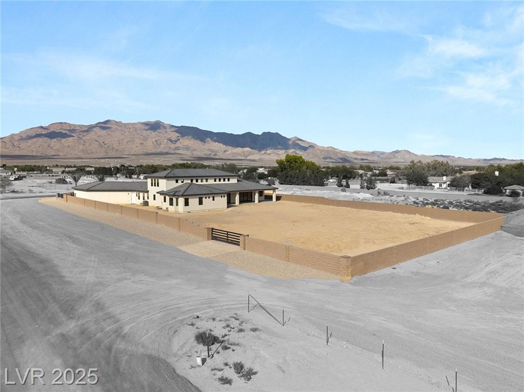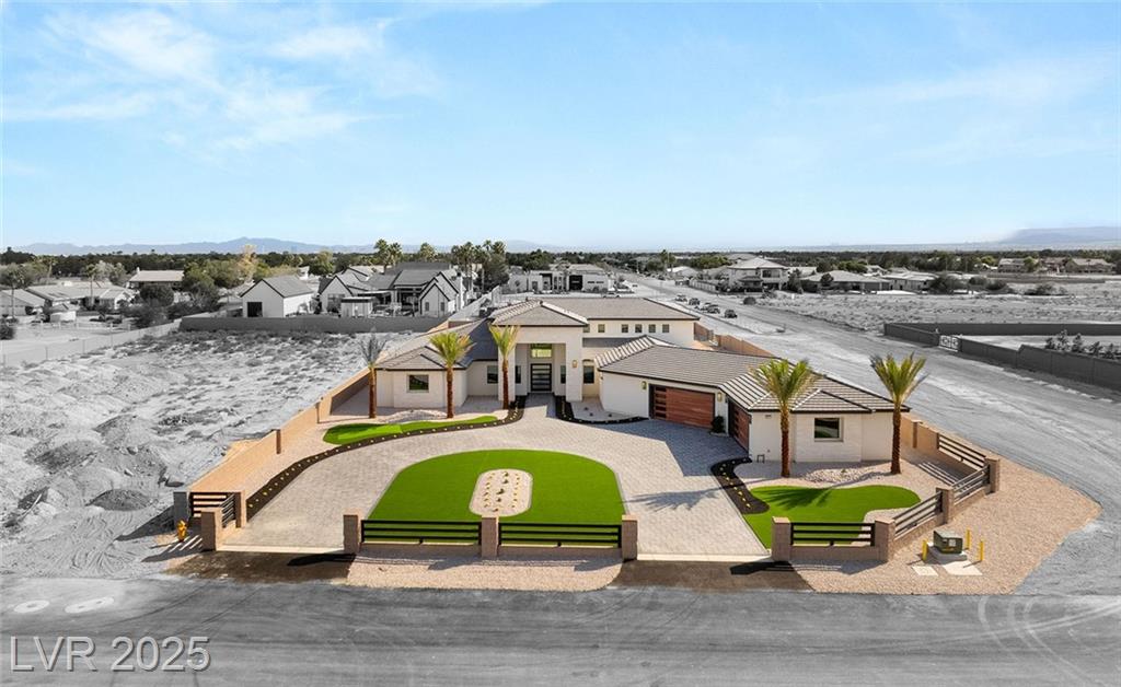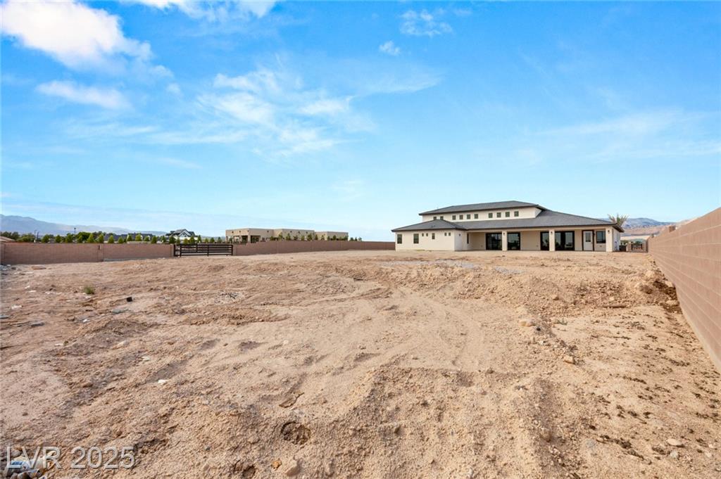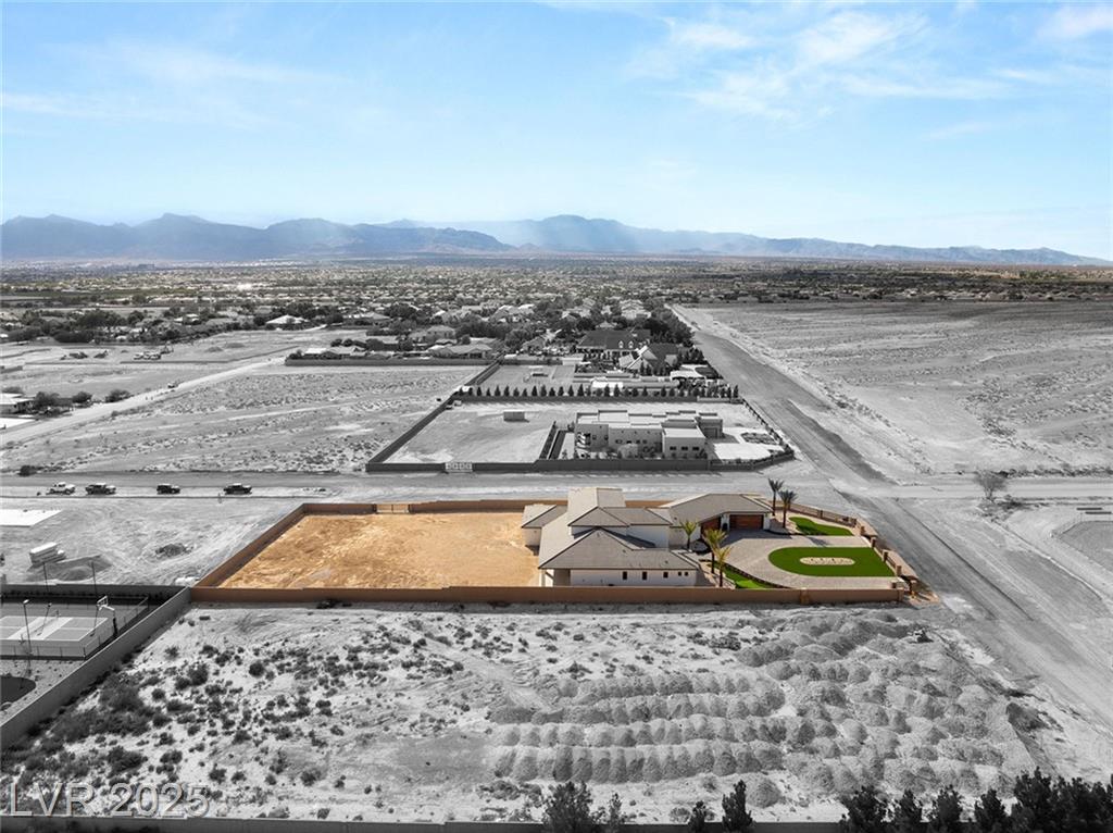 A rare Las Vegas find—this newly built custom estate spans 5,307 sq ft on a gated 1.06-acre lot, zoned for horses with no HOA. Designed for elegance and comfort, it offers single-level living with a loft and half bath. The great room impresses with 22’ vaulted ceilings, while 10’ ceilings carry throughout. Five bedrooms each feature en suite baths and individual mini-split AC units for personalized comfort. The gourmet kitchen showcases Thermador appliances, quartz counters, and a 15’x14’ butler’s pantry. The primary suite includes a sitting area, spa-like bath, 12’x13’ custom closet with island, and backyard access. Entertain under a 54’x15’ covered patio with wood ceiling. The 1,847 sq ft 4-car garage offers unmatched utility with tankless water heaters and 7’ clearance doors. With dual 18 SEER A/C units and energy-efficient features, this estate blends modern efficiency with timeless luxury. The backyard awaits your vision—horses, pool, or gardens.