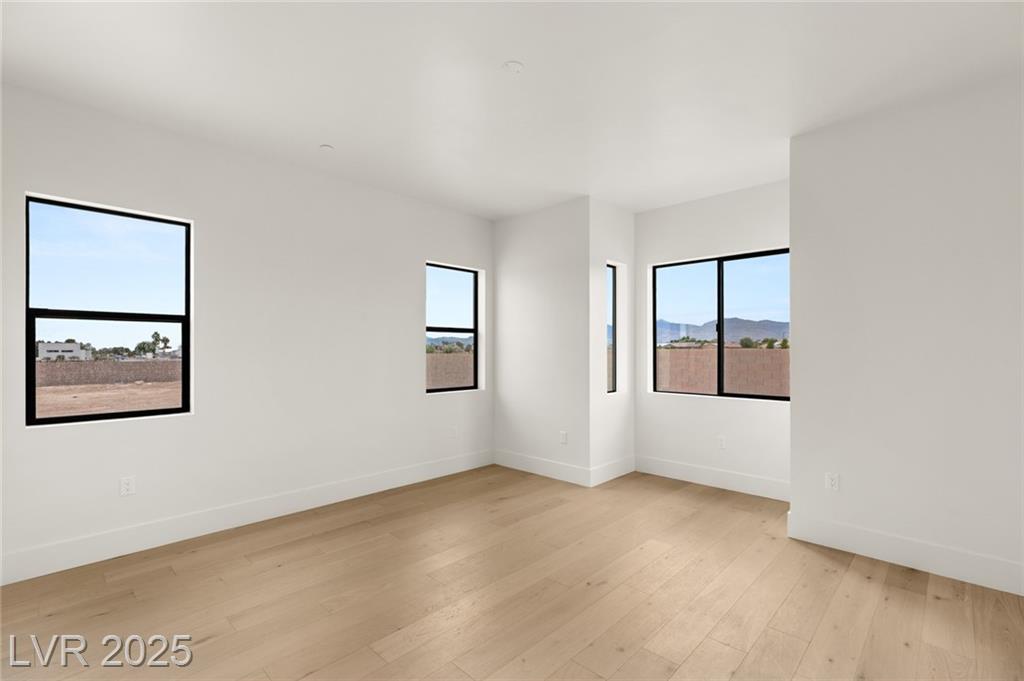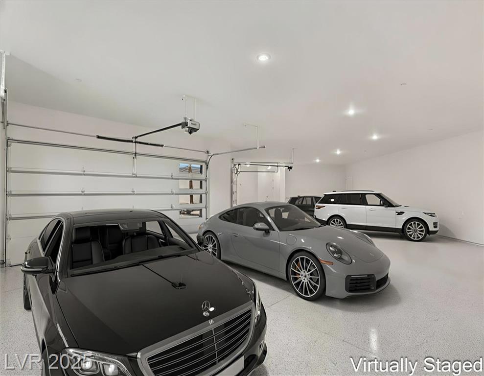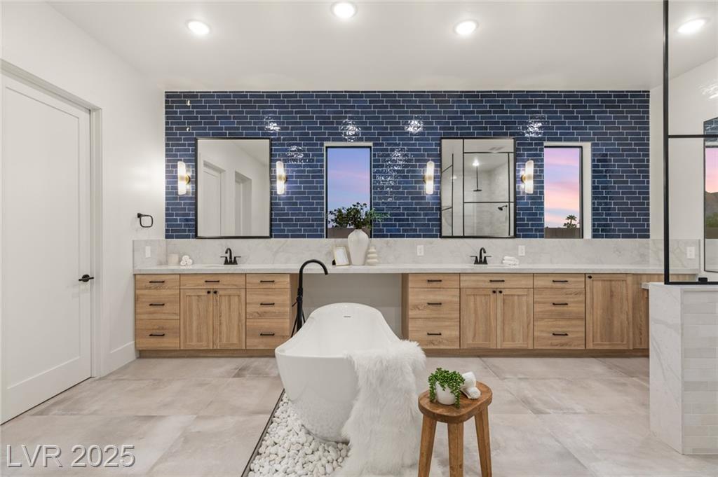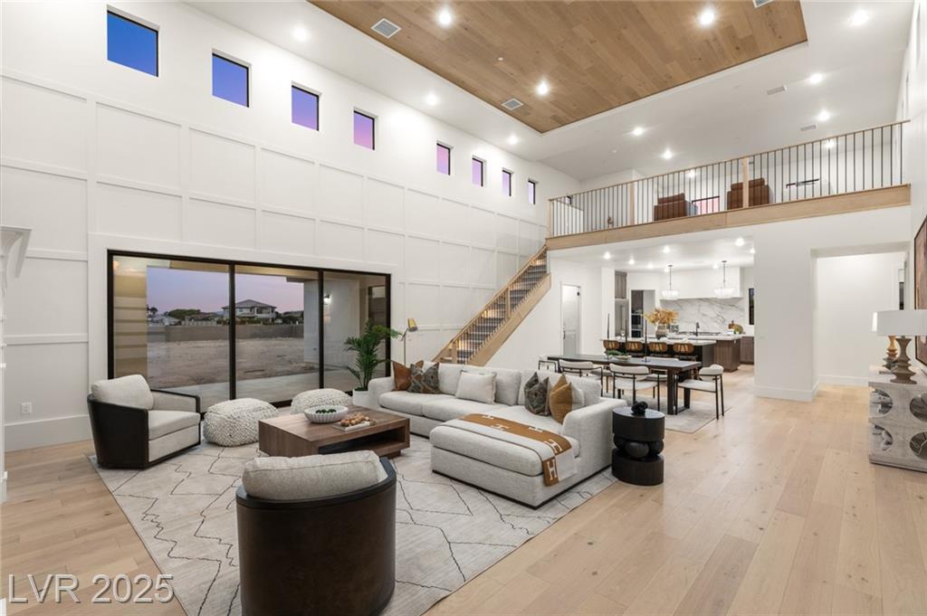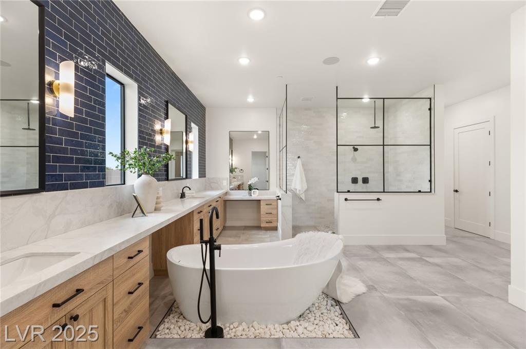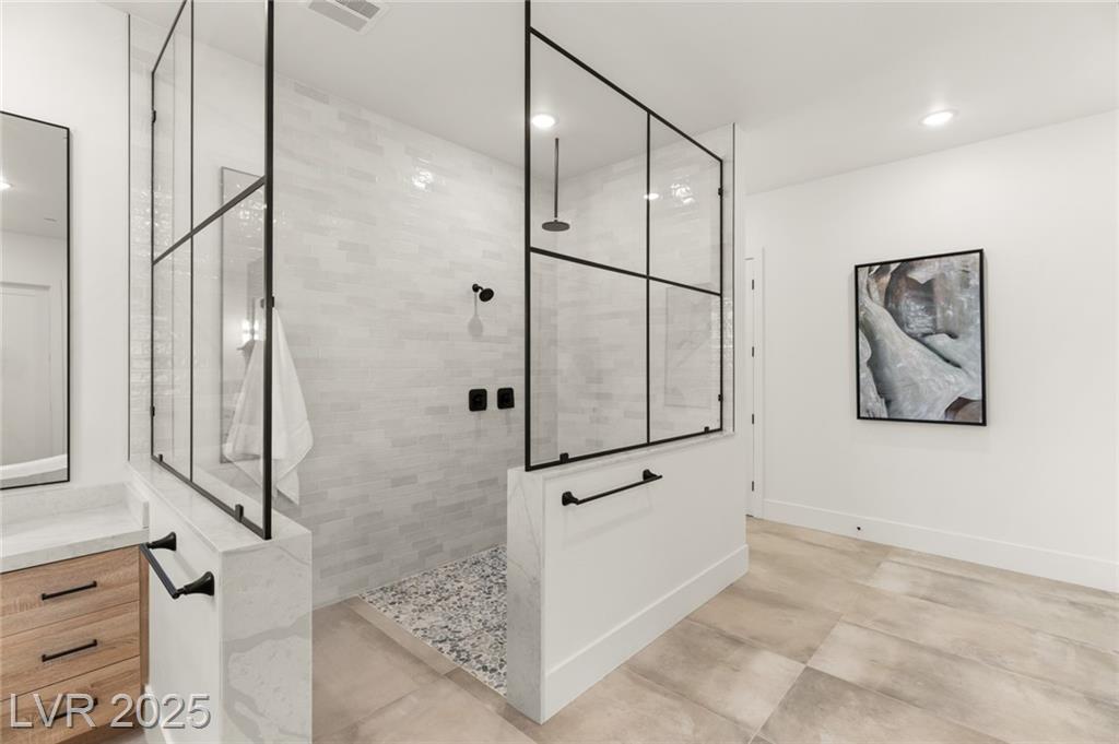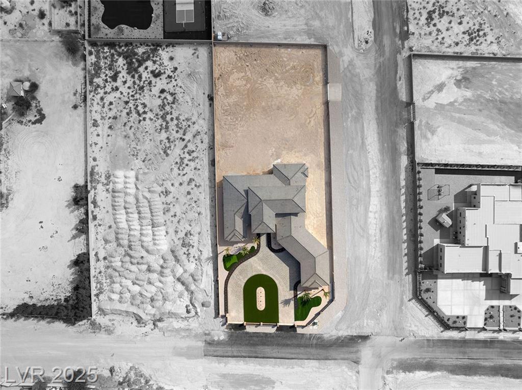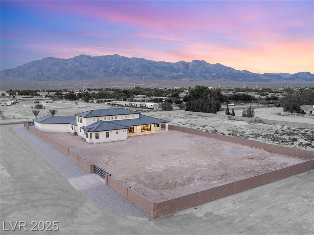 A rare Las Vegas find—this newly built custom estate spans 5,307 sq ft on a gated 1.06-acre lot, zoned for horses with no HOA. Designed for elegance and comfort, it offers single-level living with a loft and half bath. The great room impresses with 22’ vaulted ceilings, while 10’ ceilings carry throughout. Five bedrooms each feature en suite baths and individual mini-split AC units for personalized comfort. The gourmet kitchen showcases Thermador appliances, quartz counters, and a 15’x14’ butler’s pantry. The primary suite includes a sitting area, spa-like bath, 12’x13’ custom closet with island, and backyard access. Entertain under a 54’x15’ covered patio with wood ceiling. The 1,847 sq ft 4-car garage offers unmatched utility with tankless water heaters and 7’ clearance doors. With dual 18 SEER A/C units and energy-efficient features, this estate blends modern efficiency with timeless luxury. The backyard awaits your vision—horses, pool, or gardens.