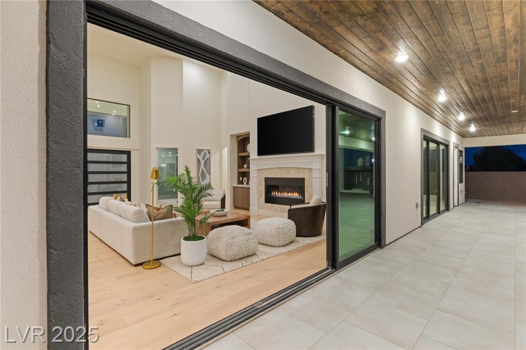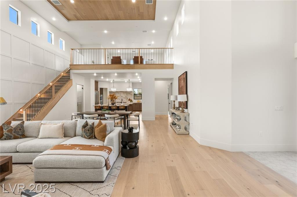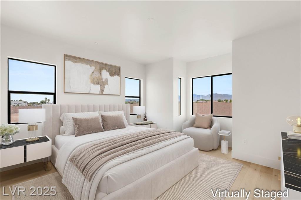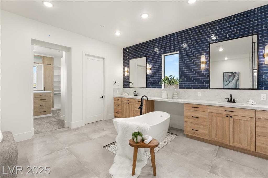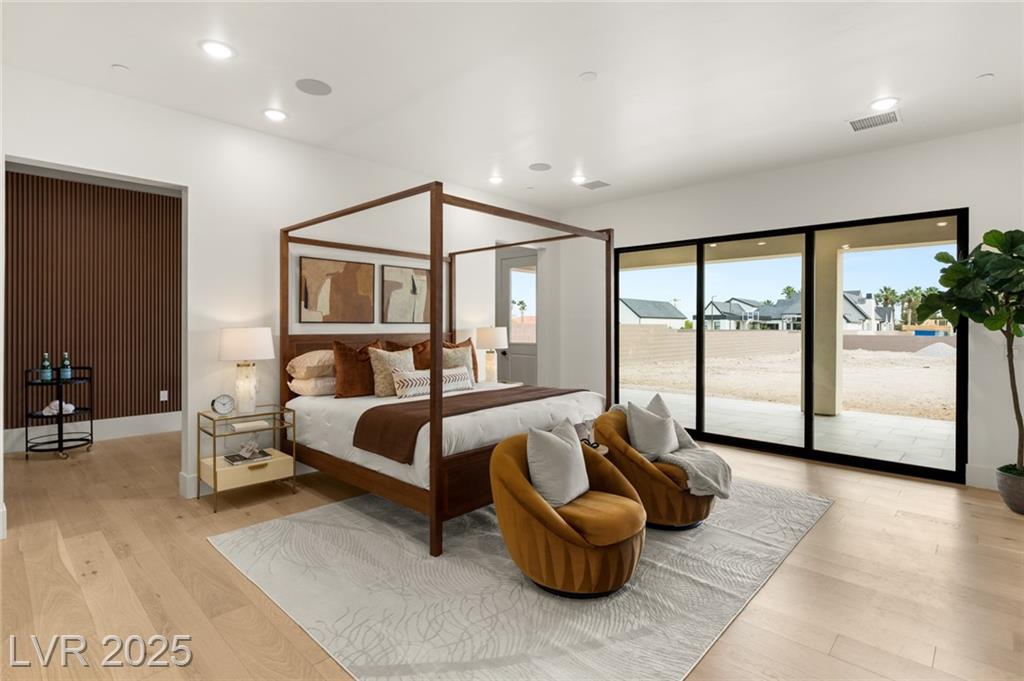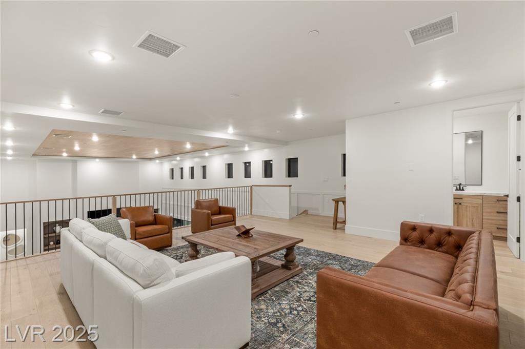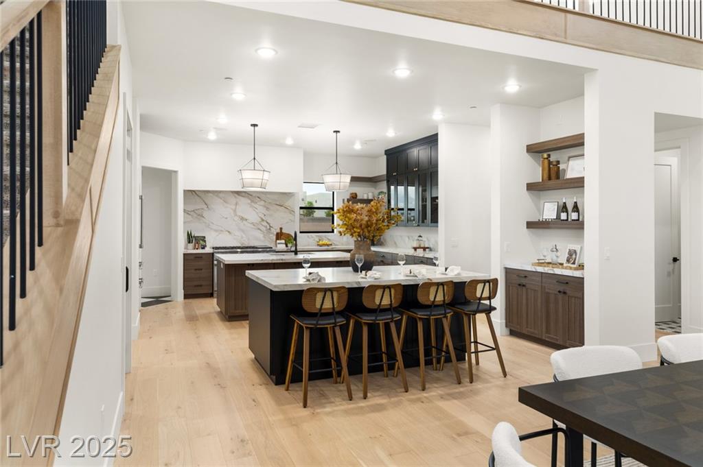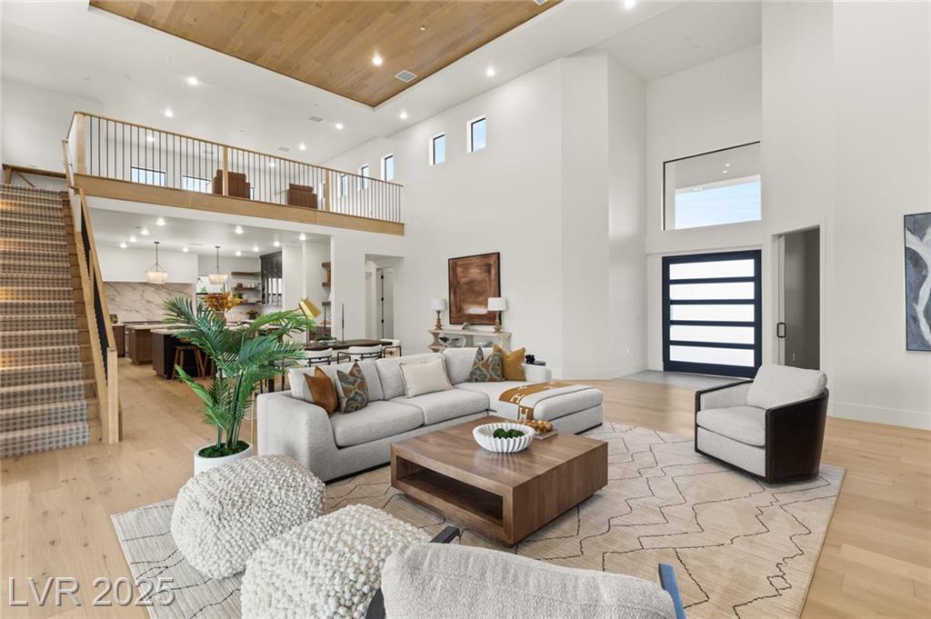A rare Las Vegas find—this newly built custom estate spans 5,307 sq ft on a gated 1.06-acre lot, zoned for horses with no HOA. Designed for elegance and comfort, it offers single-level living with a loft and half bath. The great room impresses with 22’ vaulted ceilings, while 10’ ceilings carry throughout. Five bedrooms each feature en suite baths and individual mini-split AC units for personalized comfort. The gourmet kitchen showcases Thermador appliances, quartz counters, and a 15’x14’ butler’s pantry. The primary suite includes a sitting area, spa-like bath, 12’x13’ custom closet with island, and backyard access. Entertain under a 54’x15’ covered patio with wood ceiling. The 1,847 sq ft 4-car garage offers unmatched utility with tankless water heaters and 7’ clearance doors. With dual 18 SEER A/C units and energy-efficient features, this estate blends modern efficiency with timeless luxury. The backyard awaits your vision—horses, pool, or gardens.