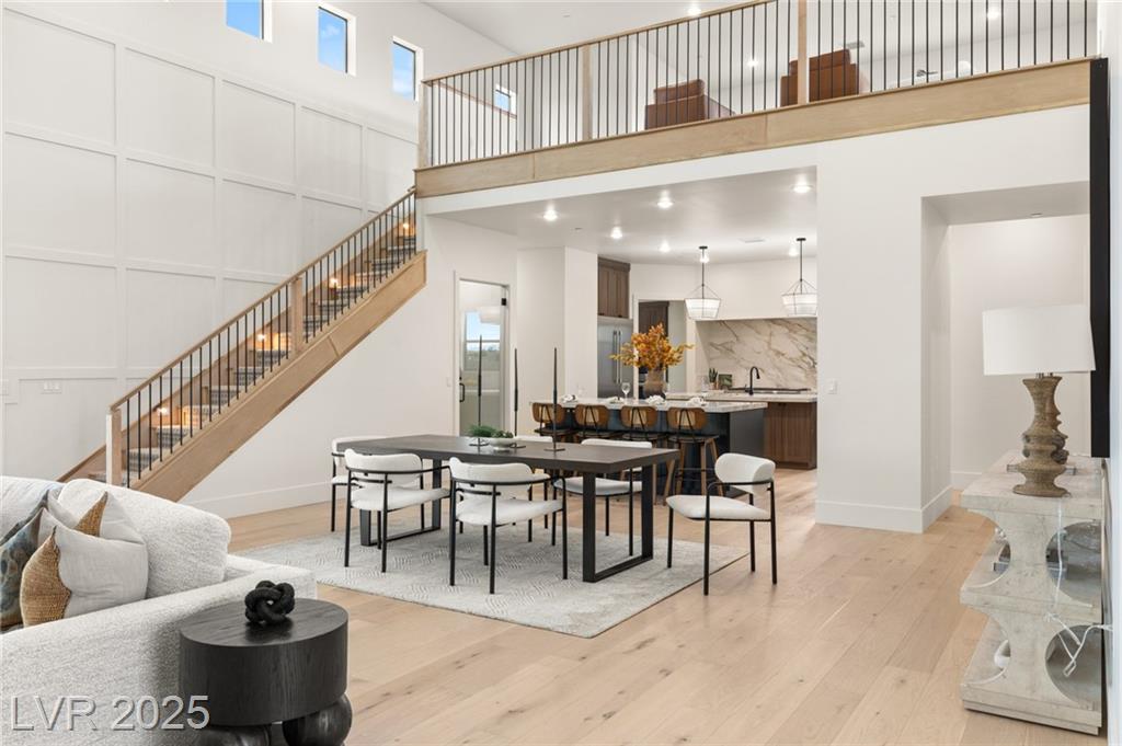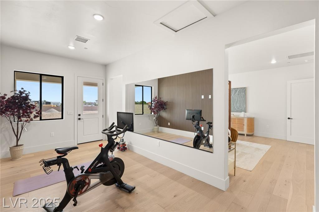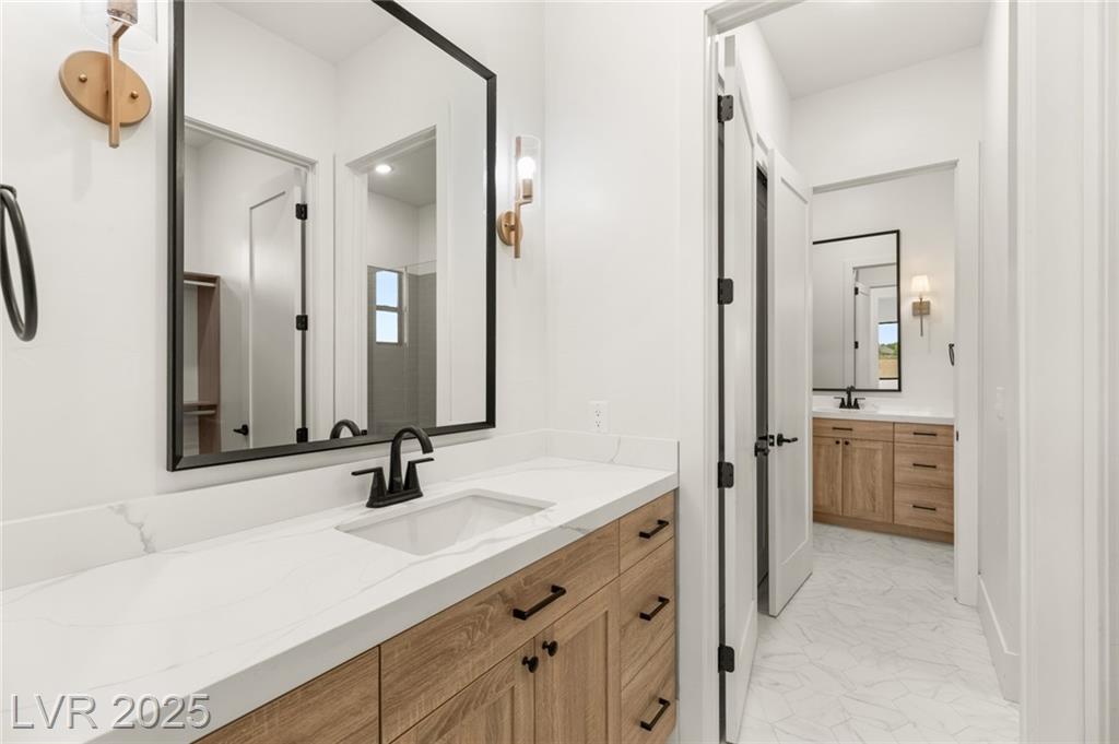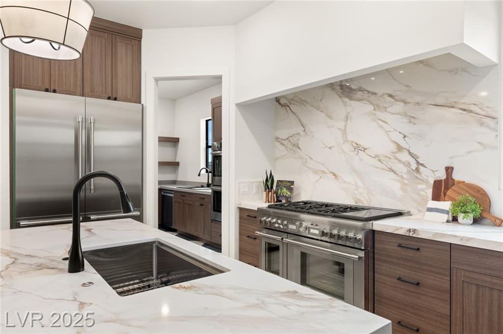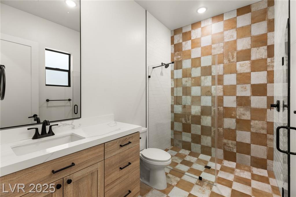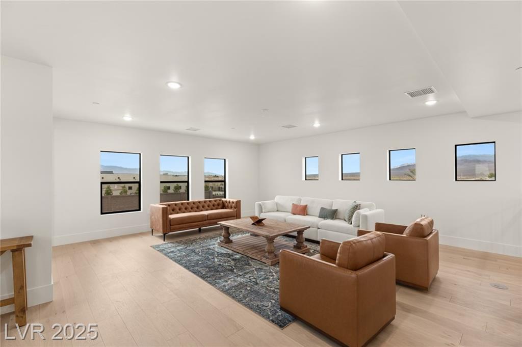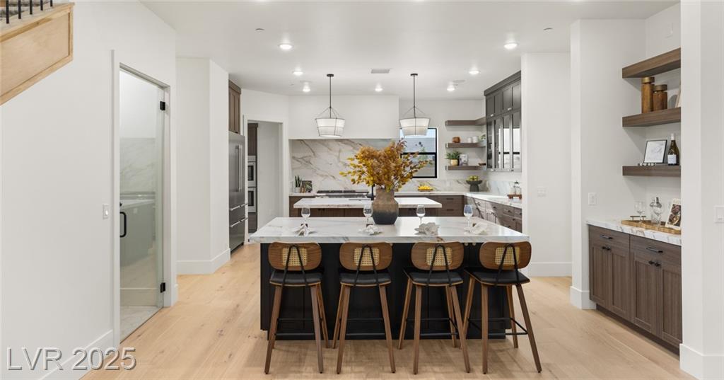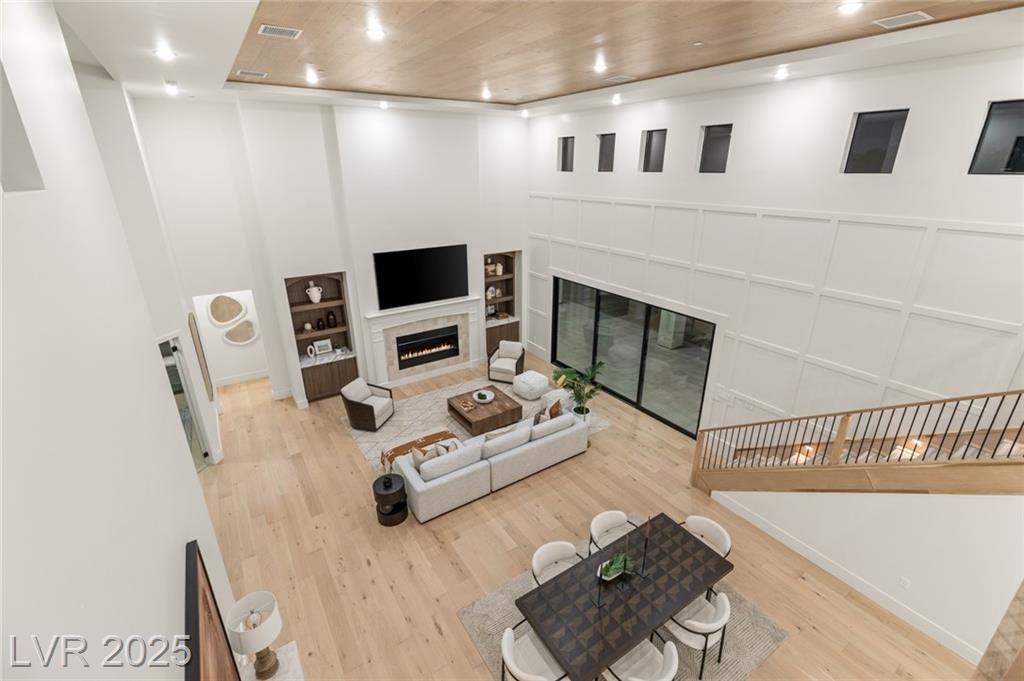 A rare Las Vegas find—this newly built custom estate spans 5,307 sq ft on a gated 1.06-acre lot, zoned for horses with no HOA. Designed for elegance and comfort, it offers single-level living with a loft and half bath. The great room impresses with 22’ vaulted ceilings, while 10’ ceilings carry throughout. Five bedrooms each feature en suite baths and individual mini-split AC units for personalized comfort. The gourmet kitchen showcases Thermador appliances, quartz counters, and a 15’x14’ butler’s pantry. The primary suite includes a sitting area, spa-like bath, 12’x13’ custom closet with island, and backyard access. Entertain under a 54’x15’ covered patio with wood ceiling. The 1,847 sq ft 4-car garage offers unmatched utility with tankless water heaters and 7’ clearance doors. With dual 18 SEER A/C units and energy-efficient features, this estate blends modern efficiency with timeless luxury. The backyard awaits your vision—horses, pool, or gardens.