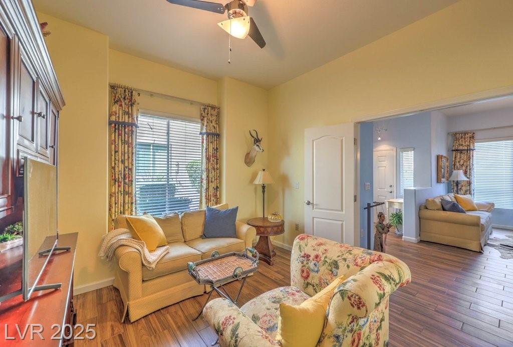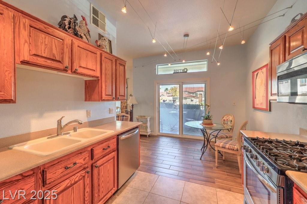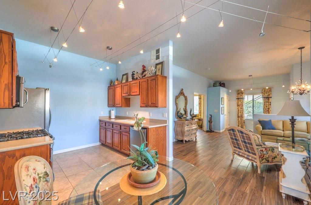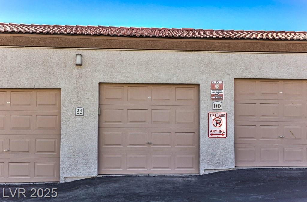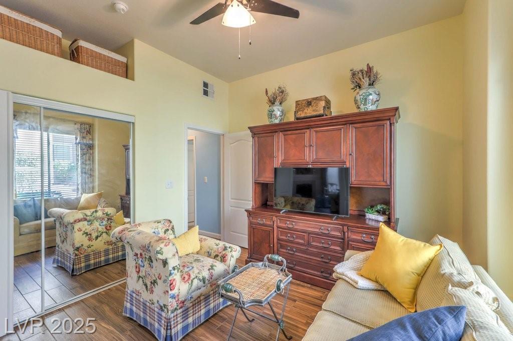 This beautifully maintained 2-bedroom ground-floor condo offers comfort, convenience, and style. Rich, wood-look tile flooring flows through the main living areas, leading to a spacious kitchen outfitted with sleek stainless steel appliances. The soft paint tones throughout create a warm and inviting atmosphere. The primary bedroom features plush carpeting and boasts an oversized walk-in closet. The second bedroom, with French doors and an additional entryway, is ideal as a guest room, home office, or wellness retreat. Step outside through the newer sliding glass door to enjoy a generously sized private patio—perfect for morning coffee or evening relaxation. This unit includes its own PRIVATE garage DD4 as well as an assigned covered parking space. The community offers two sparkling pools, a clubhouse with a fitness center, and roving security for peace of mind. Conveniently located near the 215 freeway, The District, Lee's Family Forum, and the upcoming The Cliffs Retail Center