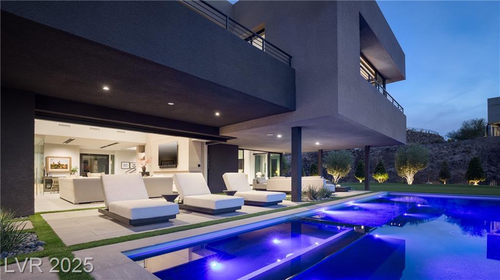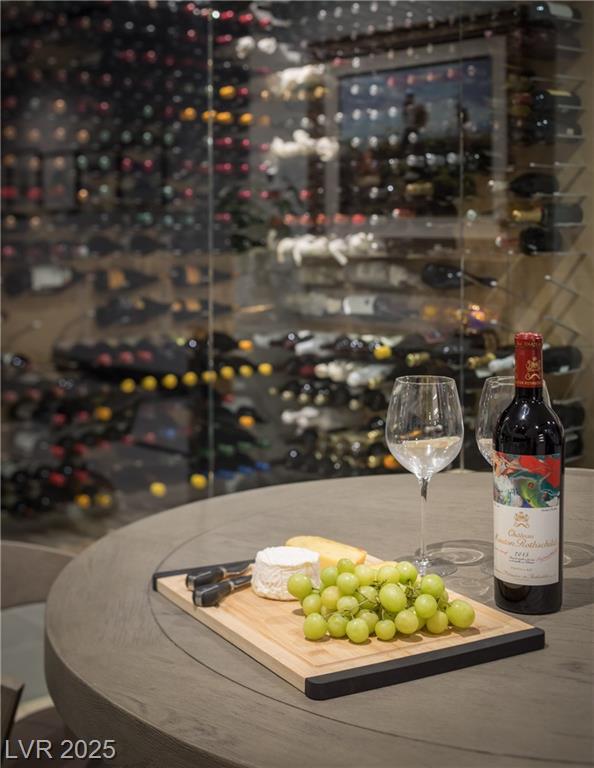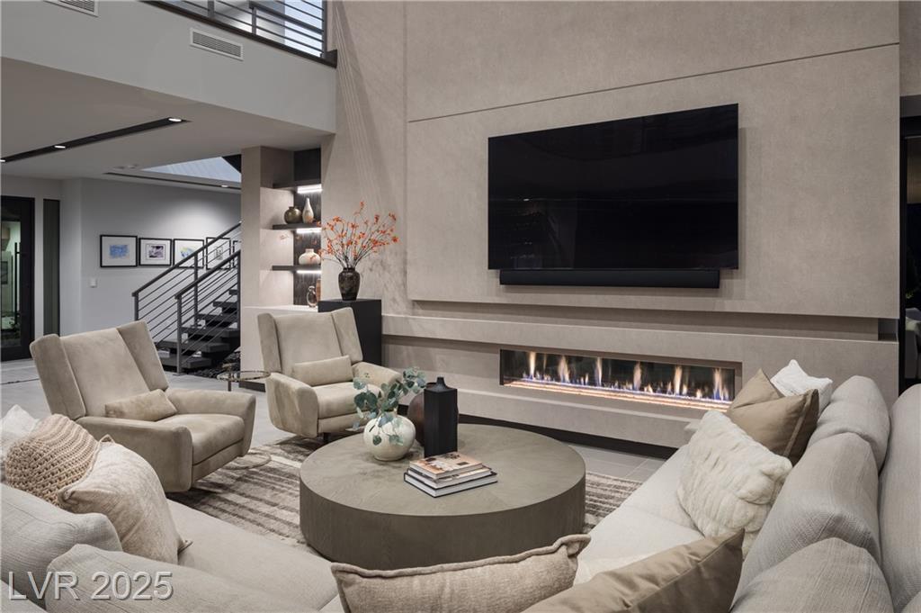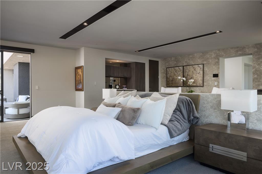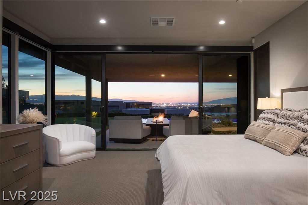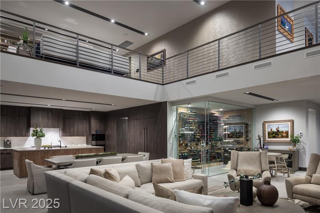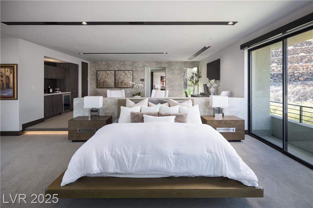 Contemporary style, warm finishes, gorgeous views. This Blue Heron-designed home sits atop the double-gated Obsidian neighborhood and boasts full views of The Strip and city lights. Corner pocketing door systems in the great room create the ultimate indoor/outdoor vibe, while double-height ceilings give an airy feel. The open-style kitchen is loaded with Wolf and Sub-Zero appliances, has a large island and walk-in pantry. The glass wine cellar is close at hand. Soak in the views from the chic pool/spa, dine al fresco at the full outdoor kitchen or enjoy a drink by the fire pit. Upstairs, the primary suite has it all: an enormous room with space for an office or lounging, a stunning bath with dual vanities & toilets and a luxurious, boutique-style closet, PLUS yoga/gym space. The loft contains a spectacular wet bar and opens to the large balcony—another ideal spot for views. A casita with its own kitchenette and living room has access from the courtyard, as does a dedicated office.