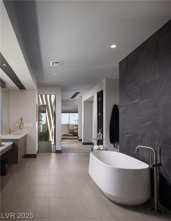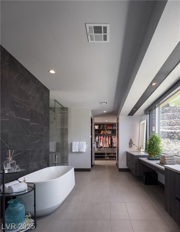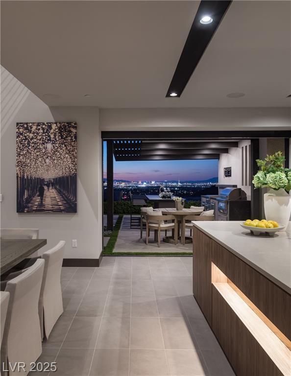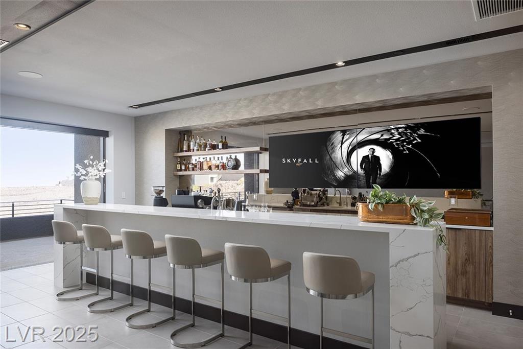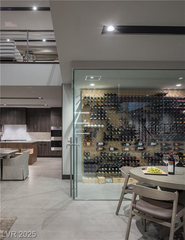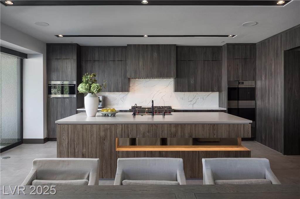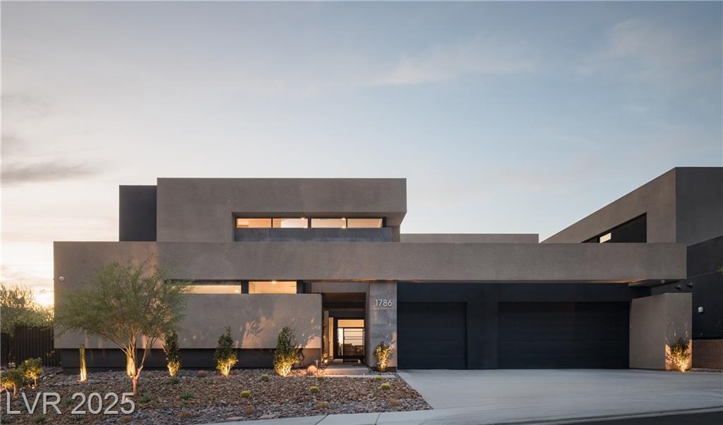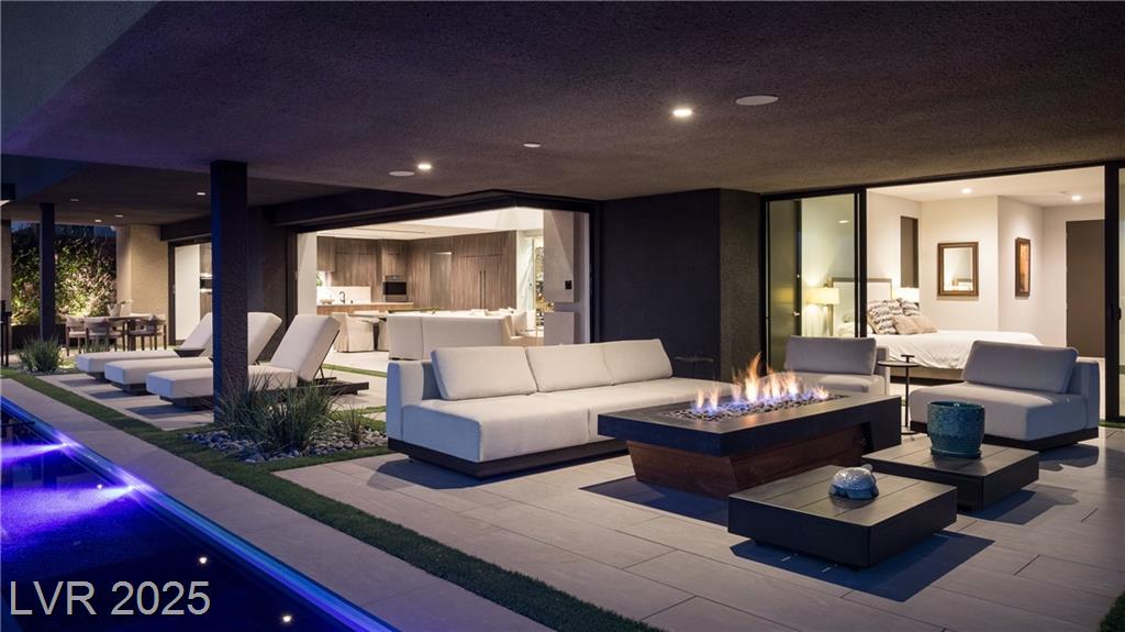 Contemporary style, warm finishes, gorgeous views. This Blue Heron-designed home sits atop the double-gated Obsidian neighborhood and boasts full views of The Strip and city lights. Corner pocketing door systems in the great room create the ultimate indoor/outdoor vibe, while double-height ceilings give an airy feel. The open-style kitchen is loaded with Wolf and Sub-Zero appliances, has a large island and walk-in pantry. The glass wine cellar is close at hand. Soak in the views from the chic pool/spa, dine al fresco at the full outdoor kitchen or enjoy a drink by the fire pit. Upstairs, the primary suite has it all: an enormous room with space for an office or lounging, a stunning bath with dual vanities & toilets and a luxurious, boutique-style closet, PLUS yoga/gym space. The loft contains a spectacular wet bar and opens to the large balcony—another ideal spot for views. A casita with its own kitchenette and living room has access from the courtyard, as does a dedicated office.