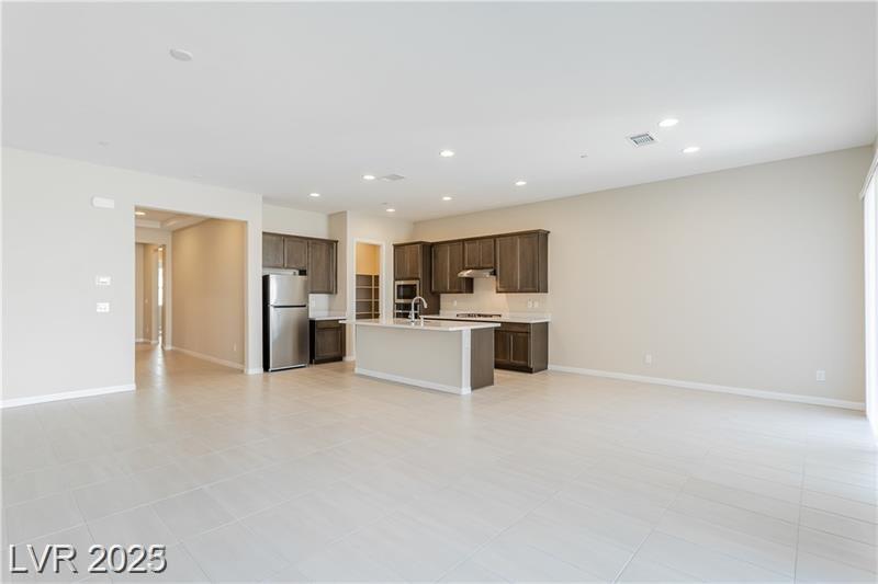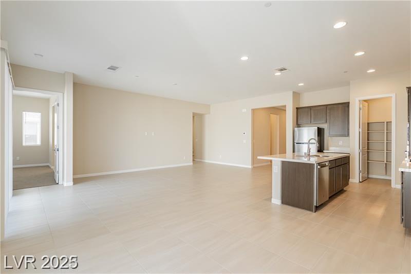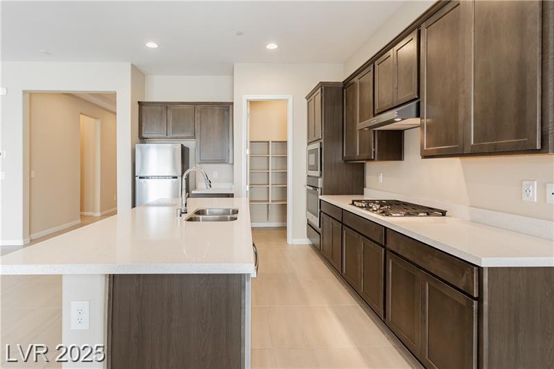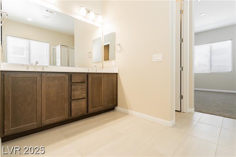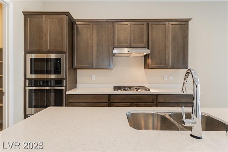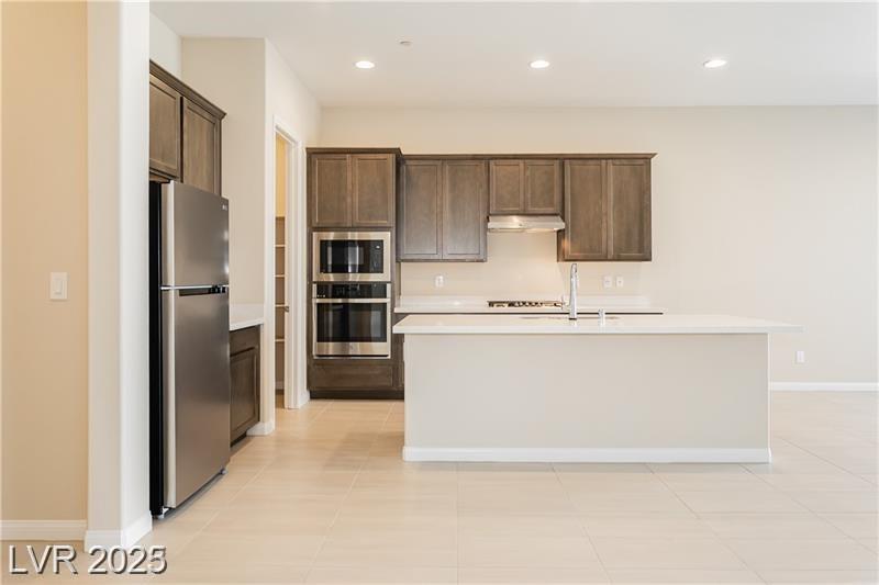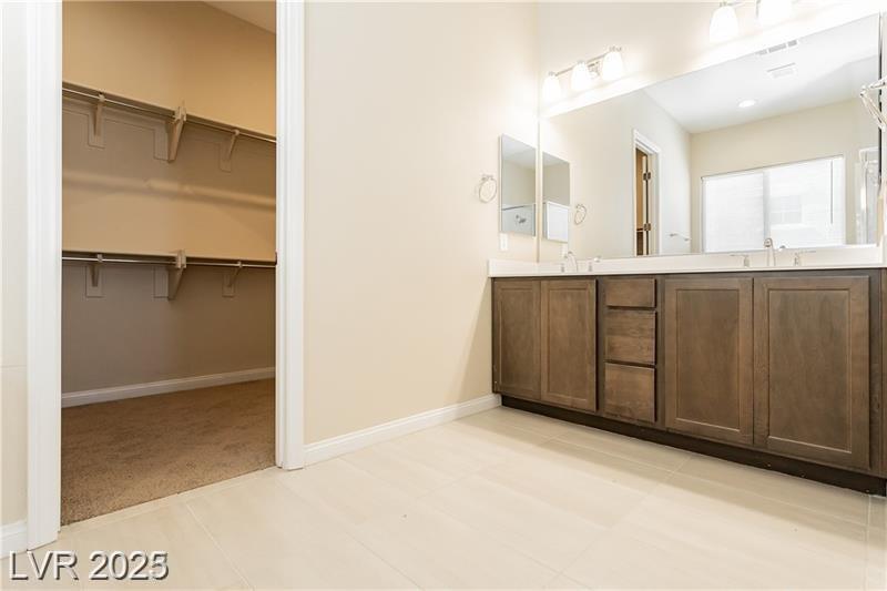 Beautiful Cadence home within walking distance to the community park, pool, recreation, and fitness areas. The spacious entry opens to an inviting living area and kitchen featuring double built-in ovens, stainless steel appliances, and an oversized island with dual sinks. A separate den offers flexibility for an office or private room. Guest bedrooms each have their own bathrooms with double sinks. The private primary suite is separate from the other bedrooms and includes a large bathroom and walk-in closet. Outdoors, enjoy the covered patio and finished backyard, perfect for relaxing or entertaining.