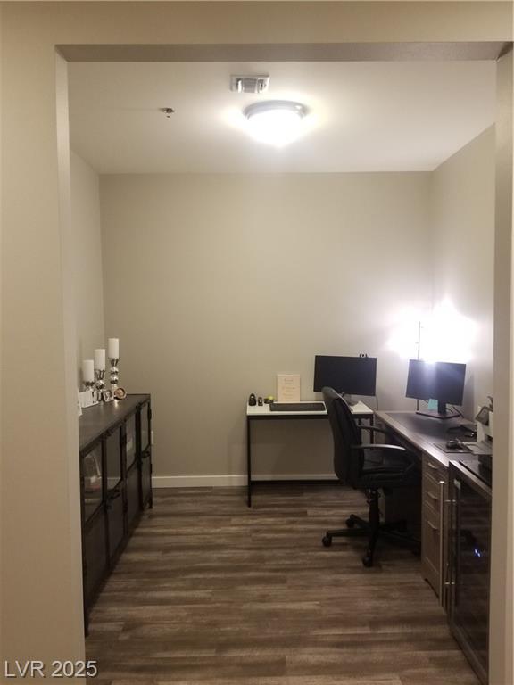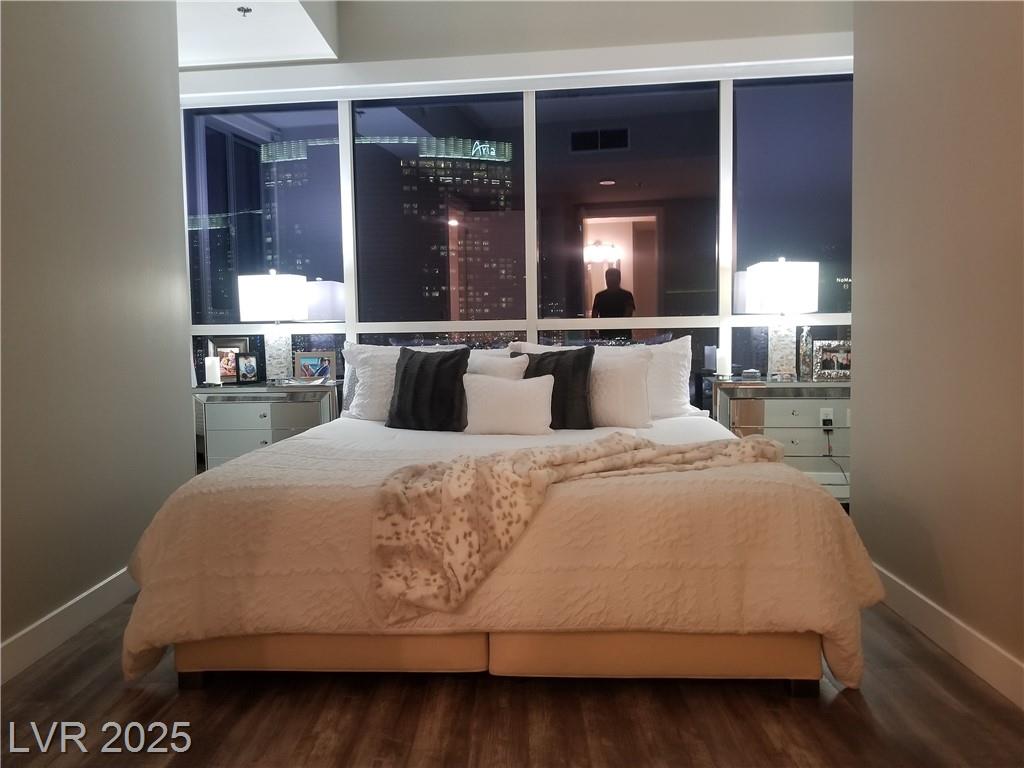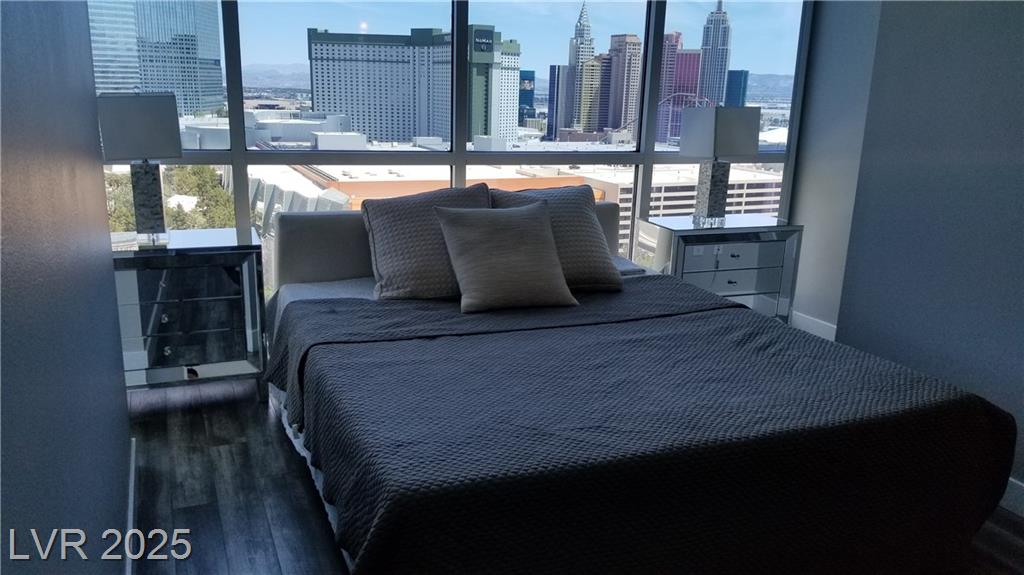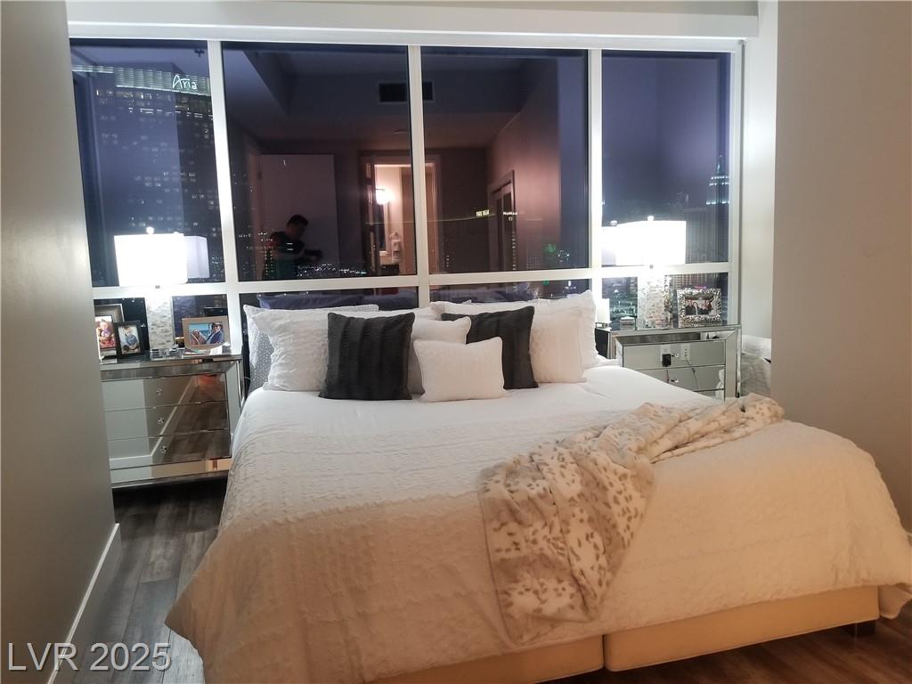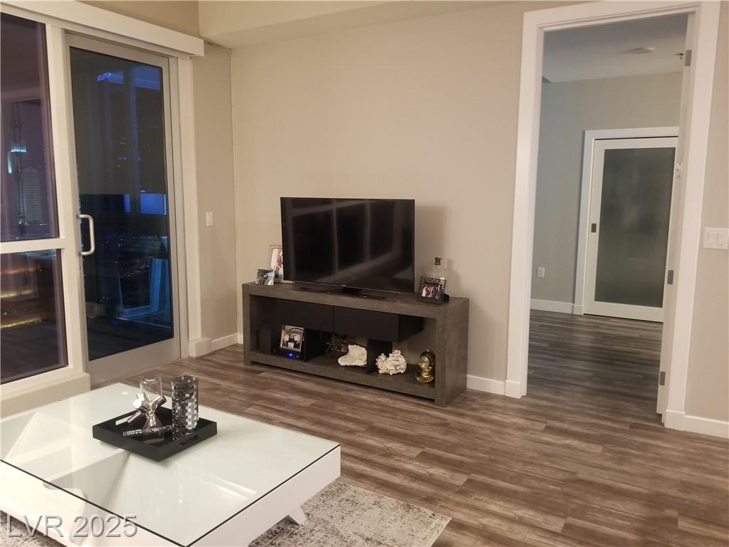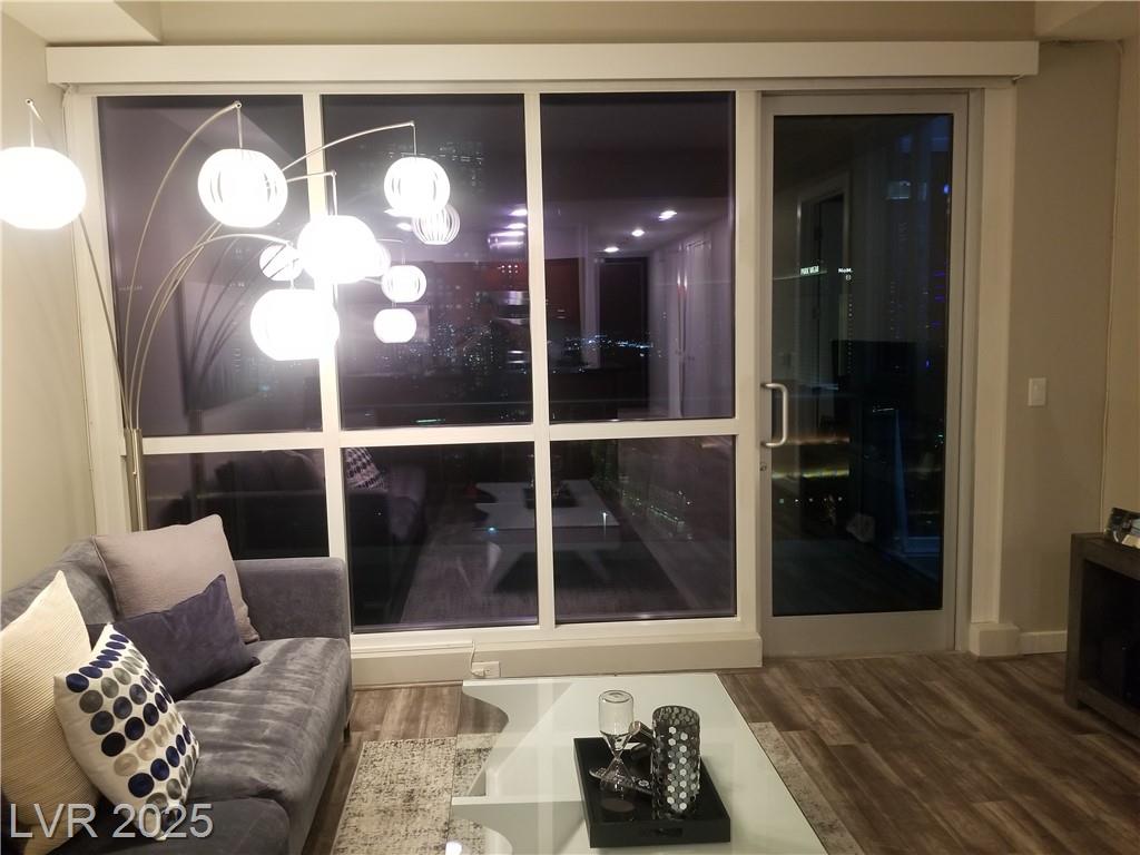All furniture included in the sale. High floor Strip view with a balcony. Most popular floorplan; 1 master bedrooms with a den and 1.5 baths. It includes 1 assigned parking spots on the 2nd level. All hardwood floor and motorized window shades throughout. Free Cox cable TV and Internet. Kitchen features marble flooring, granite countertops, and stainless steel appliances. Building comes with fitness center with spa and steam room, valet, swimming pool, BBQ area, pet park and limousines service. All located within minutes of the Strip. Absolutely Stunning!