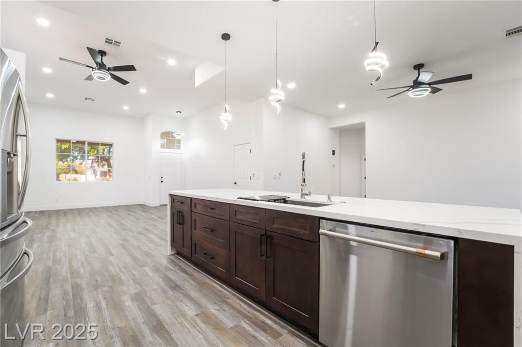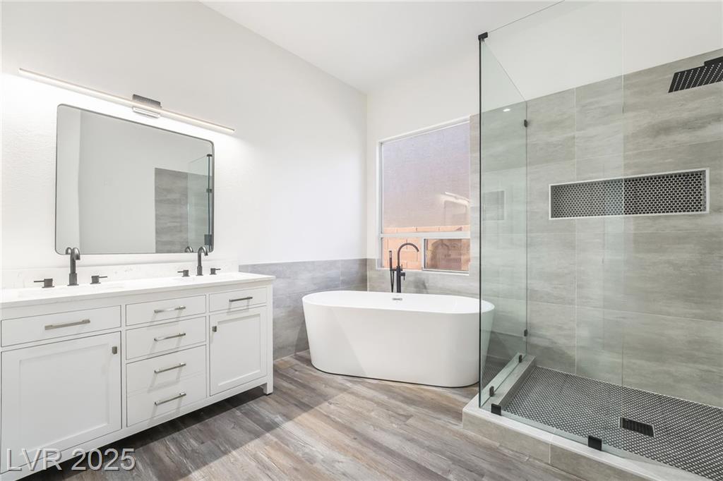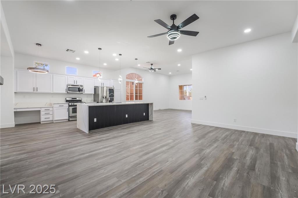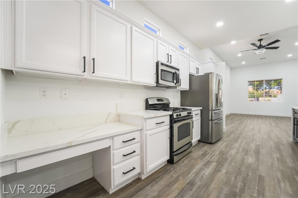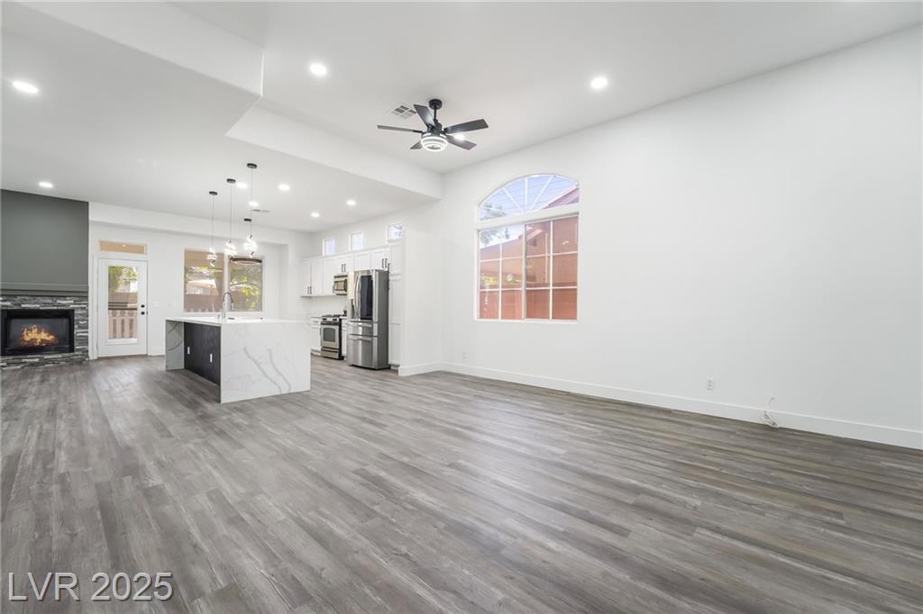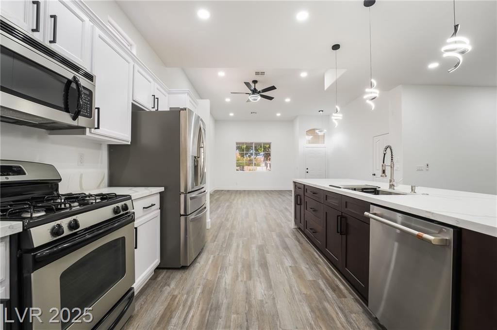 Located in the desirable Silverado Ranch community, this freshly renovated single-story home sits on a quiet cul-de-sac and offers a spacious three-car garage, an open floorplan, and stylish upgrades throughout. The interior features brand new LVP flooring, a modern kitchen with quartz countertops, a large island perfect for gathering, and beautifully tiled bathrooms. Step outside to a covered patio and private backyard, ideal for entertaining or relaxing. With quick access to the 215 freeway and just minutes from shopping, dining, and retail conveniences, this home combines comfort, style, and convenience in one perfect package.