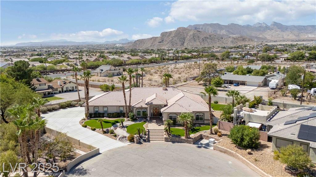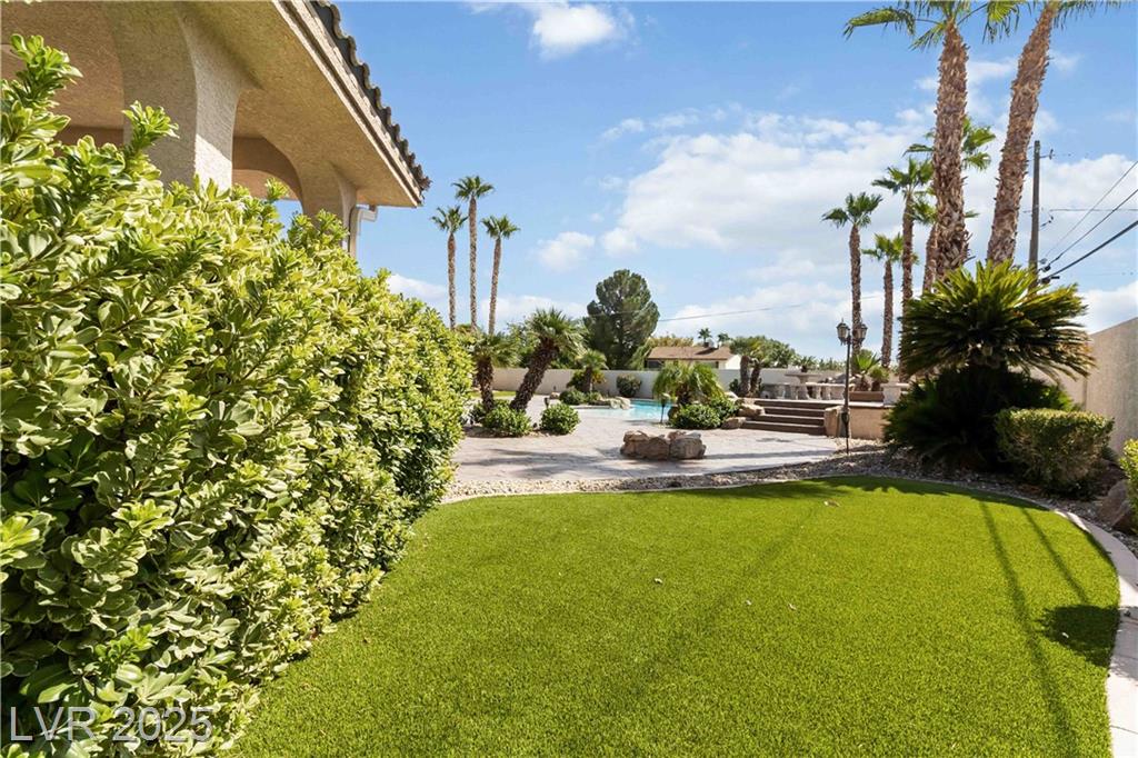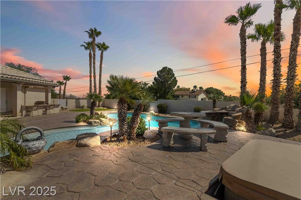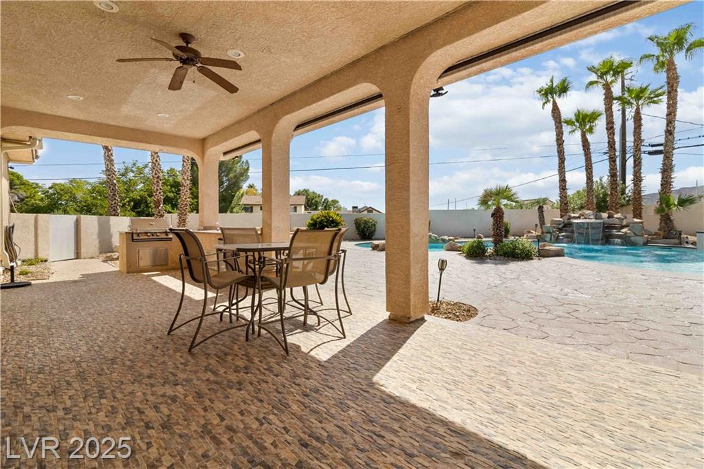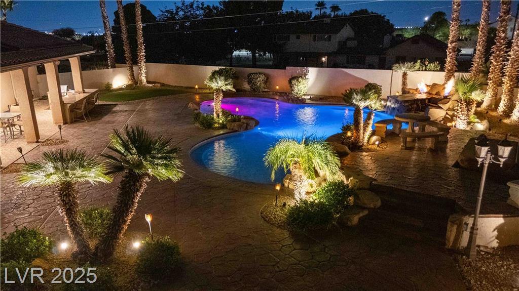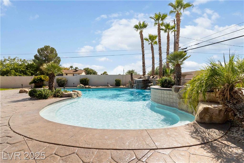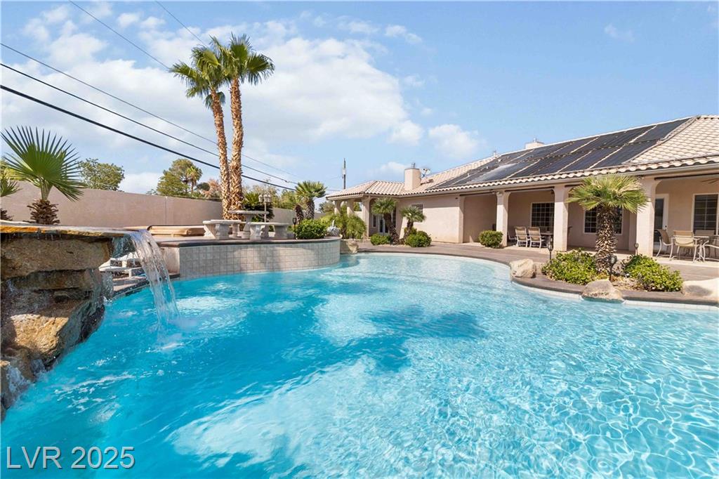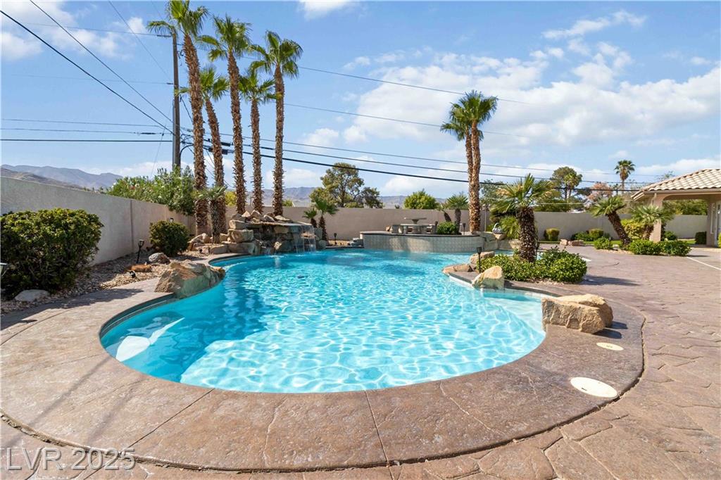 Experience impeccable luxury living in this stunning custom single-story retreat on over ½ acre in the prestigious Lone Mountain area with no HOA! A bright, open layout with soaring ceilings and travertine floors flows from the formal dining room to a spacious great room with surround sound. The chef’s kitchen dazzles with granite counters & backsplash, a center island, stainless appliances with built-in fridge & walk-in pantry. All 4 bedrooms boast en-suites, while the lavish primary suite offers a dual-sided fireplace, a spa-inspired bath with a walk-in closet and hidden storage. An oversized 3-car garage, water softener & whole-home security add convenience. Step outdoors into the resort-style backyard with sparkling pool, grotto waterfall, solar heating, above-ground spa, built-in BBQ kitchen, lush palm trees & low-maintenance turf. Perfect for entertaining or serene relaxation, this home in every aspect blends a meticulous design with a lifestyle of unparalleled refinement.