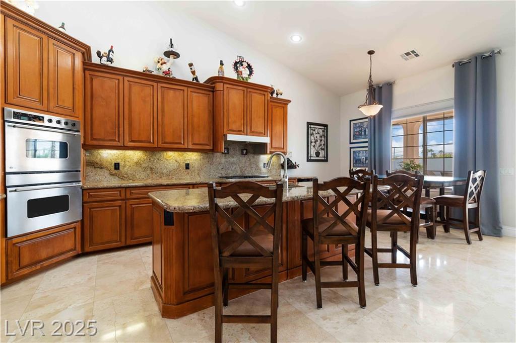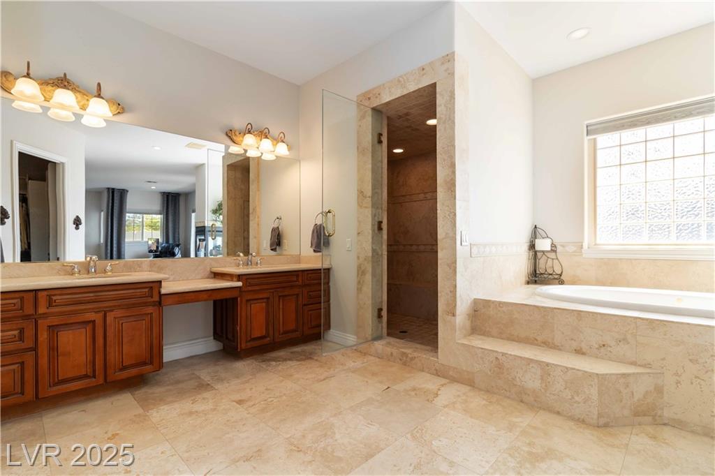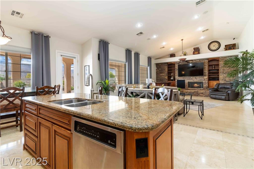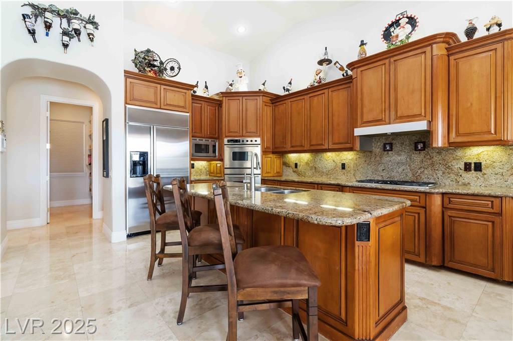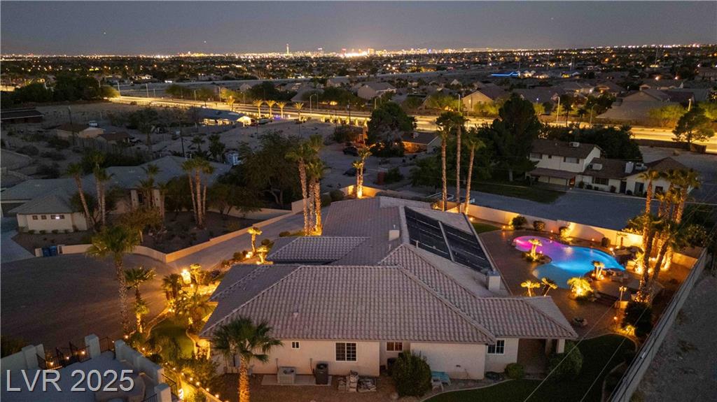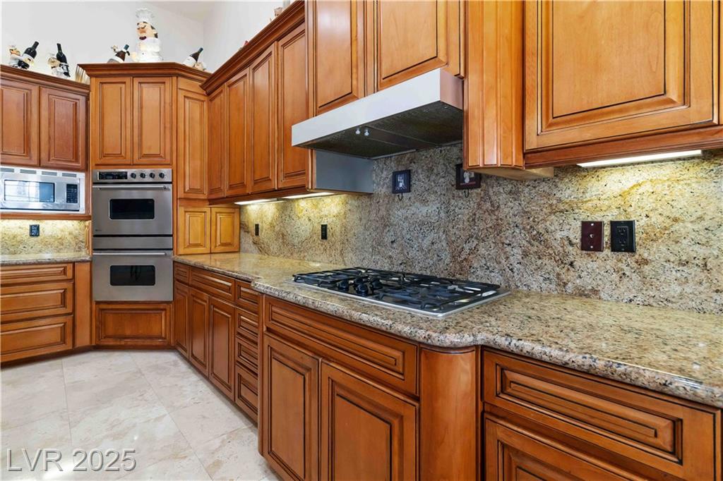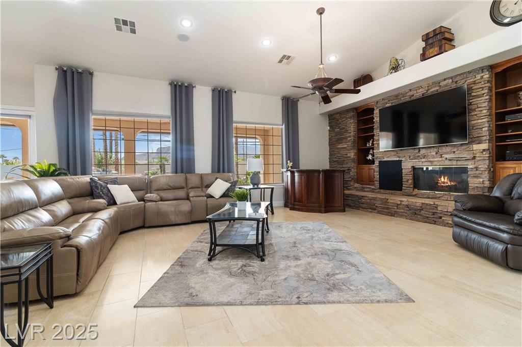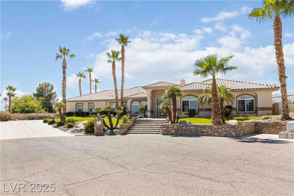 Experience impeccable luxury living in this stunning custom single-story retreat on over ½ acre in the prestigious Lone Mountain area with no HOA! A bright, open layout with soaring ceilings and travertine floors flows from the formal dining room to a spacious great room with surround sound. The chef’s kitchen dazzles with granite counters & backsplash, a center island, stainless appliances with built-in fridge & walk-in pantry. All 4 bedrooms boast en-suites, while the lavish primary suite offers a dual-sided fireplace, a spa-inspired bath with a walk-in closet and hidden storage. An oversized 3-car garage, water softener & whole-home security add convenience. Step outdoors into the resort-style backyard with sparkling pool, grotto waterfall, solar heating, above-ground spa, built-in BBQ kitchen, lush palm trees & low-maintenance turf. Perfect for entertaining or serene relaxation, this home in every aspect blends a meticulous design with a lifestyle of unparalleled refinement.
