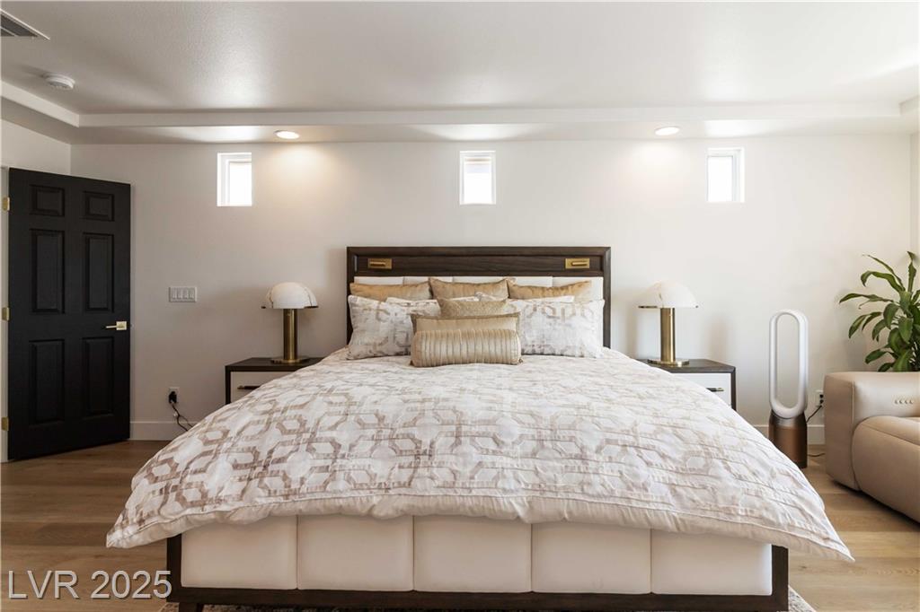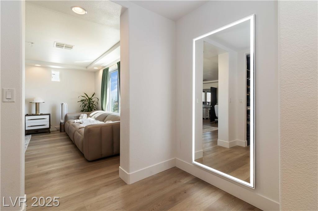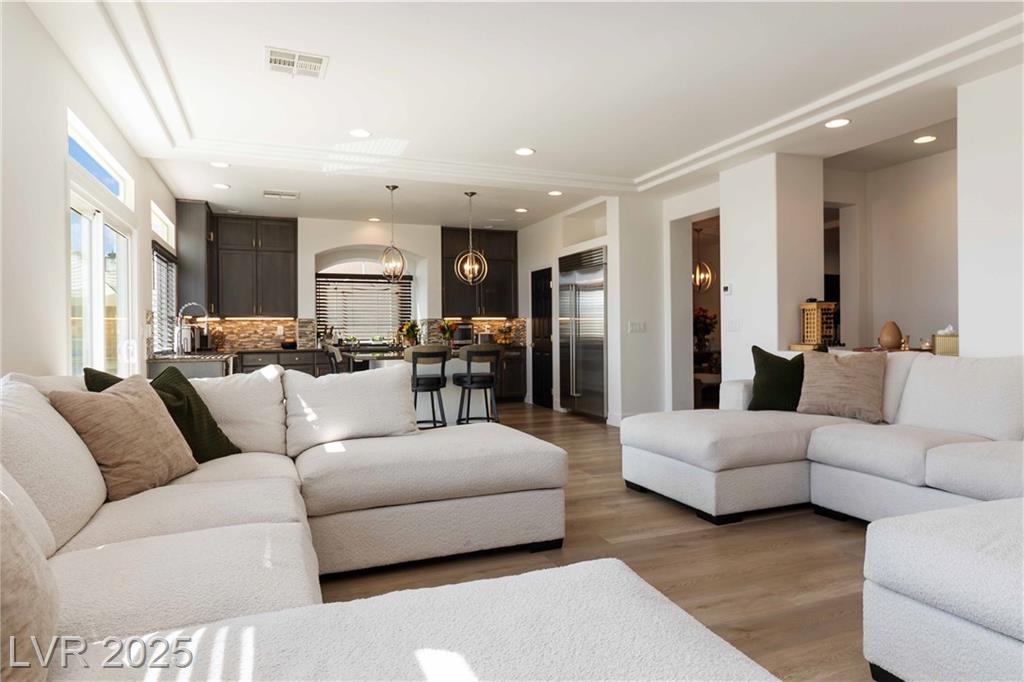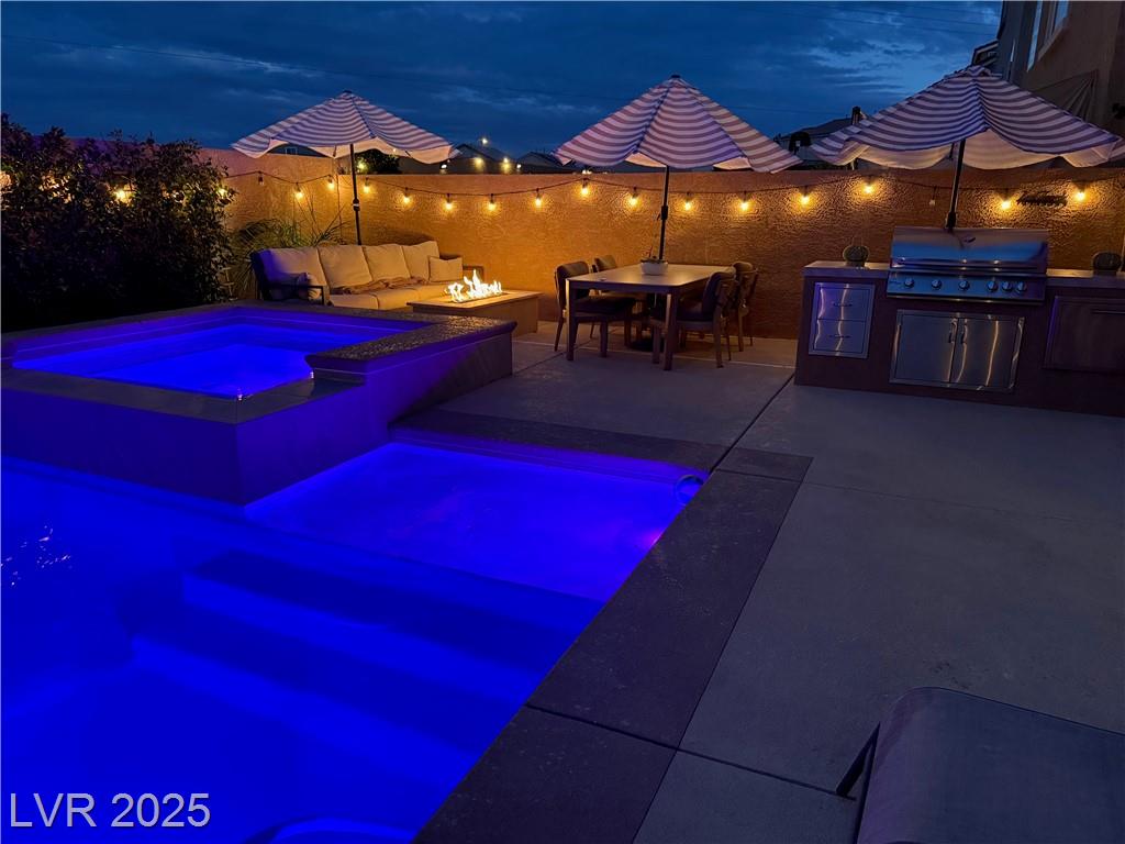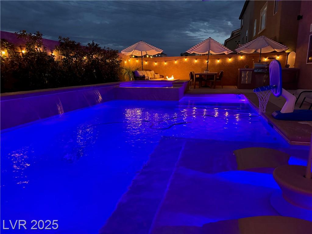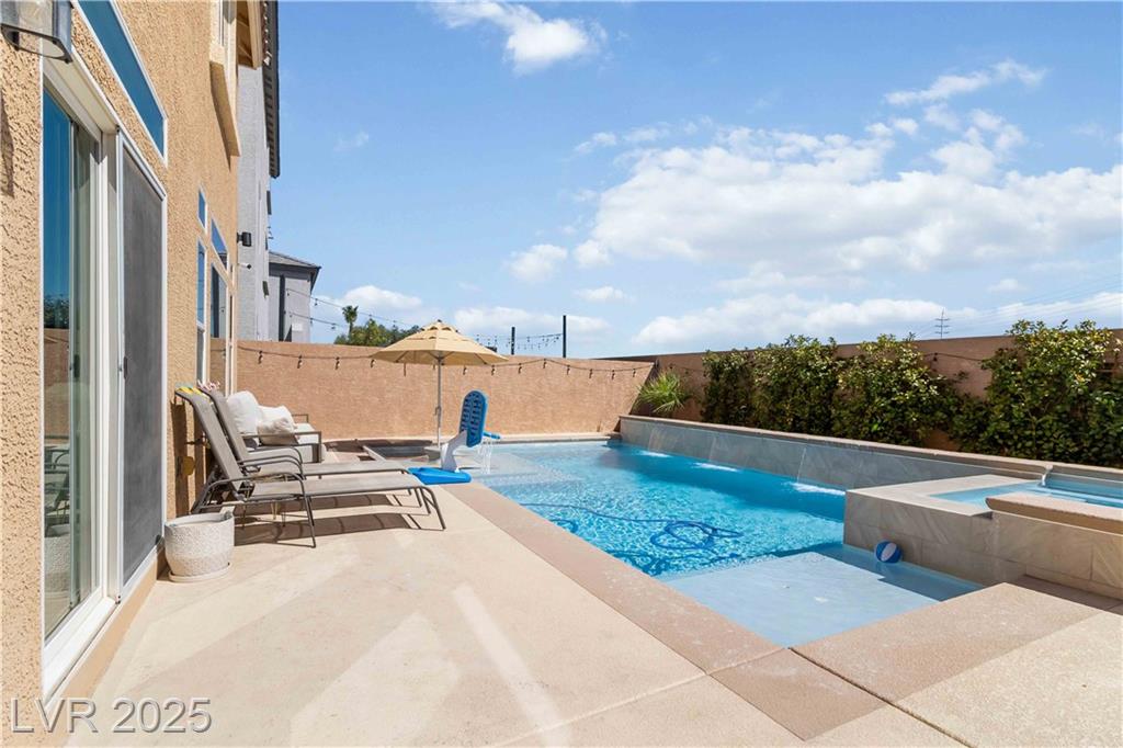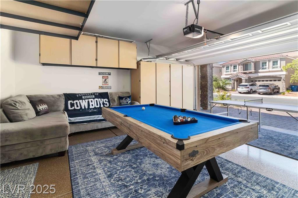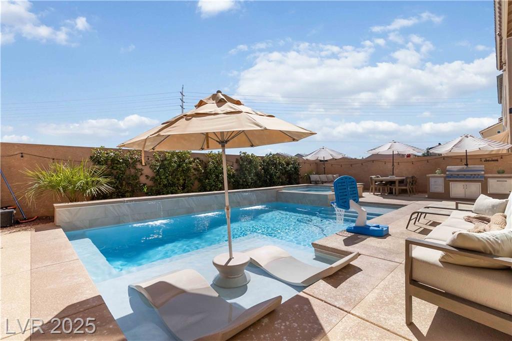 Stunning fully furnished 3-bedroom, 3.5-bath residence with a 2-car garage converted into a game room (option to revert back). This home offers a beautiful private desert oasis featuring a sparkling saltwater pool and spa with waterfall, fire pit, and built-in BBQ kitchen. Inside, enjoy elegant flooring throughout, and an open family room filled with natural light. The chef’s gourmet kitchen boasts a lovely garden window, Sub-Zero refrigerator, stainless steel appliances and custom built pantry. The primary suite captures breathtaking city and Strip views and includes a fabulous designer-built custom closet. A spacious junior suite adds to the home’s appeal. Perfectly situated near premier schools, upscale shopping, freeway access, Allegiant Stadium, the Las Vegas Strip, and the airport—this residence beautifully blends elegance with convenience. Rent includes professional pool service and landscaping for a relaxing, worry-free lifestyle!