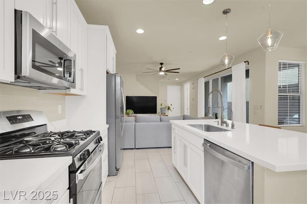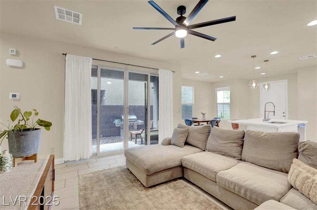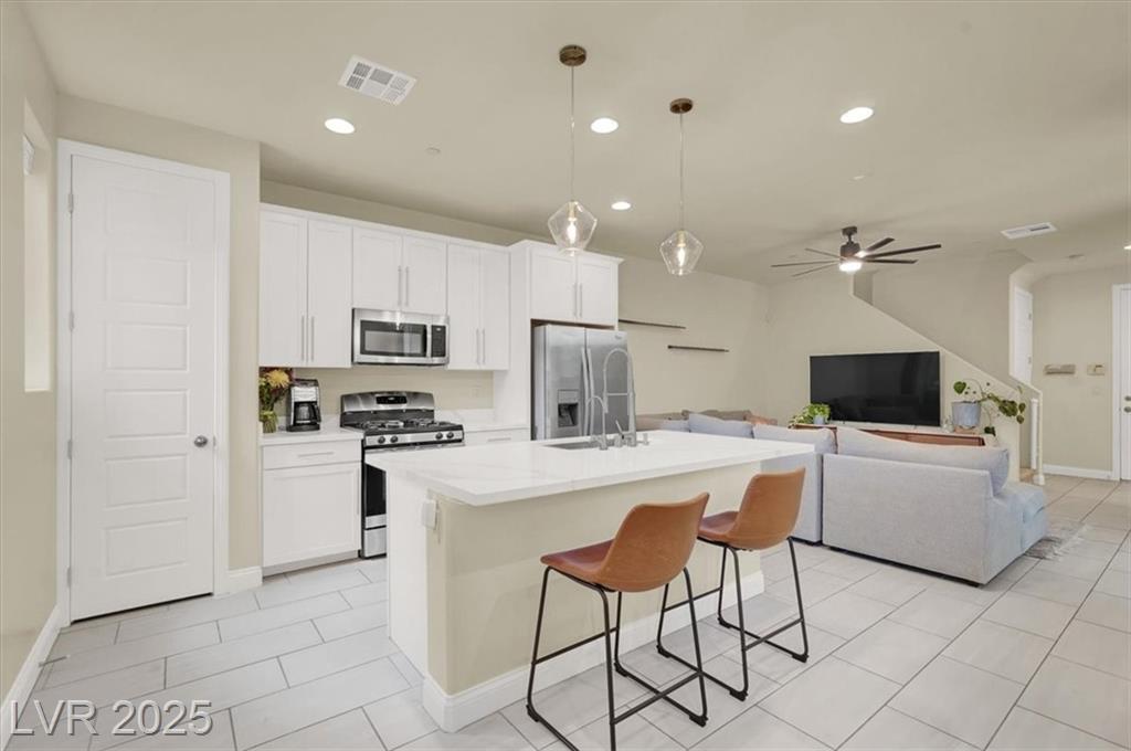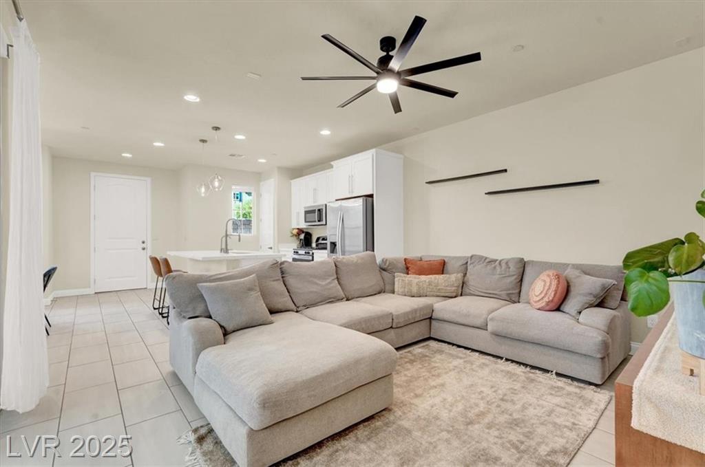 Welcome to Moro Rock at Red Point in Summerlin! This stunning townhome features 3 bedrooms, 2.5 bathrooms, and 1,556 sq. ft. of thoughtfully designed living space. The open kitchen is highlighted by sleek quartz countertops, stainless steel appliances, and ample cabinetry, flowing seamlessly into the dining and living areas. Fresh interior paint and tile flooring throughout the main level create a clean, modern feel. Upstairs, spacious bedrooms and well-appointed baths provide comfort and convenience. Ideally located near Downtown Summerlin, Red Rock Casino, dining, shopping, and outdoor recreation. A perfect blend of style and location in the heart of Summerlin.