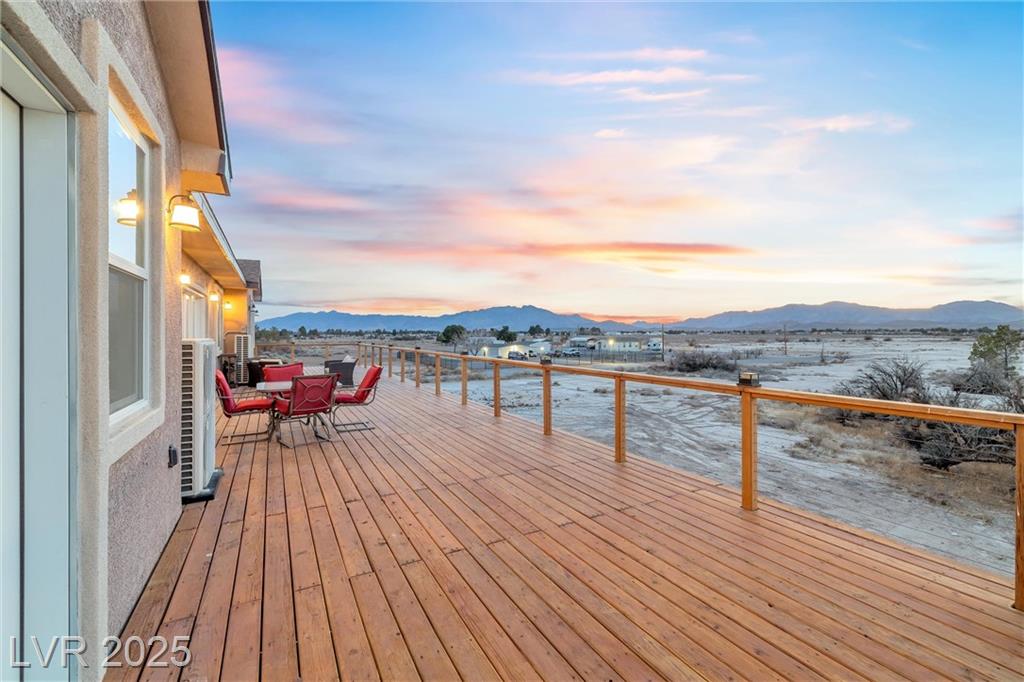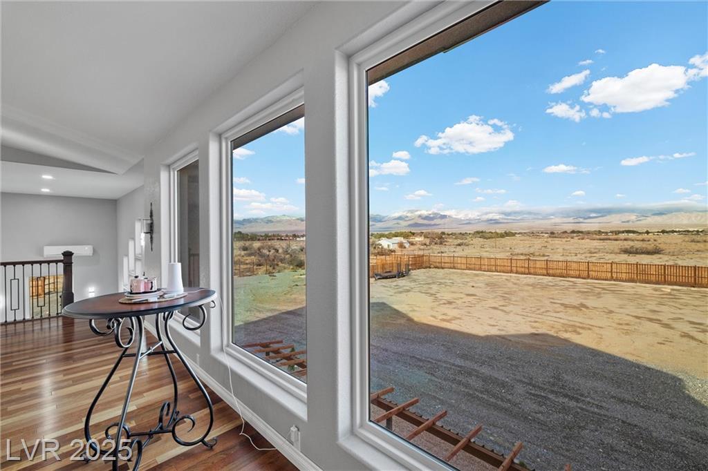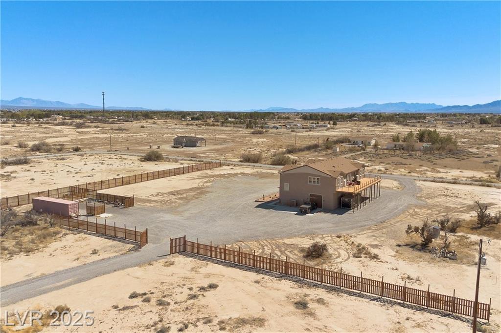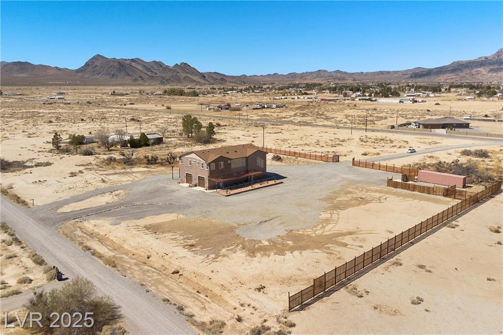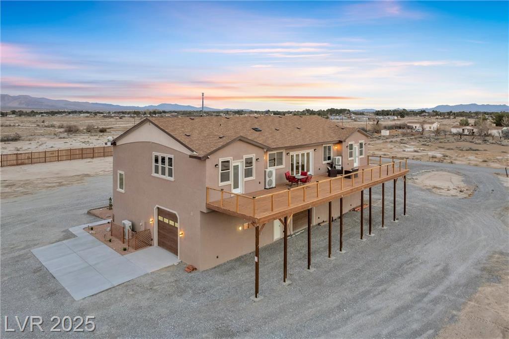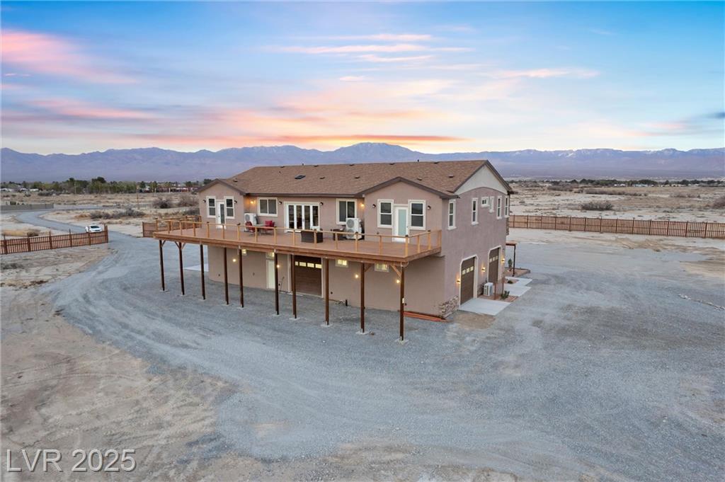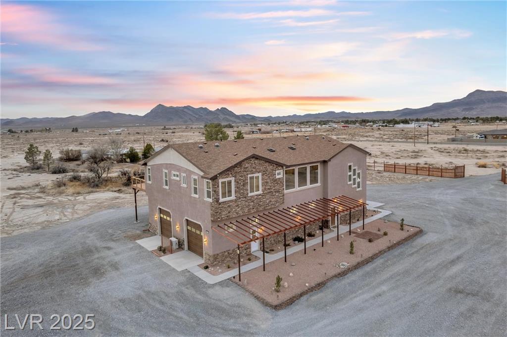 Experience the best of Pahrump living in this one-of-a-kind custom estate designed for motorsports enthusiasts and lovers of wide-open desert beauty. Set on 5 acres with 360° mountain views, this nearly 3,000 sq. ft. home showcases vaulted ceilings, Brazilian cherry wood floors, and a chef’s kitchen with granite countertops and a large island. Dual primary suites open to private balconies for breathtaking sunrises and sunsets. A matching 3,000 sq. ft. climate-controlled garage, covered RV parking with full hookups and 50-amp power, plus an oversized dumbwaiter, two tankless water heaters, LED lighting, and pre-plumbed solar add modern convenience. Just 20 minutes from Spring Mountain Motor Resort & about an hour from Las Vegas, this property blends luxury, function, and lifestyle, offering the freedom, space, and amenities that make Pahrump truly special. This home is more than a residence—it’s a lifestyle!