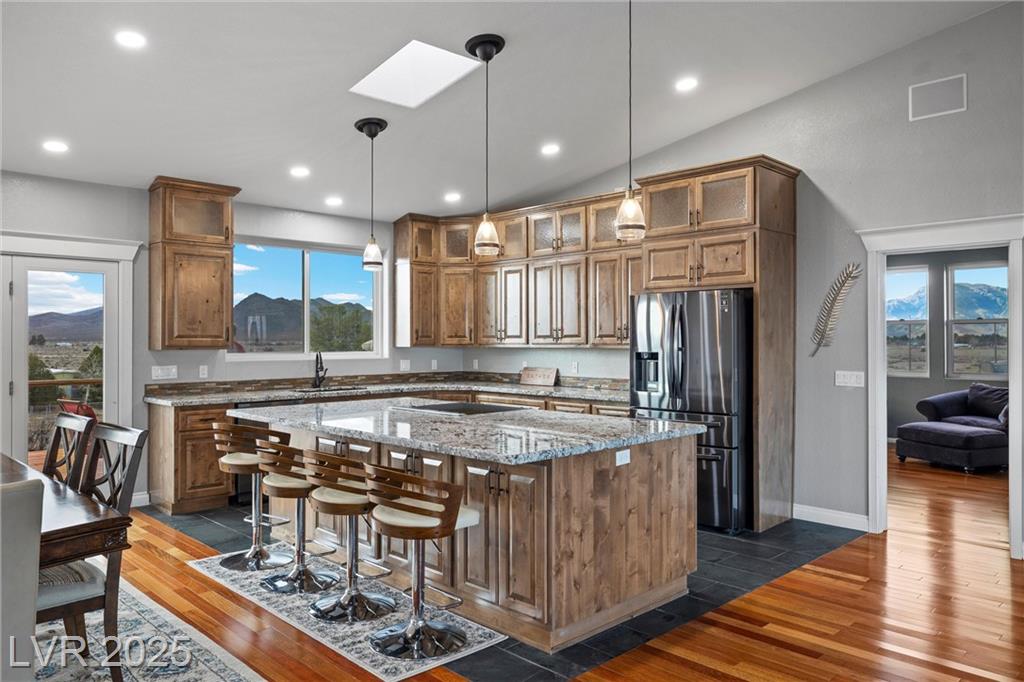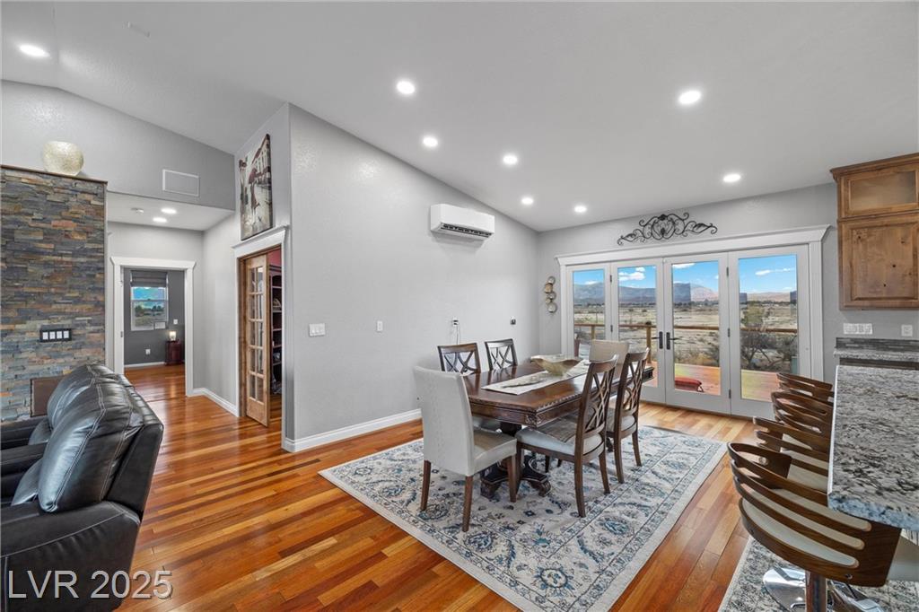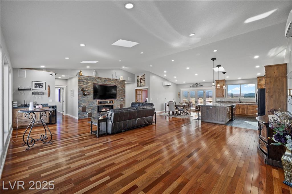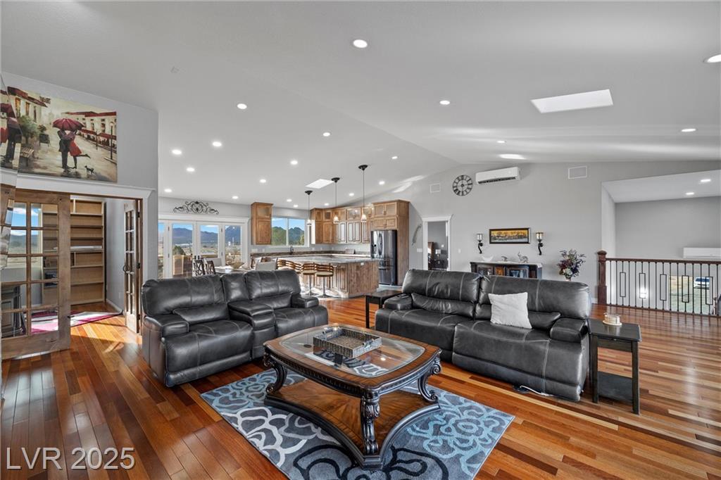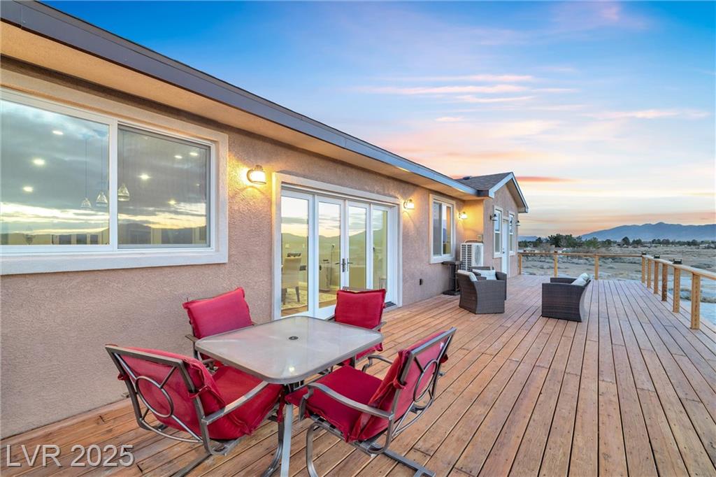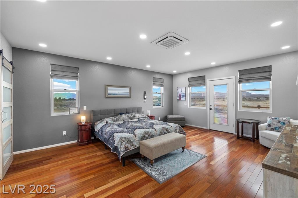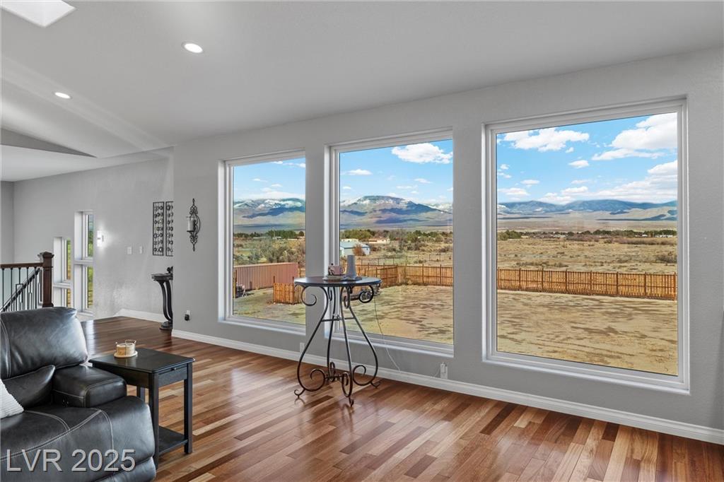 Experience the best of Pahrump living in this one-of-a-kind custom estate designed for motorsports enthusiasts and lovers of wide-open desert beauty. Set on 5 acres with 360° mountain views, this nearly 3,000 sq. ft. home showcases vaulted ceilings, Brazilian cherry wood floors, and a chef’s kitchen with granite countertops and a large island. Dual primary suites open to private balconies for breathtaking sunrises and sunsets. A matching 3,000 sq. ft. climate-controlled garage, covered RV parking with full hookups and 50-amp power, plus an oversized dumbwaiter, two tankless water heaters, LED lighting, and pre-plumbed solar add modern convenience. Just 20 minutes from Spring Mountain Motor Resort & about an hour from Las Vegas, this property blends luxury, function, and lifestyle, offering the freedom, space, and amenities that make Pahrump truly special. This home is more than a residence—it’s a lifestyle!
