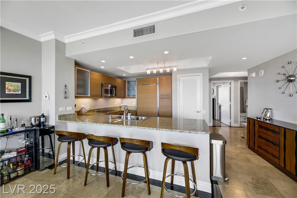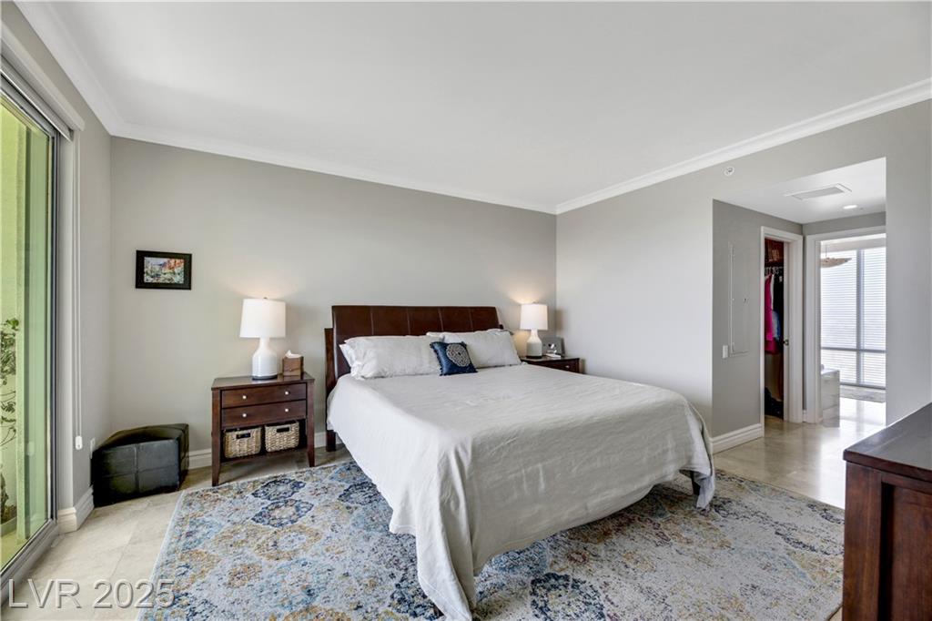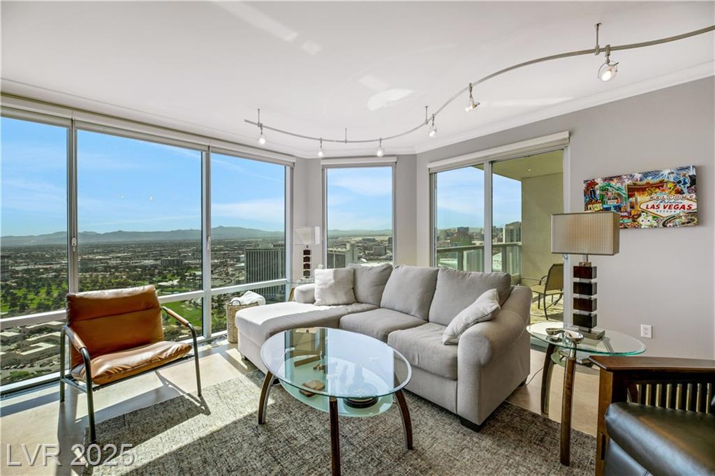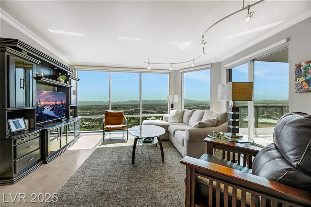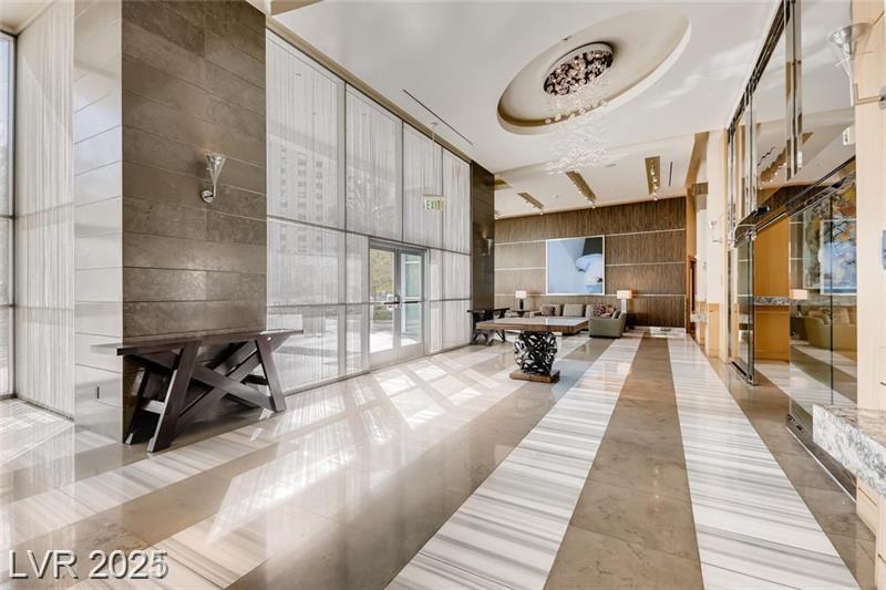 Fully furnished 2 bedroom/2 bath residence with floor-to-ceiling windows offering breathtaking views of the historic Las Vegas Country Club Golf Course, the Las Vegas strip, MSG Sphere and sweeping mountains. Resort-style living w/ luxury amenities which include fitness center, pool and spa, 2 pet parks, tennis courts, pickleball, golf green, social room, conference center, 24-hour security, valet, concierges and more. Significant Turnberry Resident perks at the LVCC Golf Course & neighboring casinos.