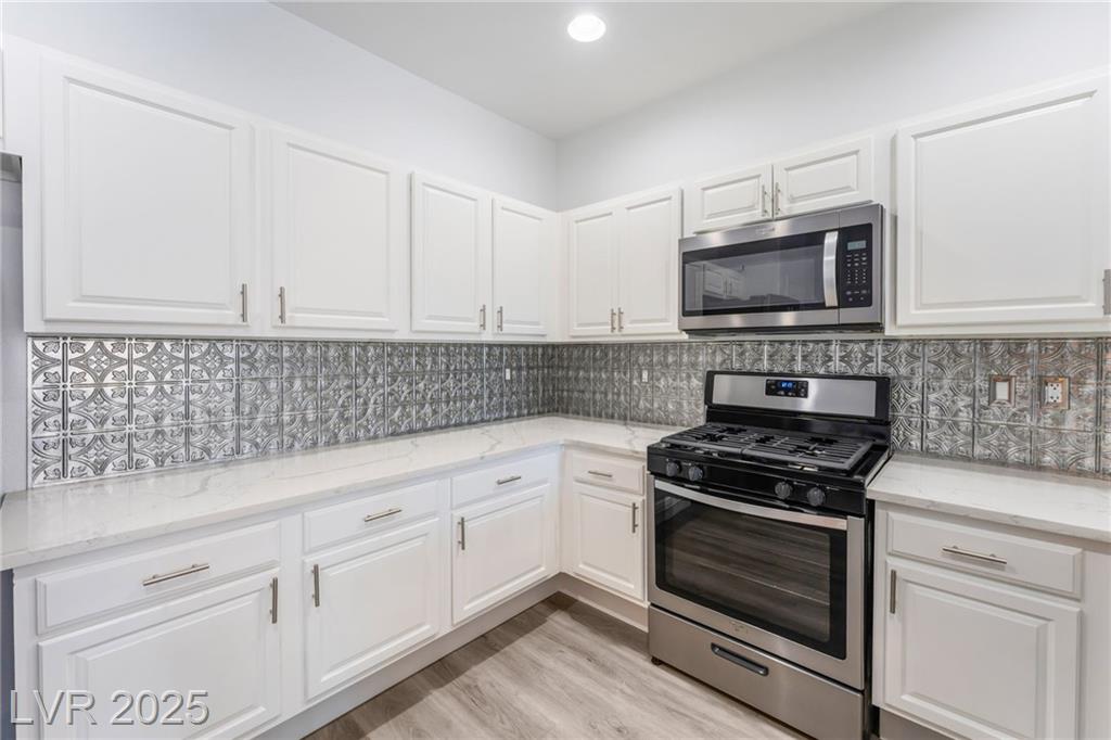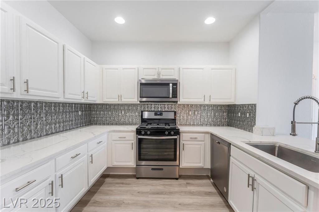 This may be the most beautifully remodeled condo in the neighborhood! Move-in ready 2-bed, 2-bath home on the 1st floor with new luxury vinyl plank flooring, new carpet, fresh paint, new doors, and modern light fixtures. The kitchen boasts resurfaced cabinets and new sleek quartz countertops—perfect for cooking or entertaining. A versatile flex space serves as an office, desk room, pantry, and doubles as a laundry room, adding convenience and functionality. Bathrooms feature new vanities and resurfaced enclosures. Just steps from the sparkling community pool, this open, wheelchair-accessible layout flows effortlessly. Enjoy gated community living with a clubhouse, pool, and parks. Close to Nellis Air Force Base, shopping, dining, and everyday essentials, this condo offers style, convenience, and value. Don’t miss your chance to own a home that’s as functional as it is stunning!