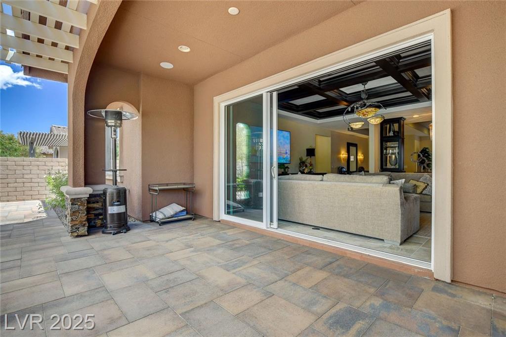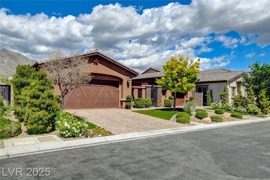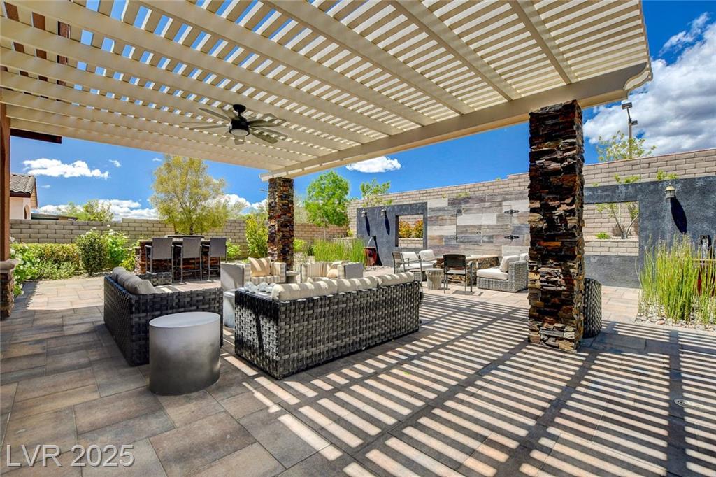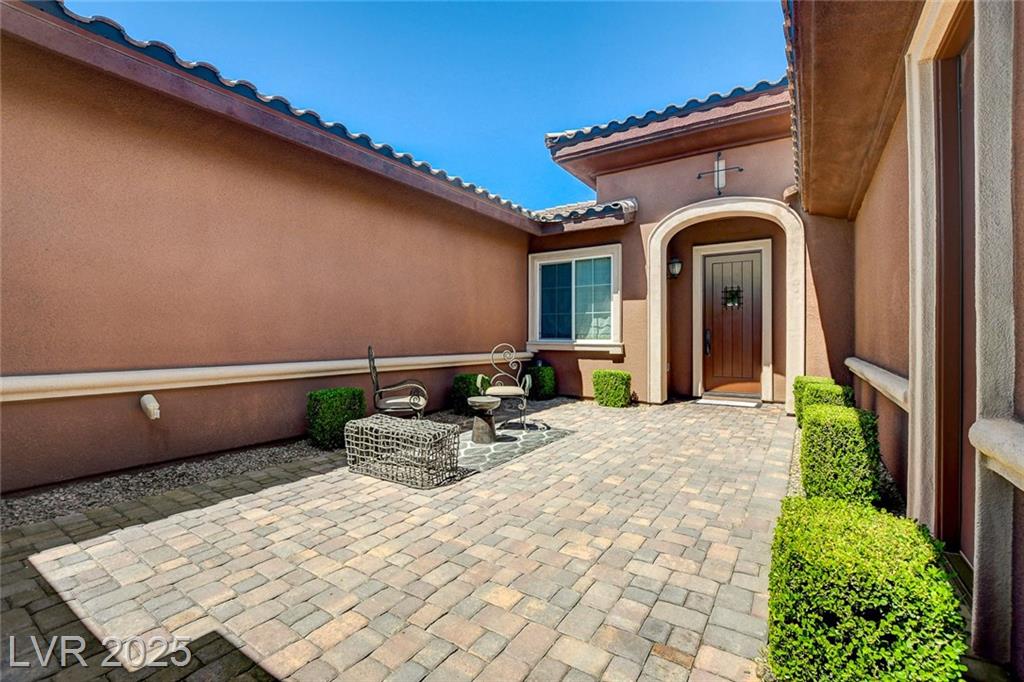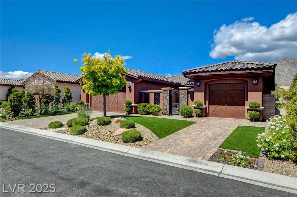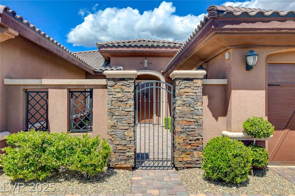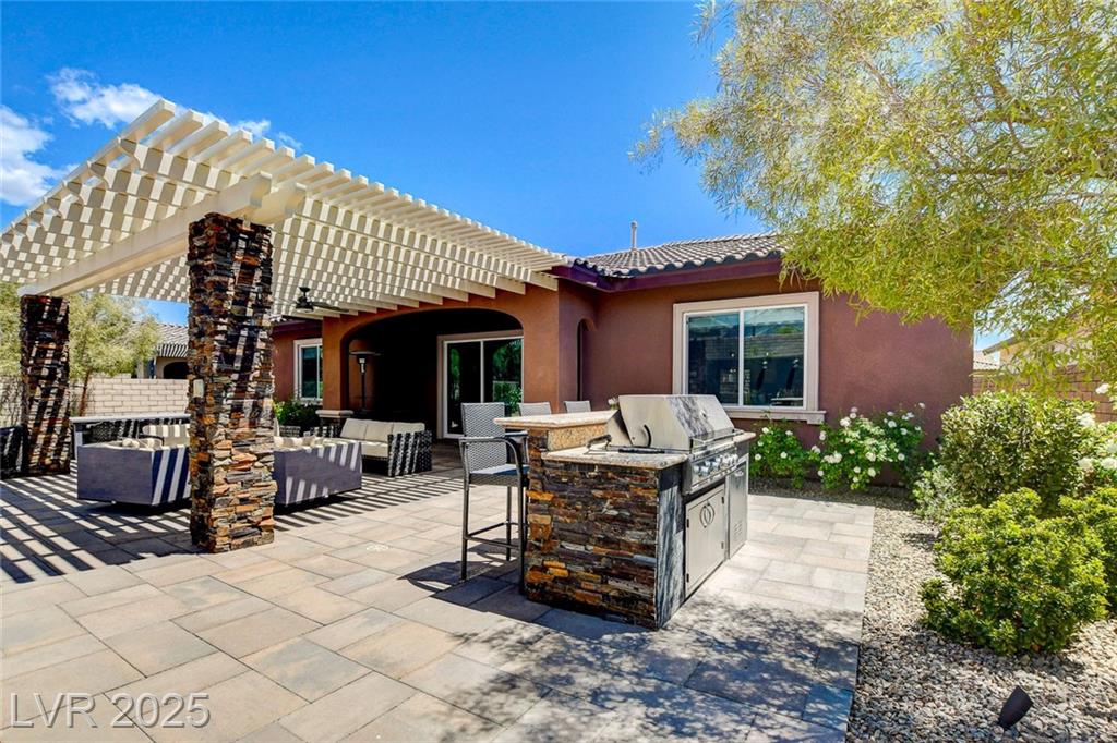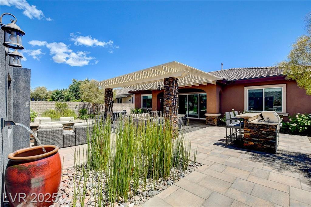 Stunning single-story luxury home located in a prestigious gated Summerlin community. This home offers a spacious 3-car garage that’s pre-wired for an EV charger, inviting courtyard entry, and high-end finishes throughout. The chef’s kitchen opens to the living room and features JennAir double ovens, a large gas cooktop, and generous counter space. The living room is accented with coffered ceilings, custom built-ins, and a large pocket slider that seamlessly connects indoor and outdoor living. Step outside to an entertainer’s dream backyard complete with a covered patio, outdoor kitchen, fire pit, water feature, and multiple seating areas. The primary suite feels like a private retreat, showcasing a spa-inspired bathroom with dual sinks, an oversized shower, 2 separate walk-in closets with custom built-ins. Two additional bedrooms share a Jack-and-Jill bathroom, each offering ample space and comfort. This home blends elegance, functionality, and luxury living in the heart of Summerlin.
