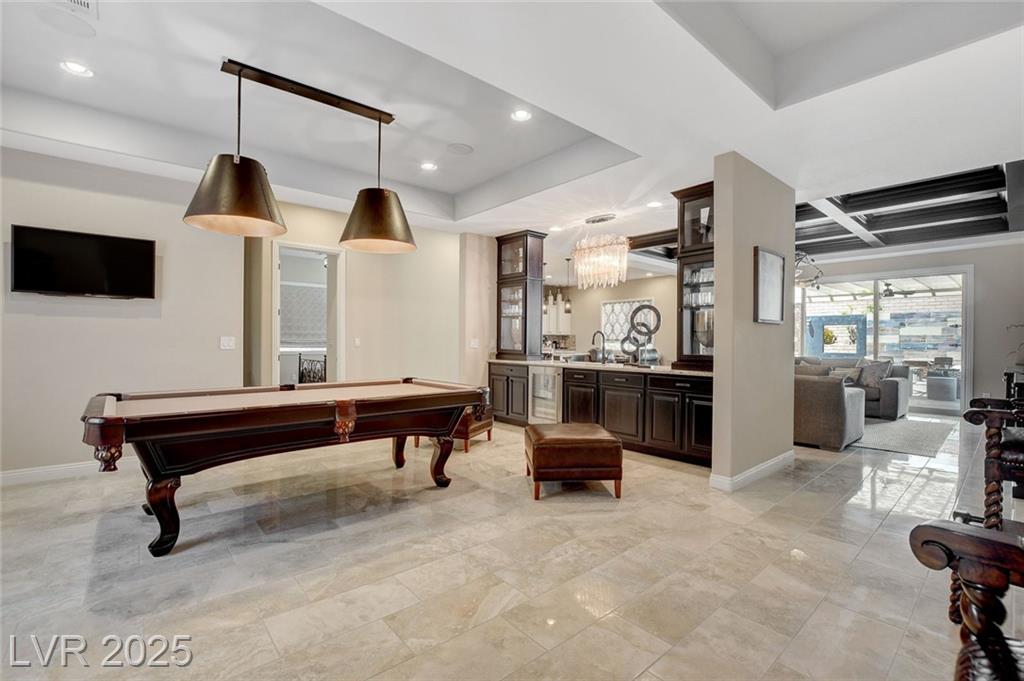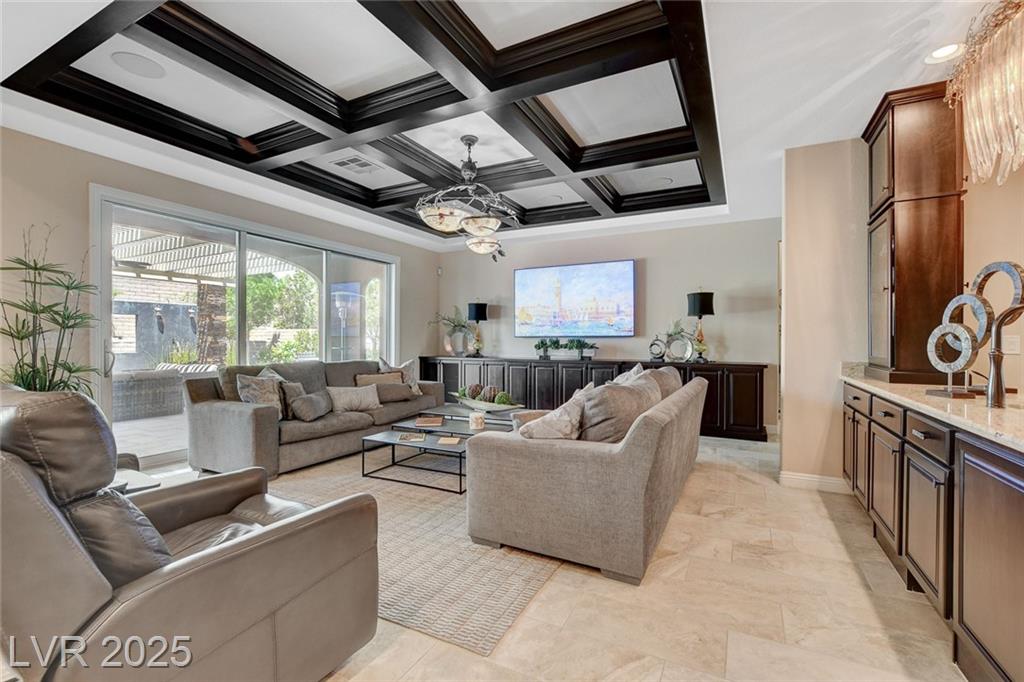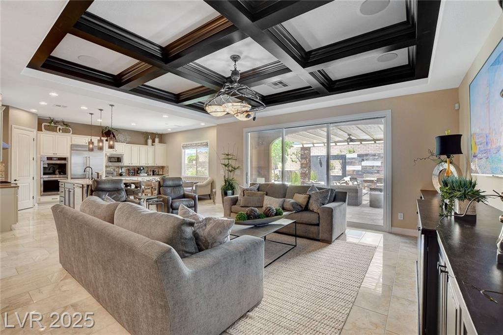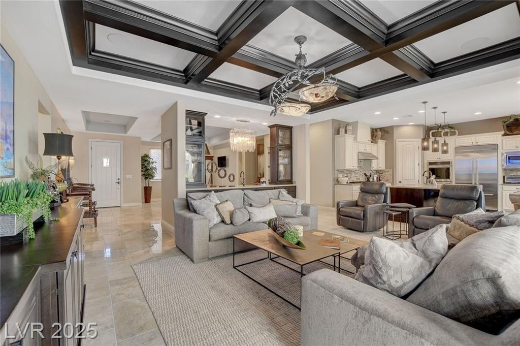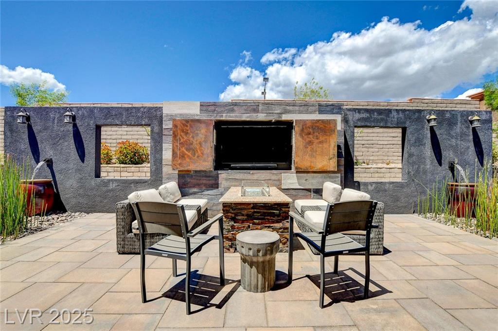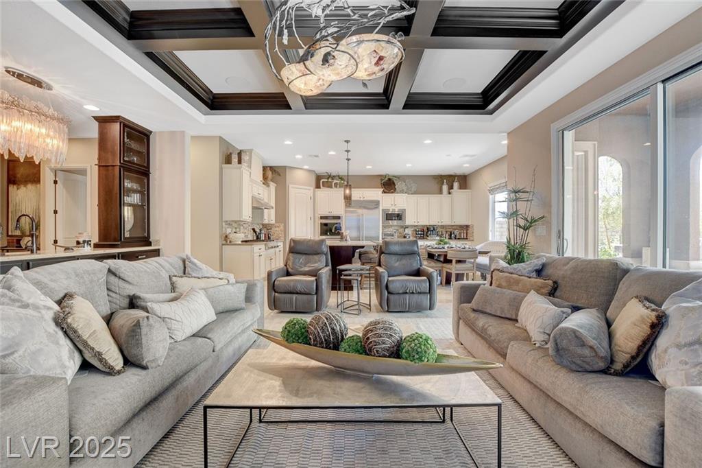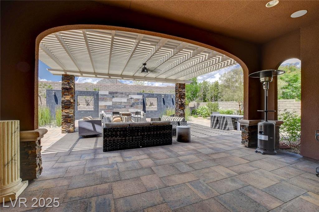 Stunning single-story luxury home located in a prestigious gated Summerlin community. This home offers a spacious 3-car garage that’s pre-wired for an EV charger, inviting courtyard entry, and high-end finishes throughout. The chef’s kitchen opens to the living room and features JennAir double ovens, a large gas cooktop, and generous counter space. The living room is accented with coffered ceilings, custom built-ins, and a large pocket slider that seamlessly connects indoor and outdoor living. Step outside to an entertainer’s dream backyard complete with a covered patio, outdoor kitchen, fire pit, water feature, and multiple seating areas. The primary suite feels like a private retreat, showcasing a spa-inspired bathroom with dual sinks, an oversized shower, 2 separate walk-in closets with custom built-ins. Two additional bedrooms share a Jack-and-Jill bathroom, each offering ample space and comfort. This home blends elegance, functionality, and luxury living in the heart of Summerlin.