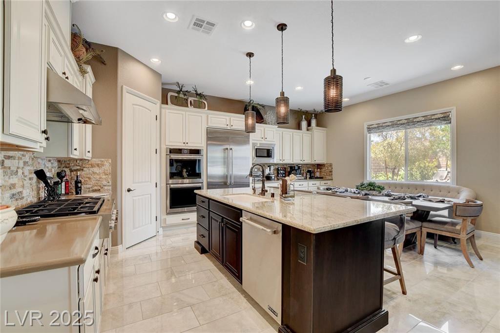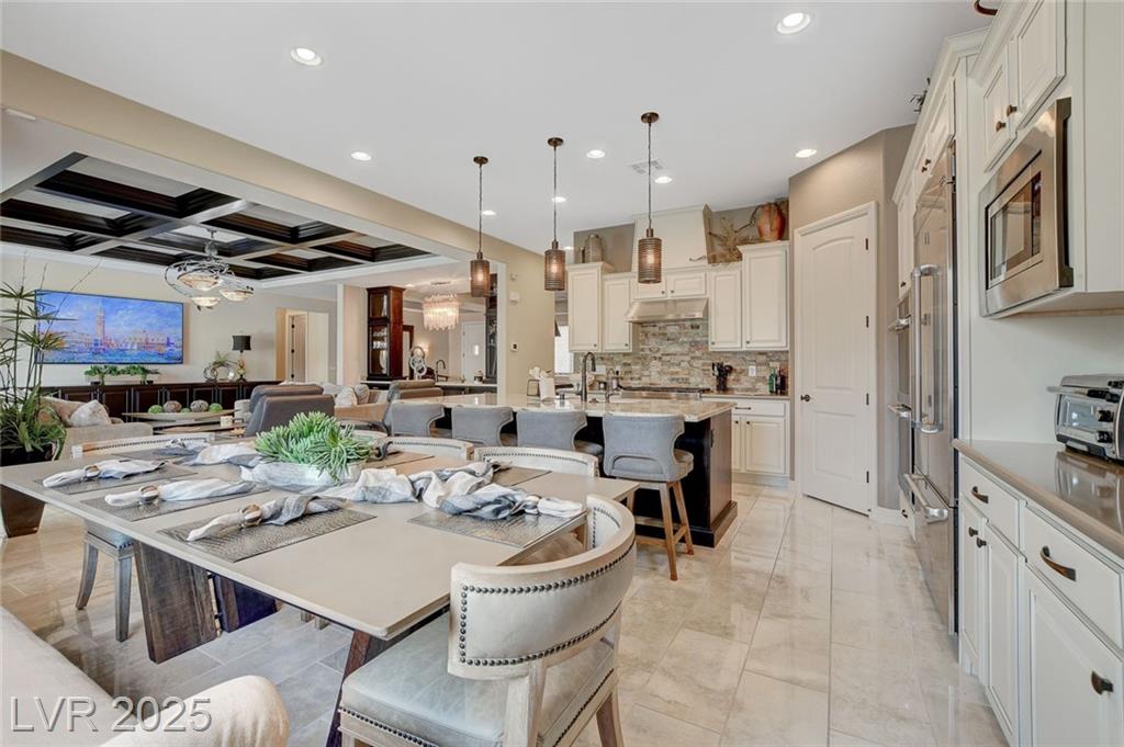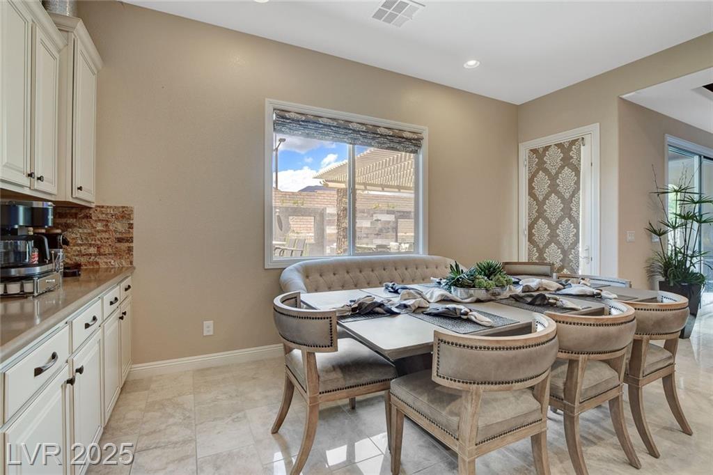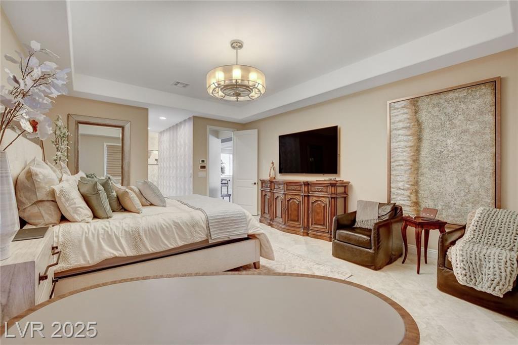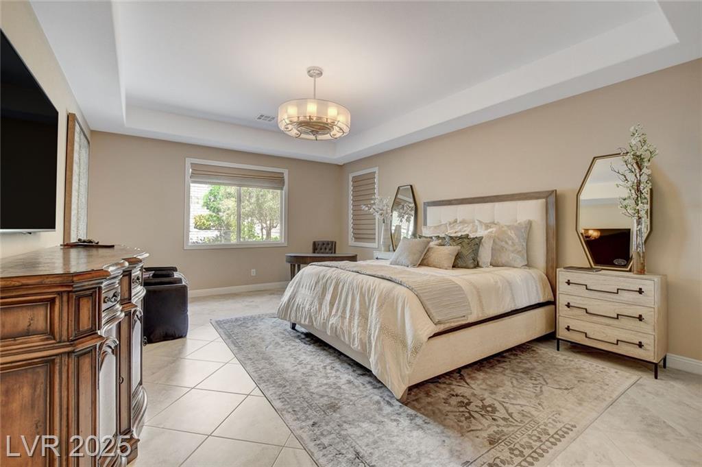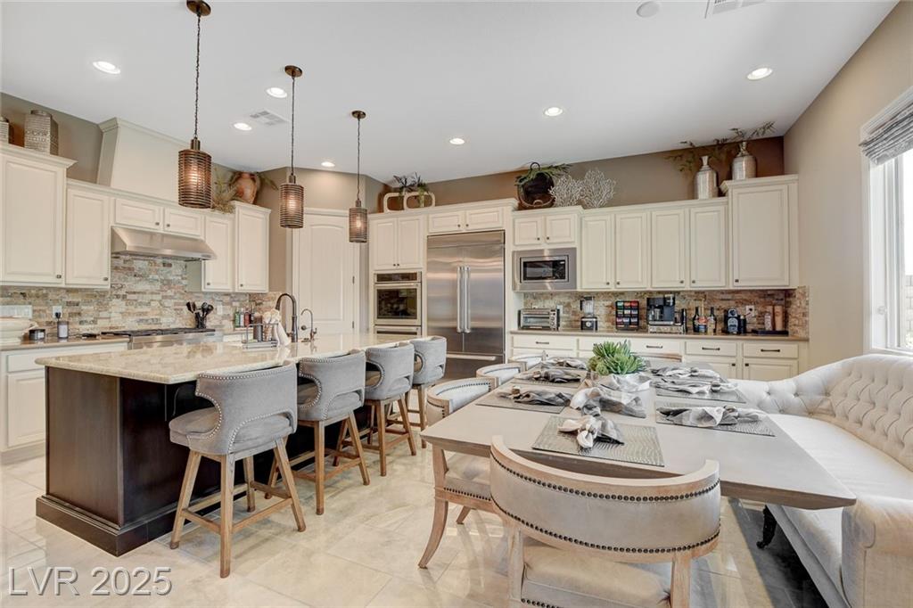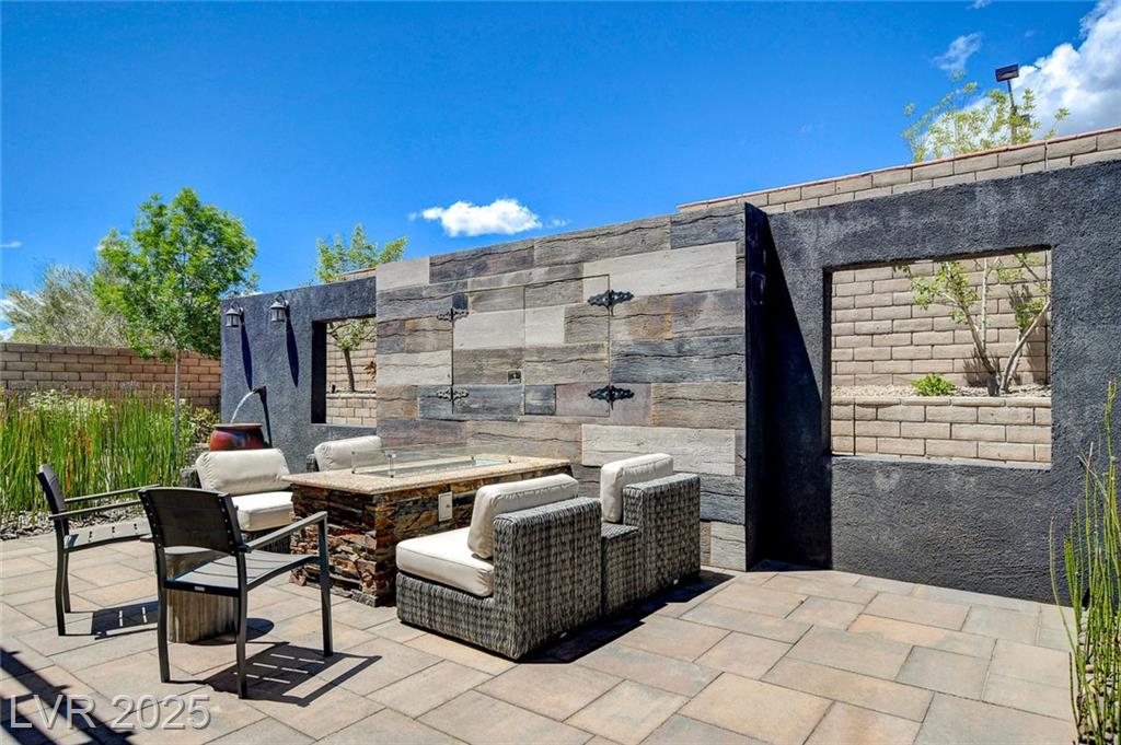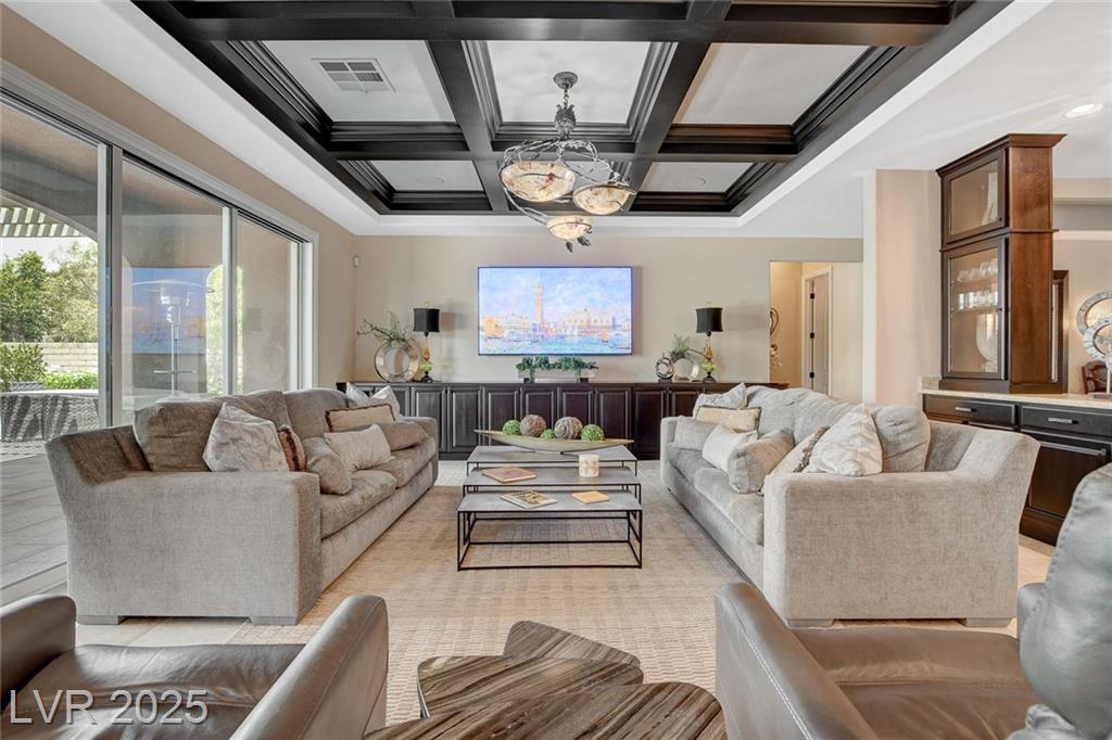 Stunning single-story luxury home located in a prestigious gated Summerlin community. This home offers a spacious 3-car garage that’s pre-wired for an EV charger, inviting courtyard entry, and high-end finishes throughout. The chef’s kitchen opens to the living room and features JennAir double ovens, a large gas cooktop, and generous counter space. The living room is accented with coffered ceilings, custom built-ins, and a large pocket slider that seamlessly connects indoor and outdoor living. Step outside to an entertainer’s dream backyard complete with a covered patio, outdoor kitchen, fire pit, water feature, and multiple seating areas. The primary suite feels like a private retreat, showcasing a spa-inspired bathroom with dual sinks, an oversized shower, 2 separate walk-in closets with custom built-ins. Two additional bedrooms share a Jack-and-Jill bathroom, each offering ample space and comfort. This home blends elegance, functionality, and luxury living in the heart of Summerlin.