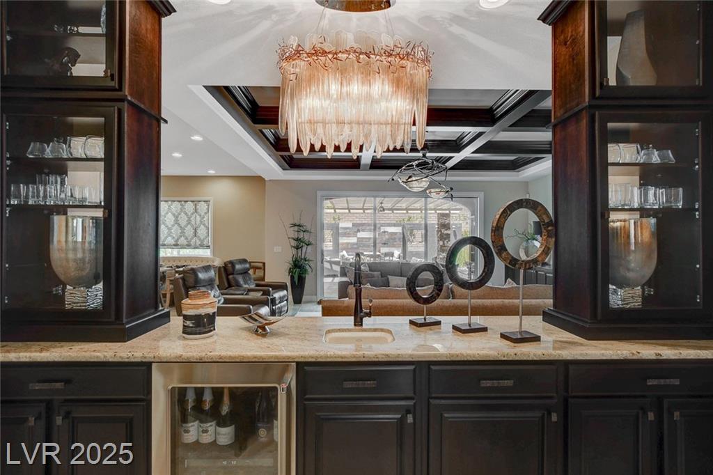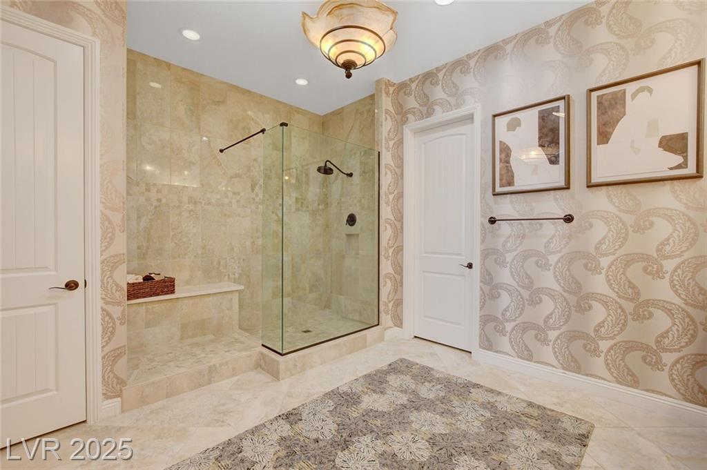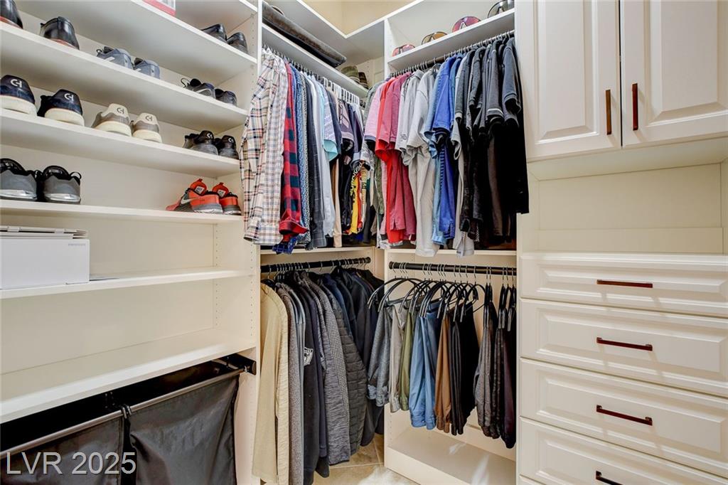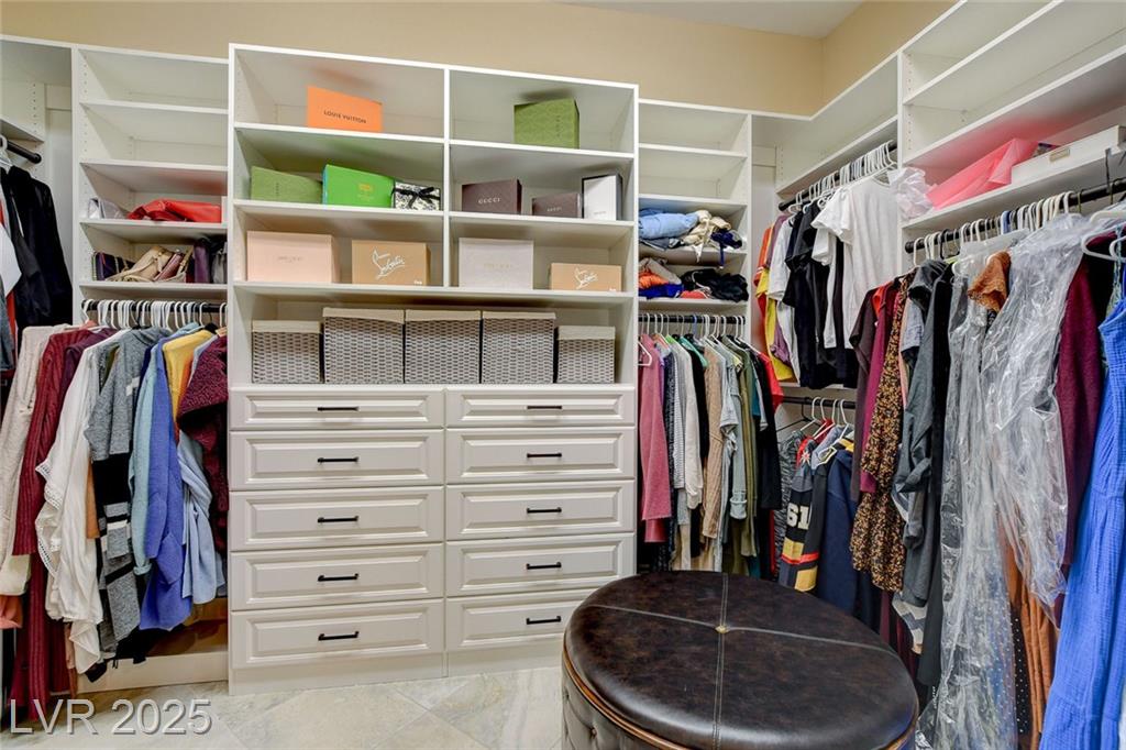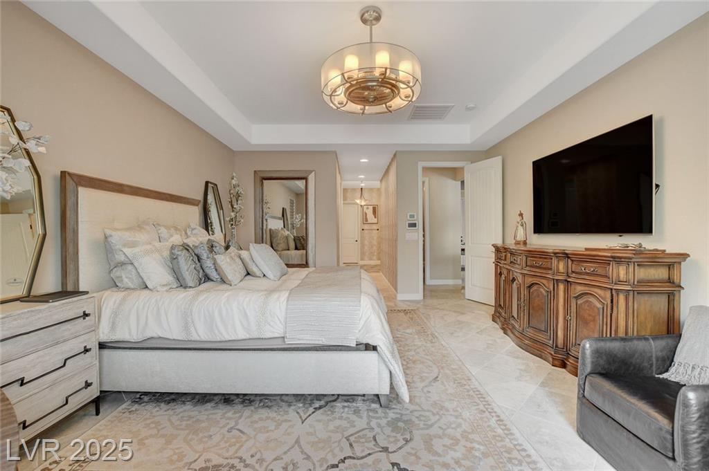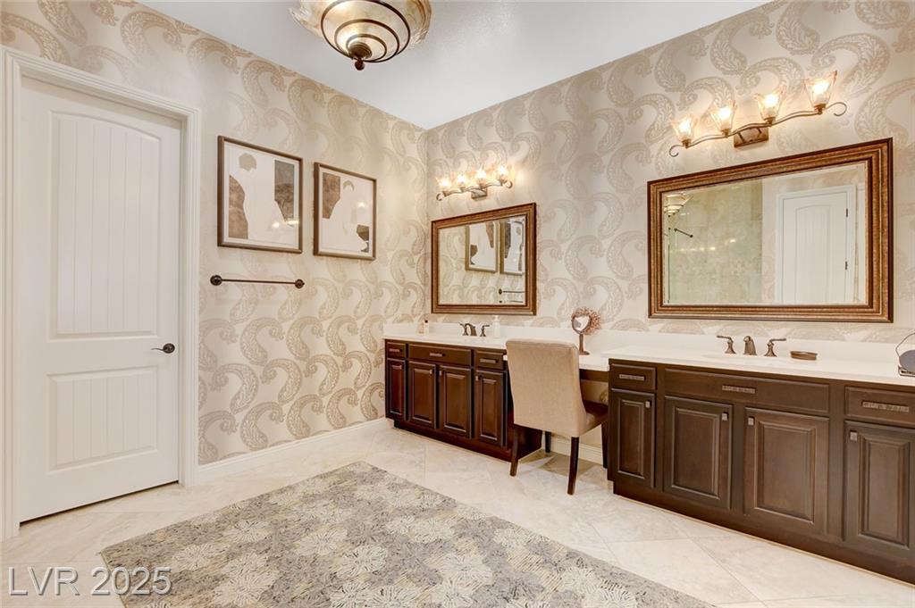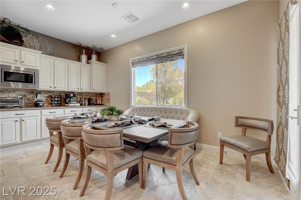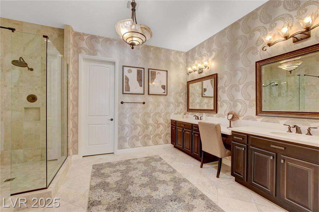 Stunning single-story luxury home located in a prestigious gated Summerlin community. This home offers a spacious 3-car garage that’s pre-wired for an EV charger, inviting courtyard entry, and high-end finishes throughout. The chef’s kitchen opens to the living room and features JennAir double ovens, a large gas cooktop, and generous counter space. The living room is accented with coffered ceilings, custom built-ins, and a large pocket slider that seamlessly connects indoor and outdoor living. Step outside to an entertainer’s dream backyard complete with a covered patio, outdoor kitchen, fire pit, water feature, and multiple seating areas. The primary suite feels like a private retreat, showcasing a spa-inspired bathroom with dual sinks, an oversized shower, 2 separate walk-in closets with custom built-ins. Two additional bedrooms share a Jack-and-Jill bathroom, each offering ample space and comfort. This home blends elegance, functionality, and luxury living in the heart of Summerlin.