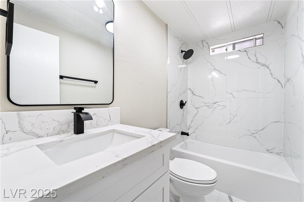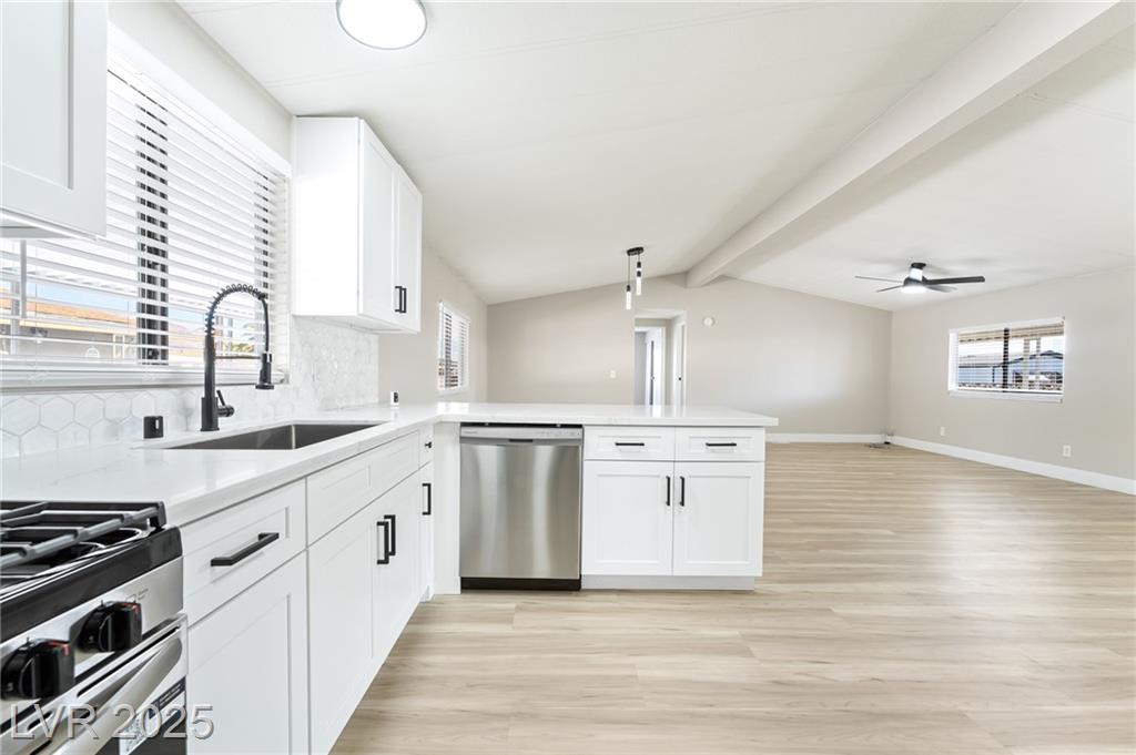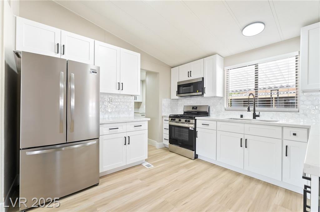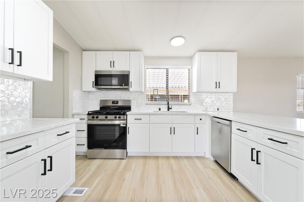STUNNING FULLY RENOVATED HOME WITH NO LAND LEASE. No expense spared! 3 remodeled Bedrooms, 2 newly remodeled bathrooms  with new custom tile, new cabinets, mosaic designs, and quartz countertops. Open floor plan with Family room. NEW ROOF. Kitchen and bathrooms all have beautiful Luxury Vinyl Plank, new tile in bathrooms, new carpet in bedrooms and new baseboards Throughout. Freshly painted inside and out. Open kitchen to the family room with New STAINLESS STEEL STOVE, DISHWASHER, MICROWAVE AND REFRIGERATOR!  Home is in DESERT INN MOBILE ESTATES TRACT 1 and there is no age restriction. This property is one of a kind and will not last long!! FHA eligible 10/22/25
