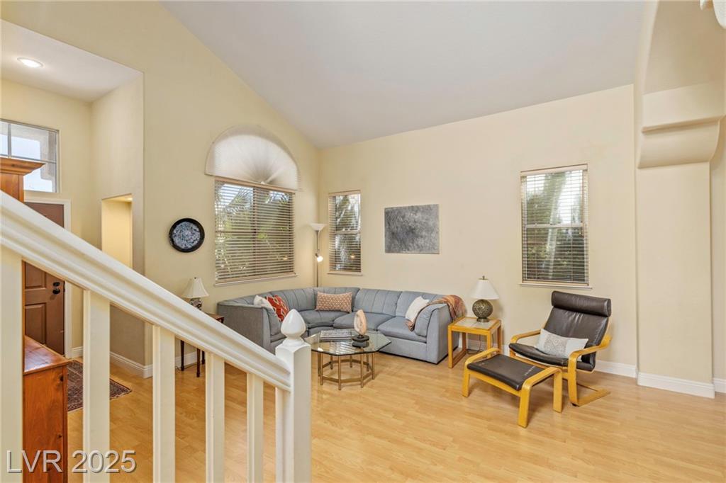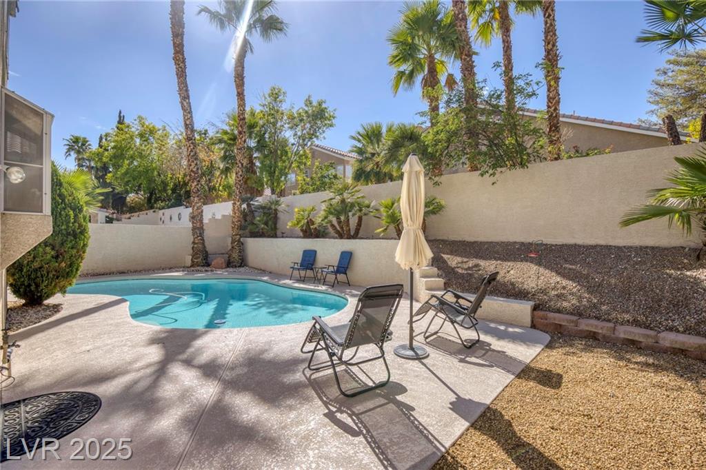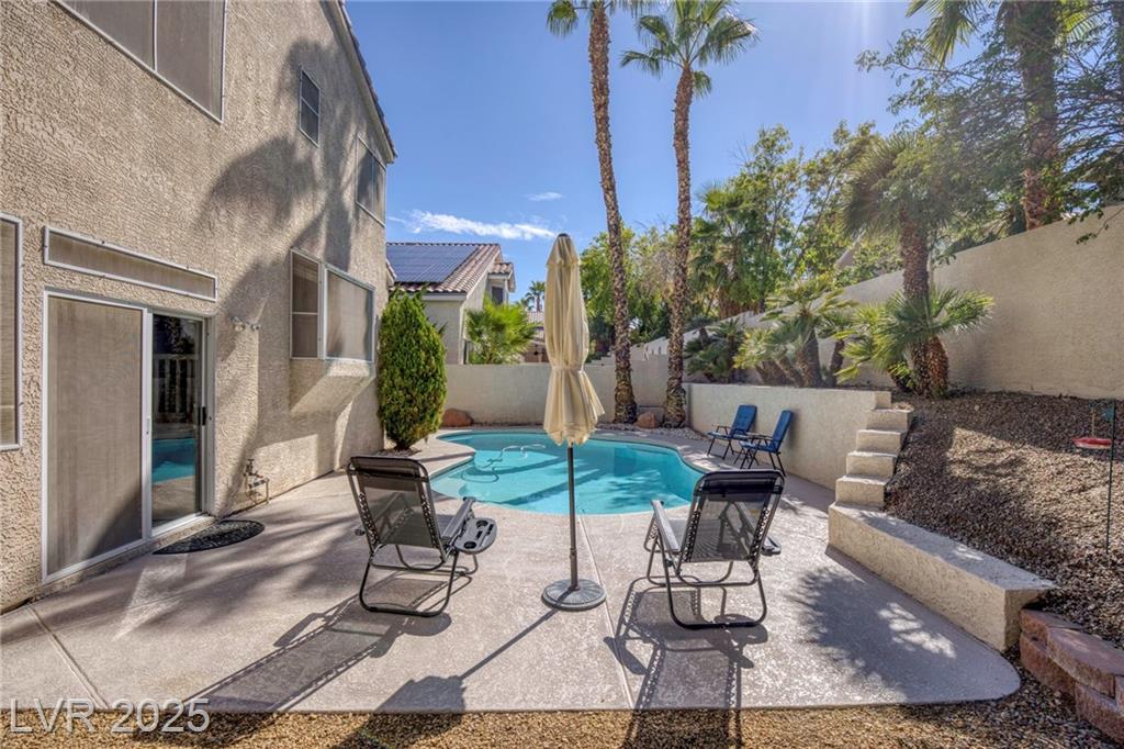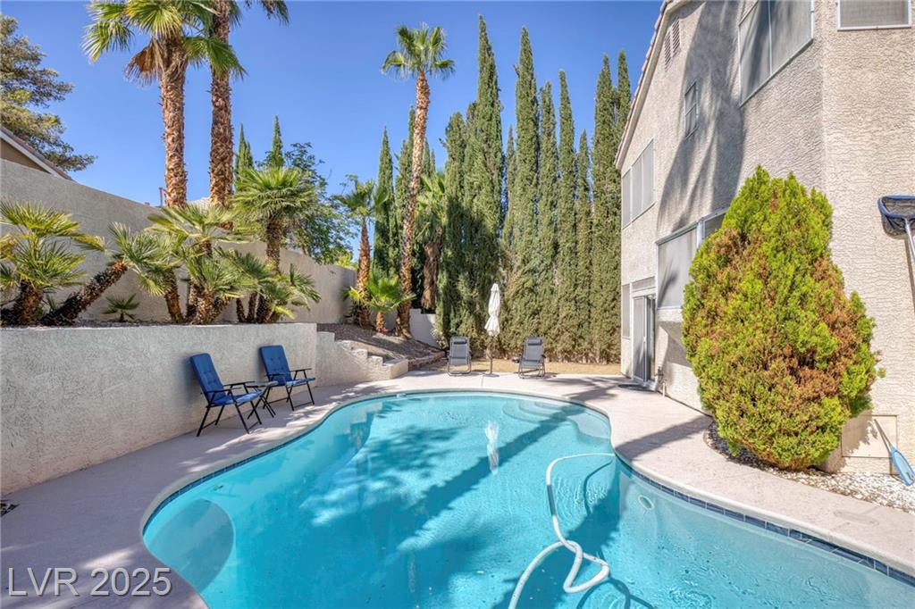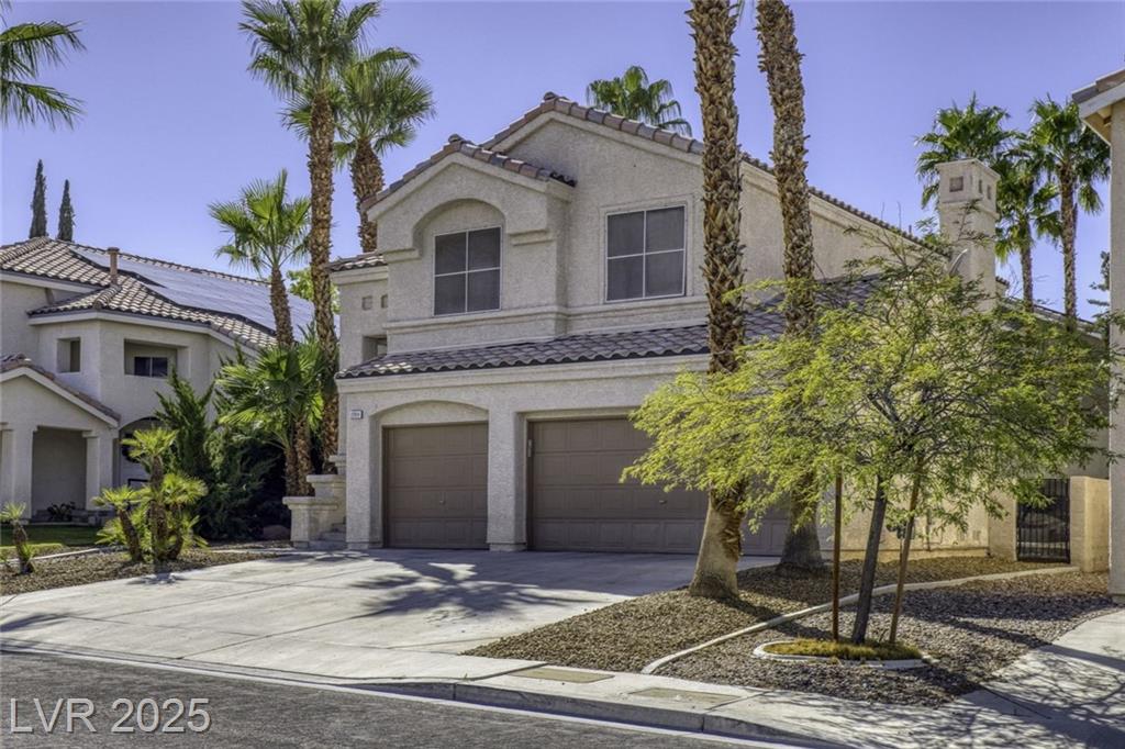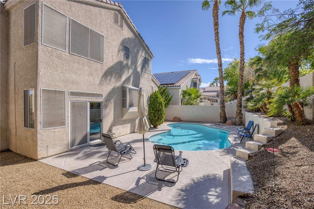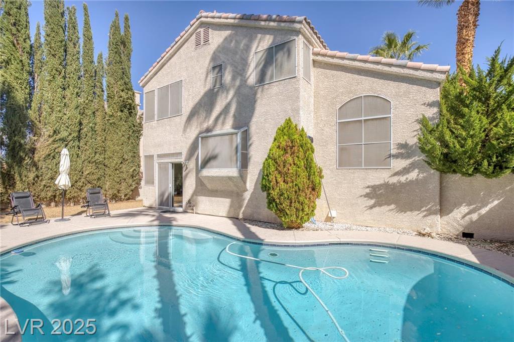 Nestled on a quiet cul-de-sac in the heart of Summerlin North, this 4-bedroom, 2.5-bath home is beautifully updated and full of charm. The kitchen features quartz countertops, marble backsplash, stainless steel appliances, tile flooring, dark-stained wood cabinetry, and a charming garden window. Upstairs you’ll find all 4 bedrooms and the Primary is a stand-out featuring a luxurious ensuite boasting custom cabinetry, quartz counters, and a spacious walk-in shower. Distinctive touches include arched windows and doorways, a skylight at the top of the stairs, and French doors leading to a versatile flex space. Outdoors, enjoy a pool, spacious yard, and 3-car garage. With a newer roof, newer dual A/C units, and walkability to top-rated schools, parks, and trails, this home offers both peace of mind and an exceptional lifestyle. Shopping, dining, and coffee shops are nearby—perfect for Sunday morning strolls with your pup.