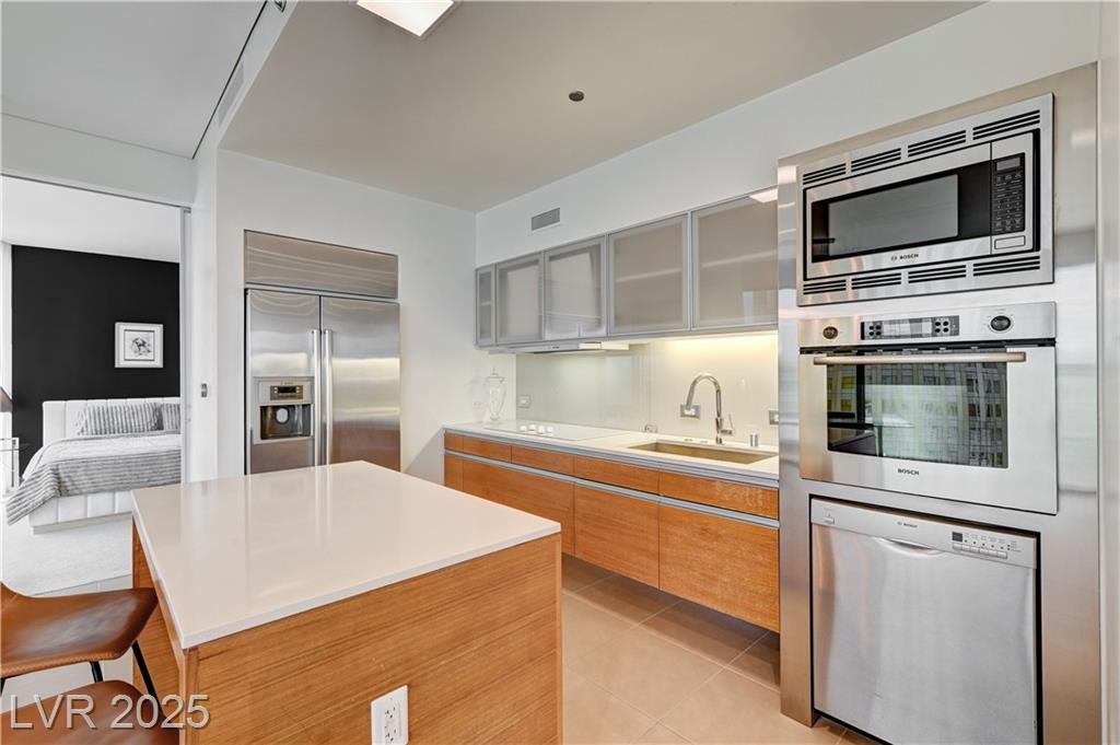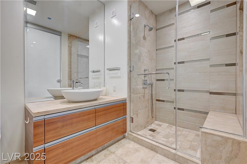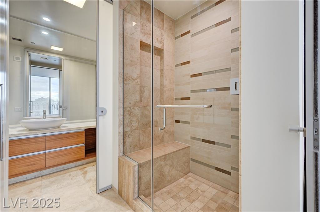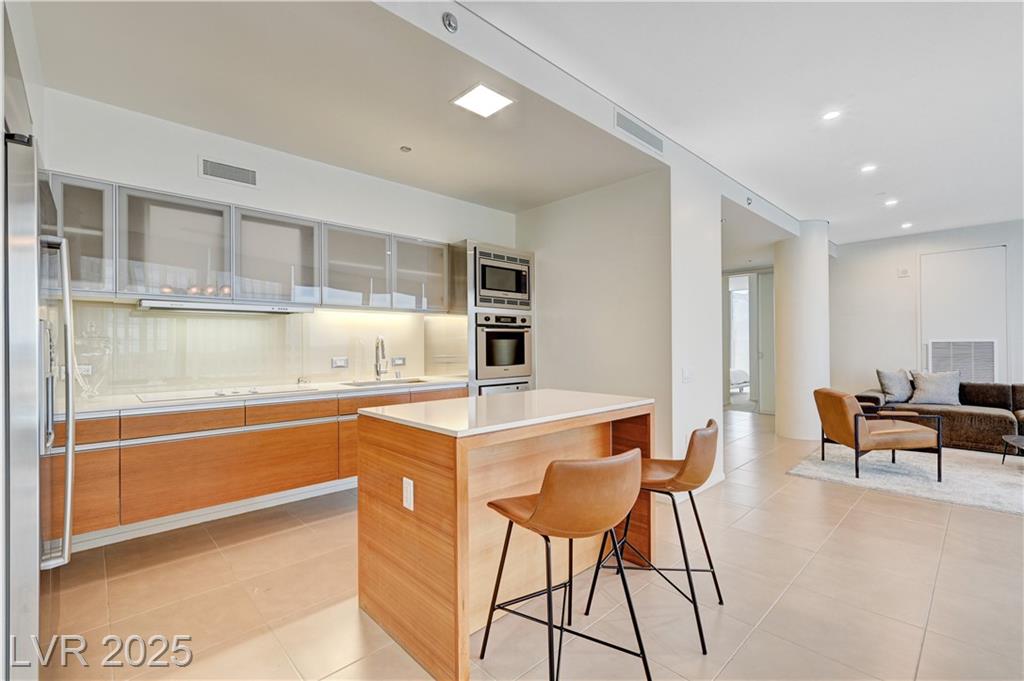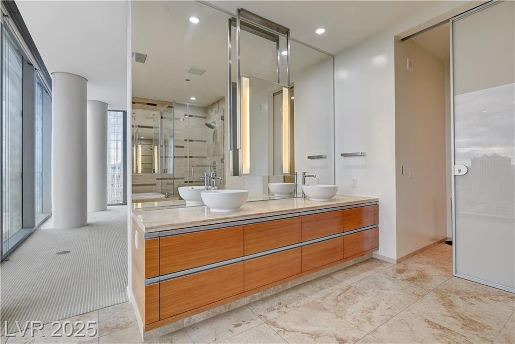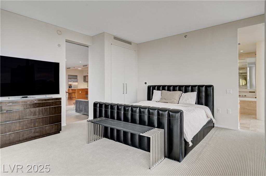 This rare 3-bedroom, 3-bath corner unit offers panoramic views stretching East, South, and West, Strip skyline, desert mountains, and lights. From your floor to ceiling windows, experience the energy of Las Vegas like never before, including front row views of the Vegas Grand Prix, New Year’s fireworks, and the nonstop spectacle of the city below. Inside, the open concept layout features a sleek modern kitchen with quartz countertops, stainless steel appliances, custom European cabinetry, and a spacious storage island overlooking the expansive great room and glittering Strip. Retreat to one of two luxurious primary suites, one with a deep soaking tub, perfect for unwinding after a night out. Whether you’re hosting guests or enjoying a quiet night in, this high-rise sanctuary delivers elevated living with effortless style. Enjoy resort-style amenities including a rooftop infinity pool, spa, fitness center, outdoor kitchen, and exclusive concierge service. With valet parking