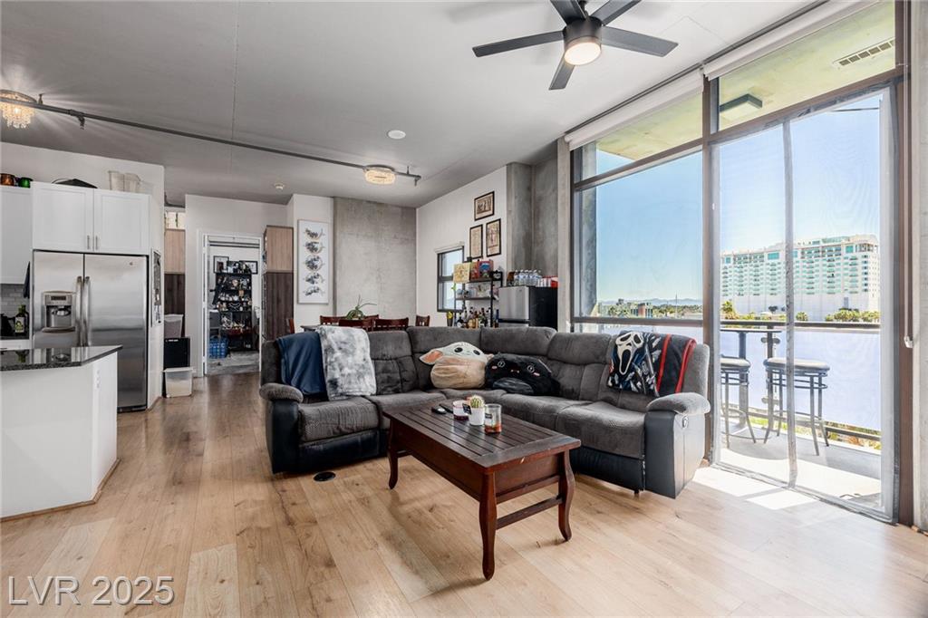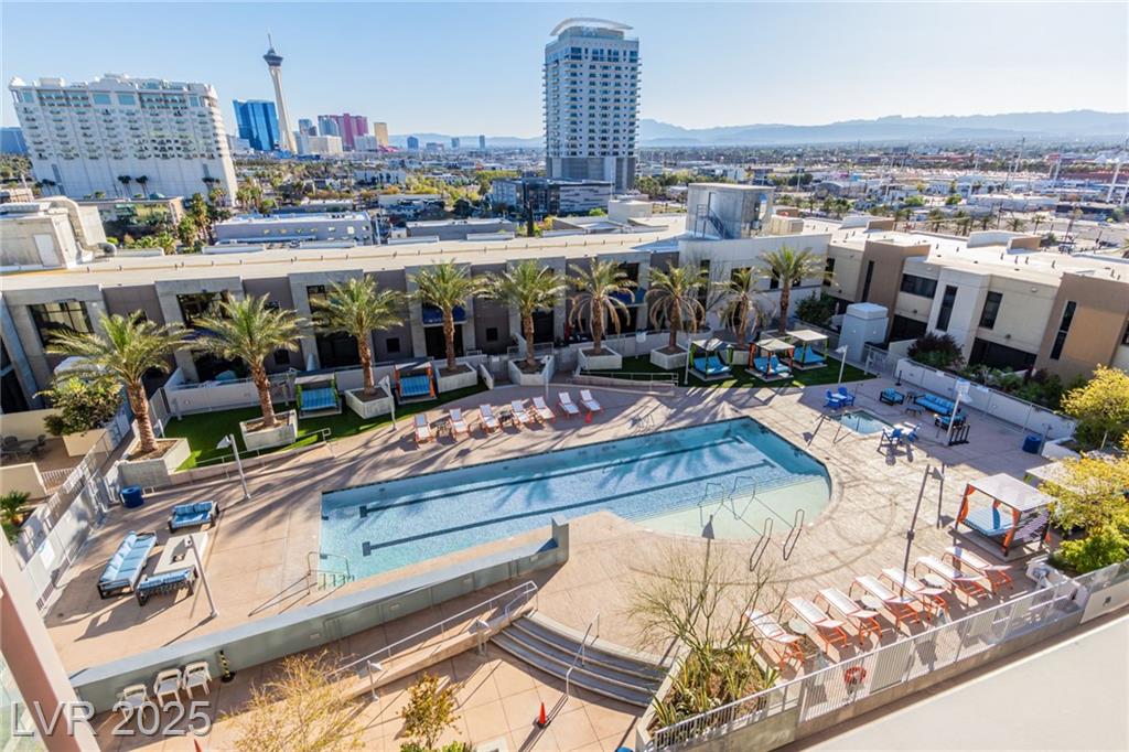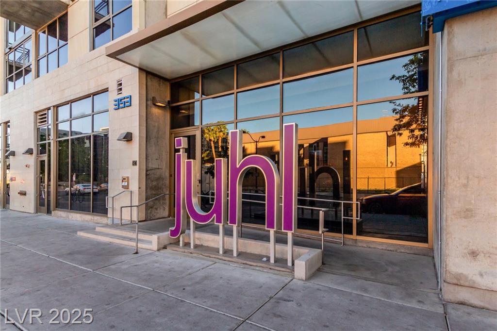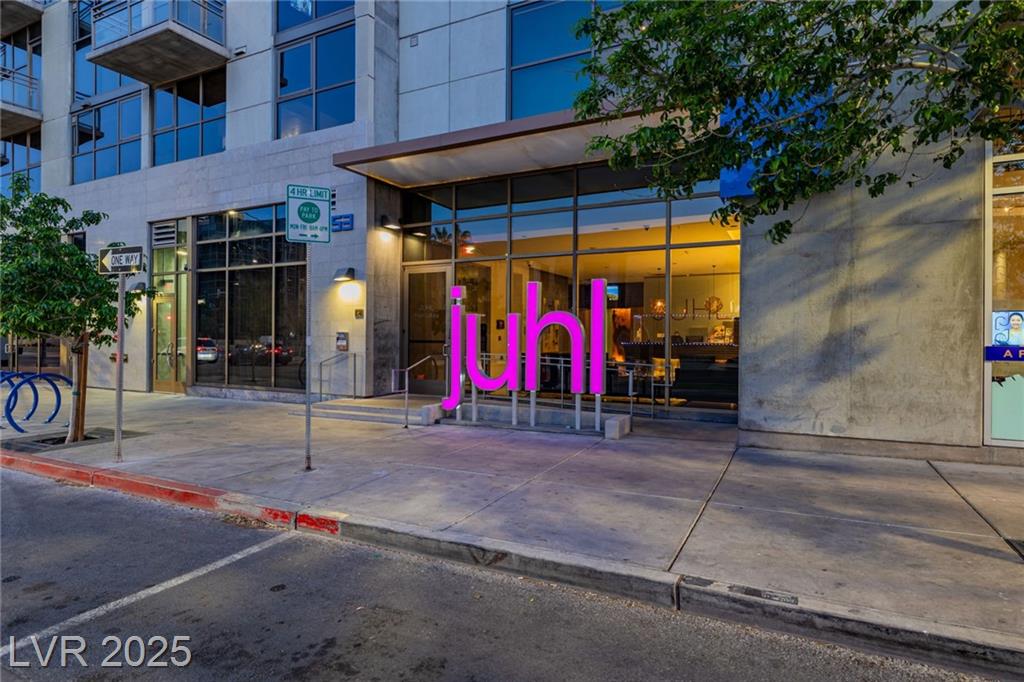 Live where Las Vegas comes alive—at Juhl Tower in Downtown. This sleek 2-bed, 2-bath residence offers 1,100+ sqft of modern design with panoramic floor-to-ceiling windows framing the Strip and city lights. The upgraded kitchen shines with white cabinetry, granite counters, and stainless appliances. Retreat to the primary suite with glass walls, dual vanity, and oversized shower. Resort amenities await: pool with cabanas, spa, private movie theatre, 10th-floor wine deck, and a 2-story fitness center. With 24-hour security, EV charging, and concierge services, convenience is built in. And the lifestyle? Step outside to discover it—two movie theaters, craft bars, and live music venues just blocks away. Walk 15 minutes to Fremont Street or the Arts District for galleries, dining, and nightlife. No long commutes, no endless parking—just true city living in the heart of Las Vegas. Elevator is just around the corner from unit, offering quick access from your assigned parking in the garage.