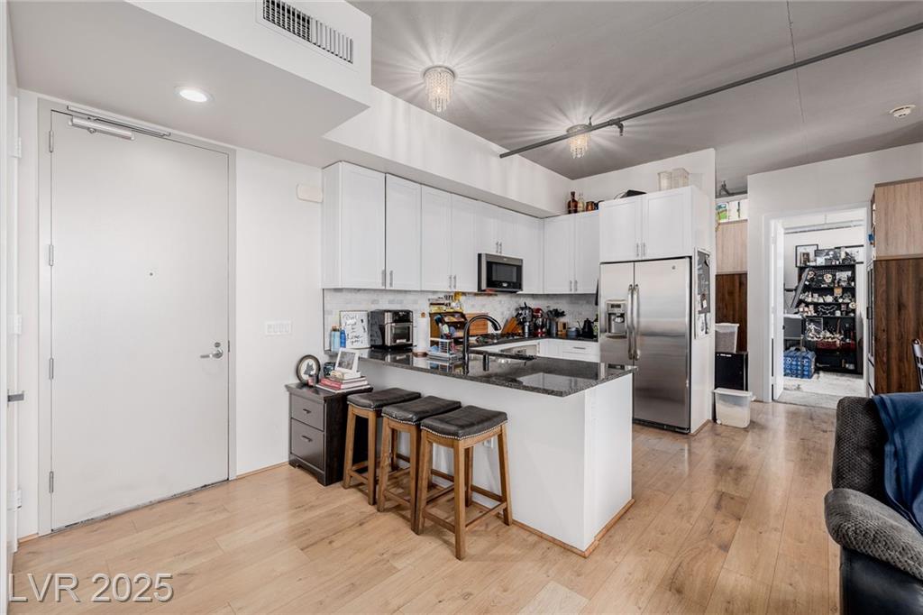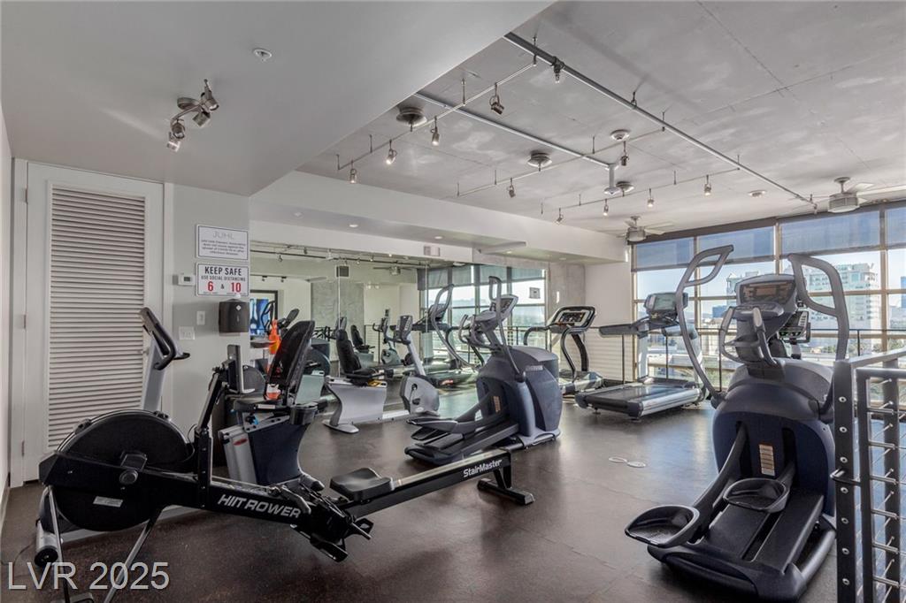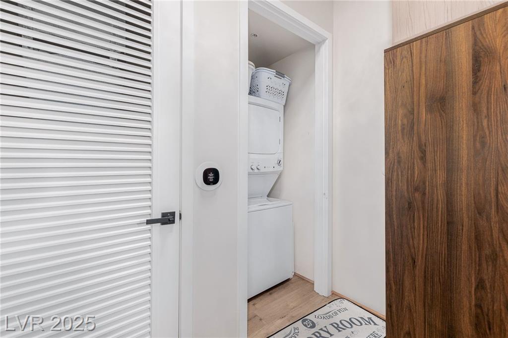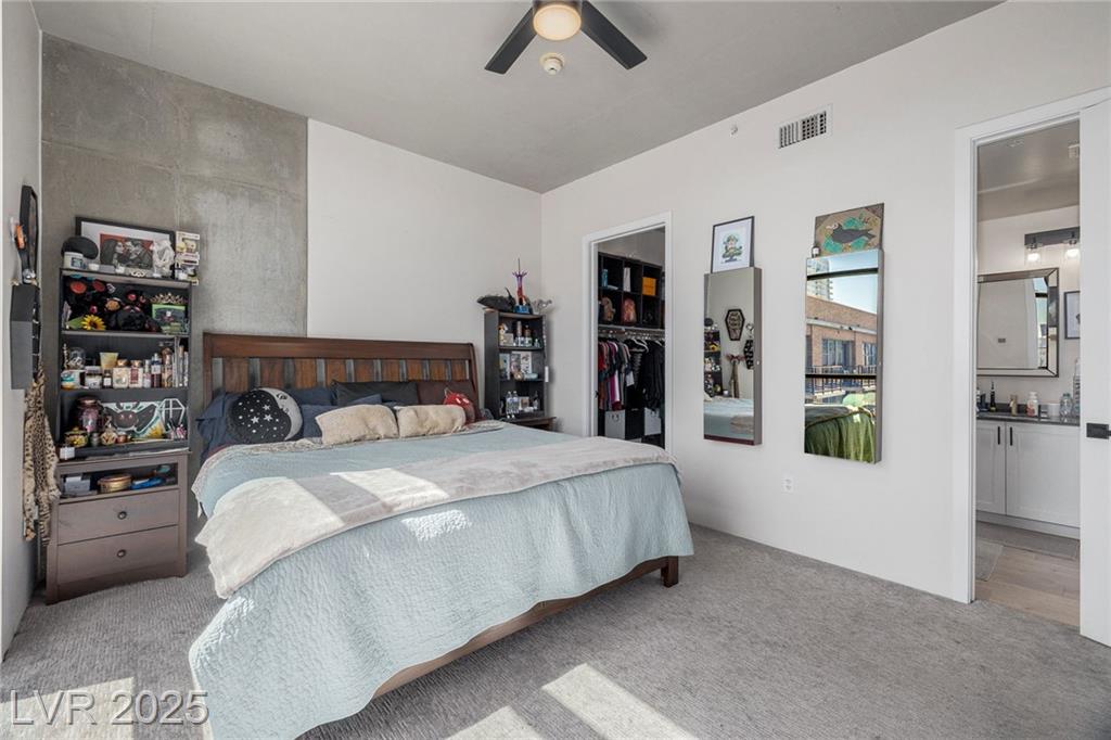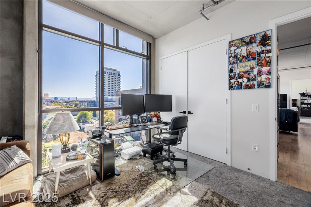 Live where Las Vegas comes alive—at Juhl Tower in Downtown. This sleek 2-bed, 2-bath residence offers 1,100+ sqft of modern design with panoramic floor-to-ceiling windows framing the Strip and city lights. The upgraded kitchen shines with white cabinetry, granite counters, and stainless appliances. Retreat to the primary suite with glass walls, dual vanity, and oversized shower. Resort amenities await: pool with cabanas, spa, private movie theatre, 10th-floor wine deck, and a 2-story fitness center. With 24-hour security, EV charging, and concierge services, convenience is built in. And the lifestyle? Step outside to discover it—two movie theaters, craft bars, and live music venues just blocks away. Walk 15 minutes to Fremont Street or the Arts District for galleries, dining, and nightlife. No long commutes, no endless parking—just true city living in the heart of Las Vegas. Elevator is just around the corner from unit, offering quick access from your assigned parking in the garage.
