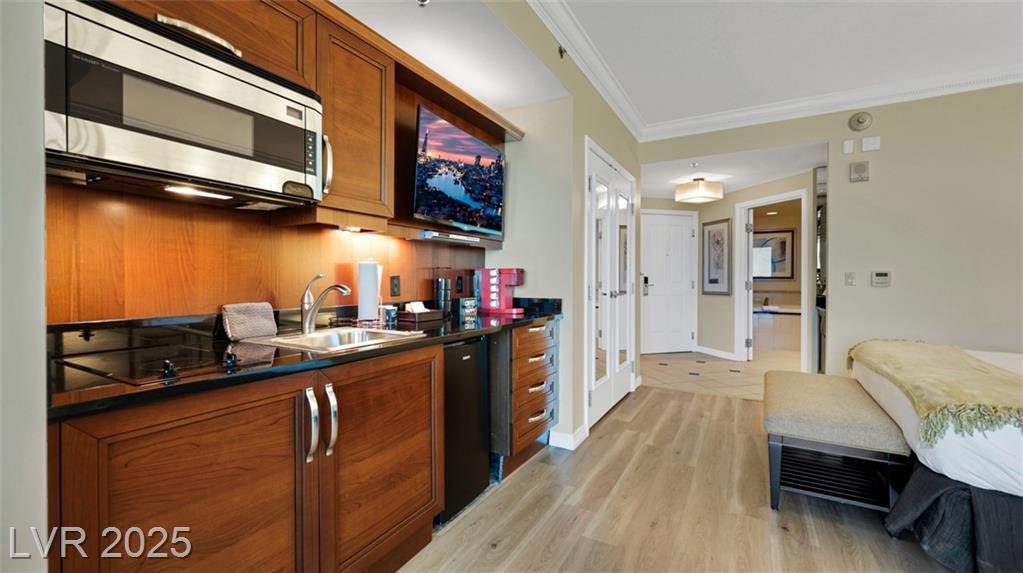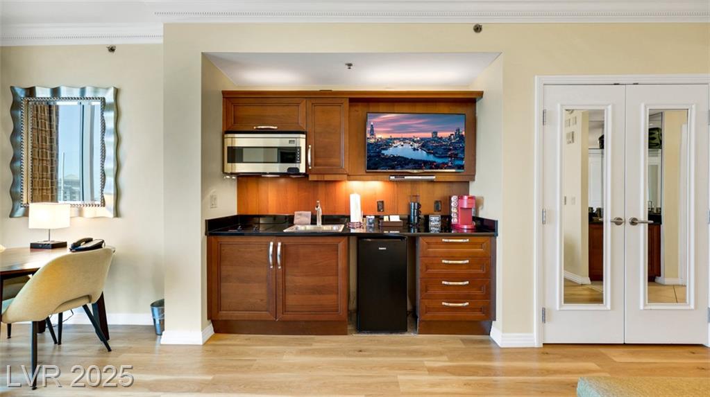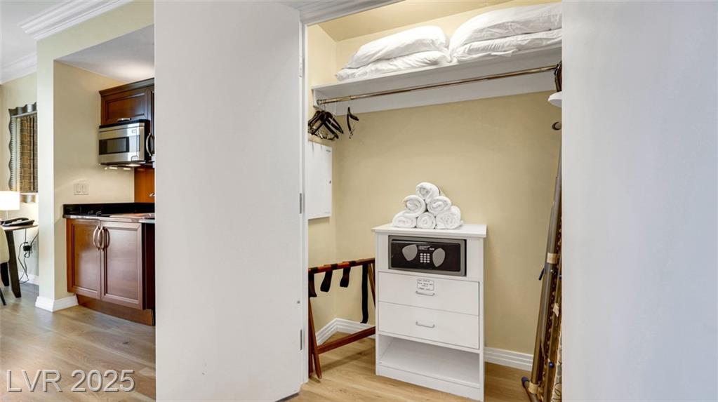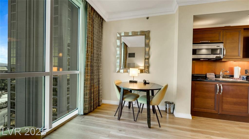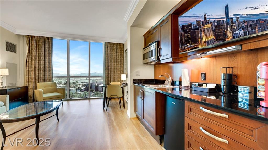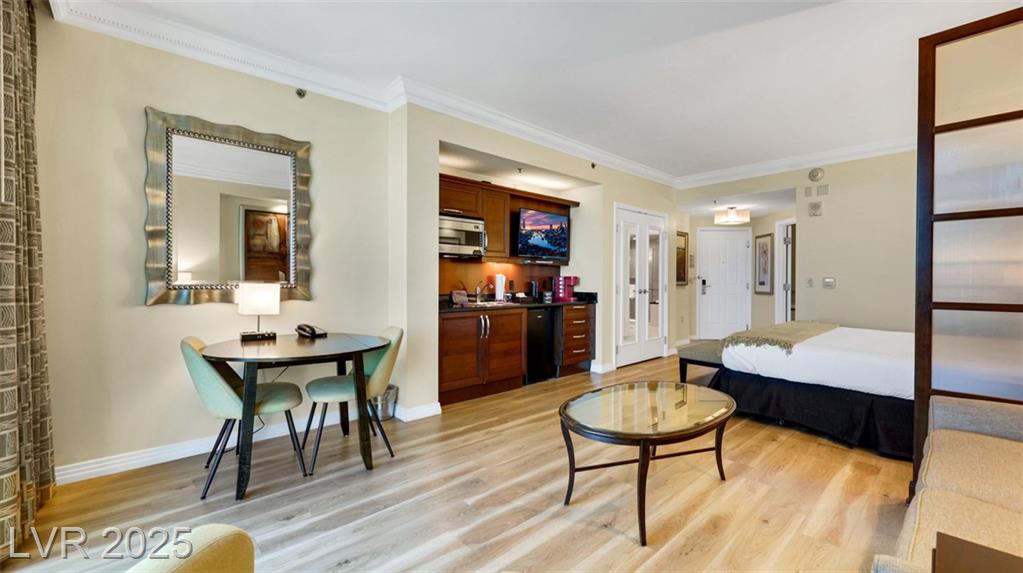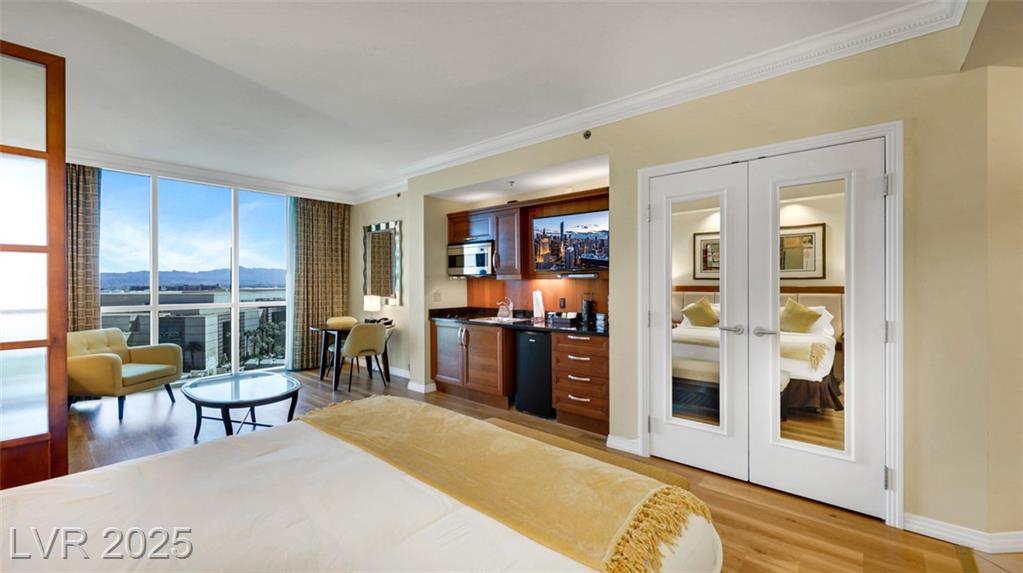Beautiful Fully Furnished MGM Signature Studio – Prime Las Vegas Location! Guard-gated MGM Signature studio in excellent condition with modern wood-look LVP flooring. Fully furnished, turnkey, and currently managed as Airbnb. Sleeps 4: King bed + Queen sofa sleeper. The kitchenette has a mini bar fridge, a 2-burner cooktop, and granite counters. Living area with built-in entertainment center. Luxury bath with Jacuzzi tub and granite counters. Resort-style amenities: multiple pools, valet, Deli (Tower B), Owner’s Bar & Lounge, Starbucks (Tower A). Connected to MGM Grand via Studio Walk. Minutes from the Las Vegas Strip & Harry Reid Airport. Great investment opportunity!