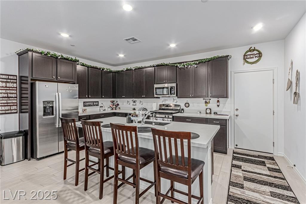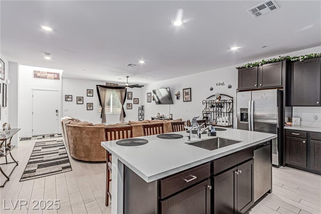 Discover this fabulous 2-bedroom townhome in Henderson, NV! Experience the perfect blend of charm and style in the inviting open floor plan, enhanced by wood-look tile flooring, abundant natural light, neutral palette, and ceiling fans throughout. Spotless kitchen comes with recessed lighting, abundant cabinetry with crown moulding, stainless steel appliances, quartz counters, and a center island with a breakfast bar. A powder room is conveniently located on the main level, with extra storage tucked neatly under the stairs. In the serene primary bedroom, you will have plush carpet, sliding glass doors to the balcony, and a trendy barn door to the ensuite, comprised of dual sinks and a walk-in closet. Unwind on the cozy balcony or take a refreshing dip in the Community pool. Don't let this gem slip by! Hurry!