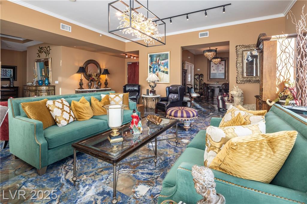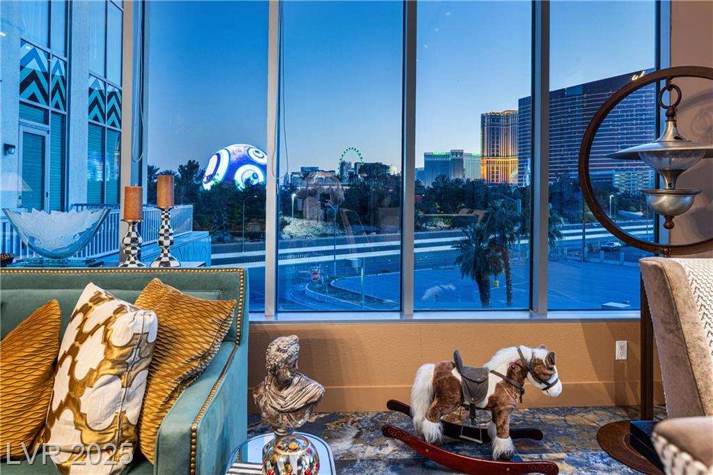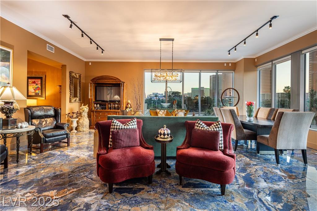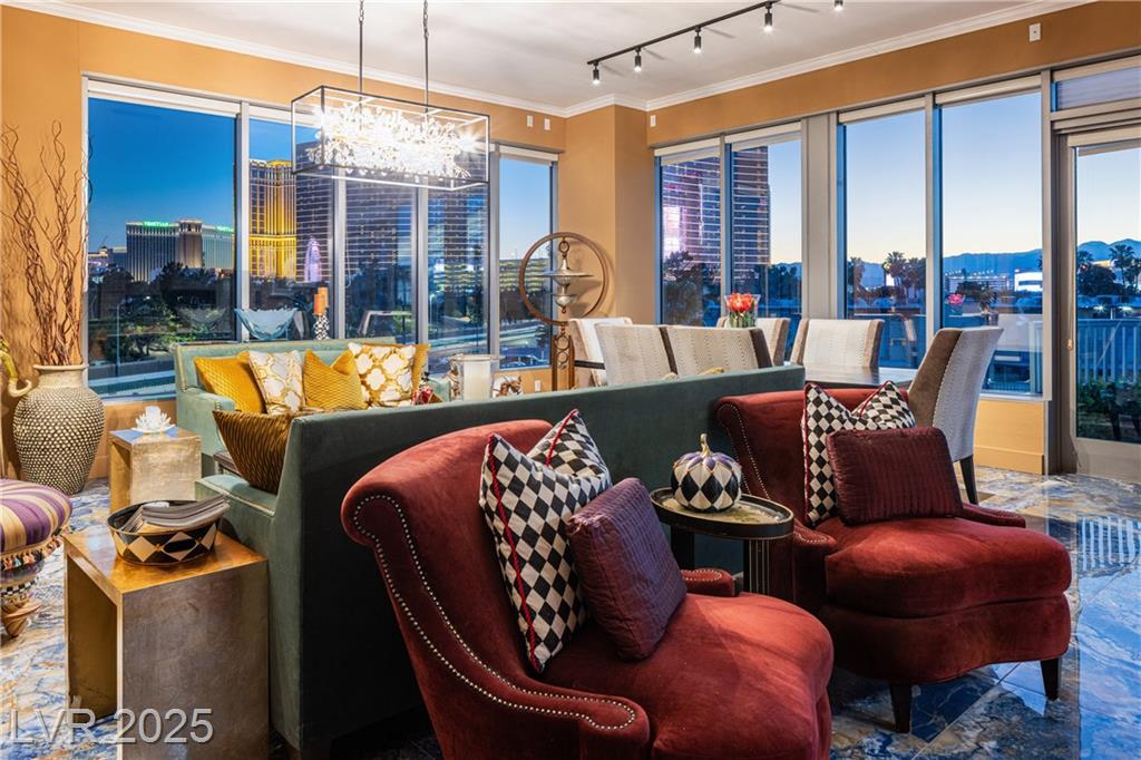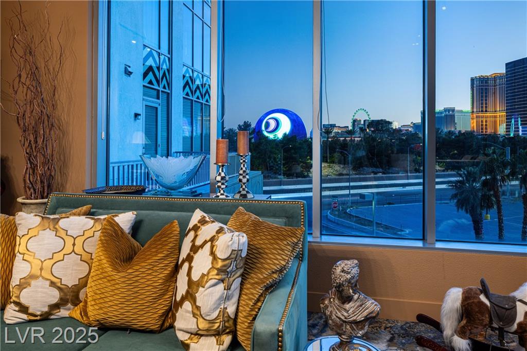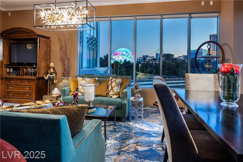 Live in one of Las Vegas’s most architecturally distinctive high-rises, The Metropolis, where Art Deco design meets panoramic views. This stunning residence offers views of the Las Vegas Strip & Sphere. Two private balconies are perfect for taking in the Las Vegas skyline. The living and dining areas with imported flooring bosts dramatic views. The chef’s kitchen is equipped with top-of-the-line GE Profile appliances, including a gas stove-top range, double ovens, warming drawer, granite countertops, flowing seamlessly. The primary suite has direct balcony access, a walk-in closet, and a en-suite bath with soaking tub & separate shower. Bedroom 2 has its own en-suite & private balcony. Additionally, you’ll find a versatile space for a private office, or library. Additionally this unit has 2 side by side parking spaces, and a 6'x9' Sq Ft Storage unit. The Metropolis amenities include: a heated pool, gym, 24-hour security, doggy park, BBQ area, & putting green!