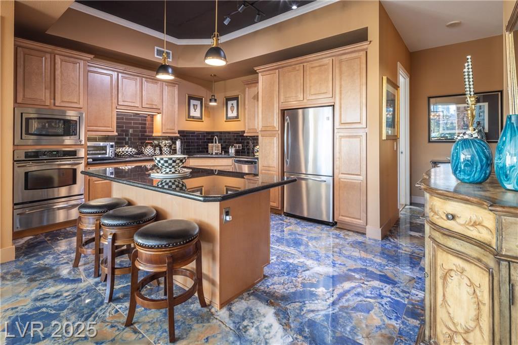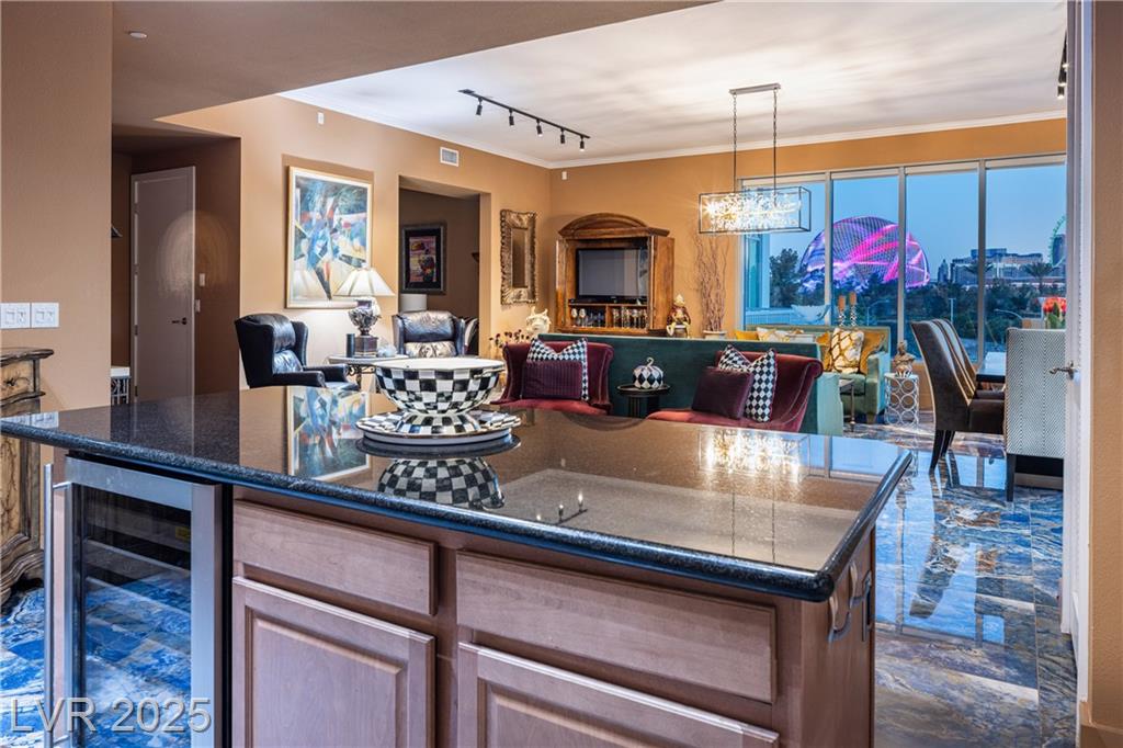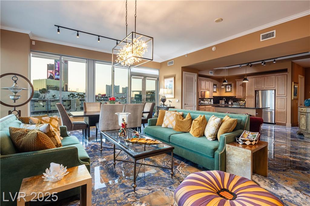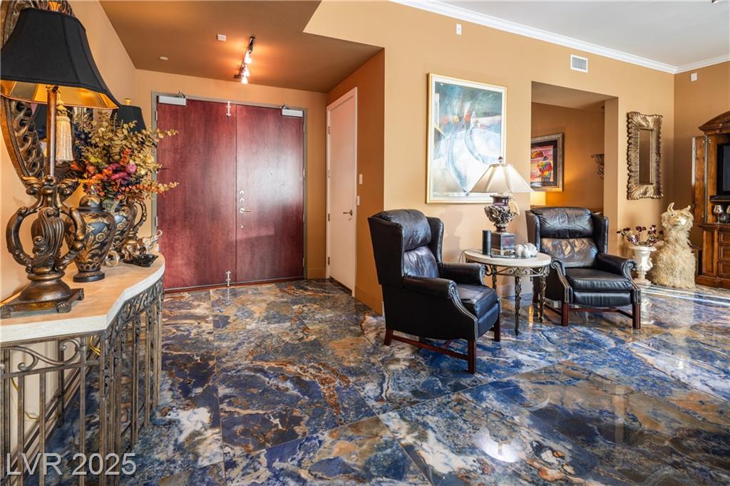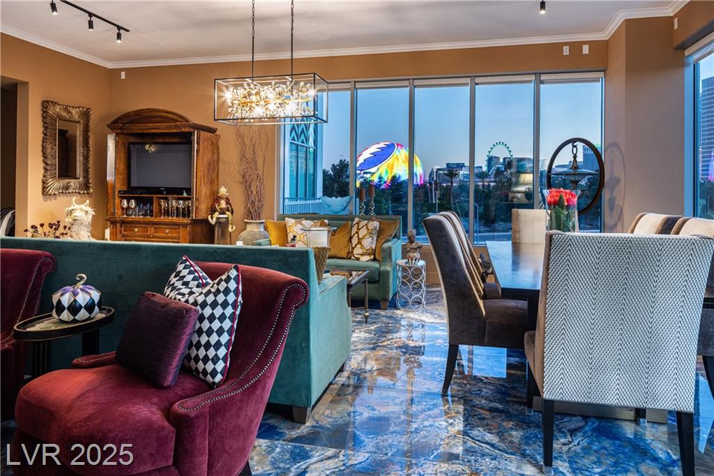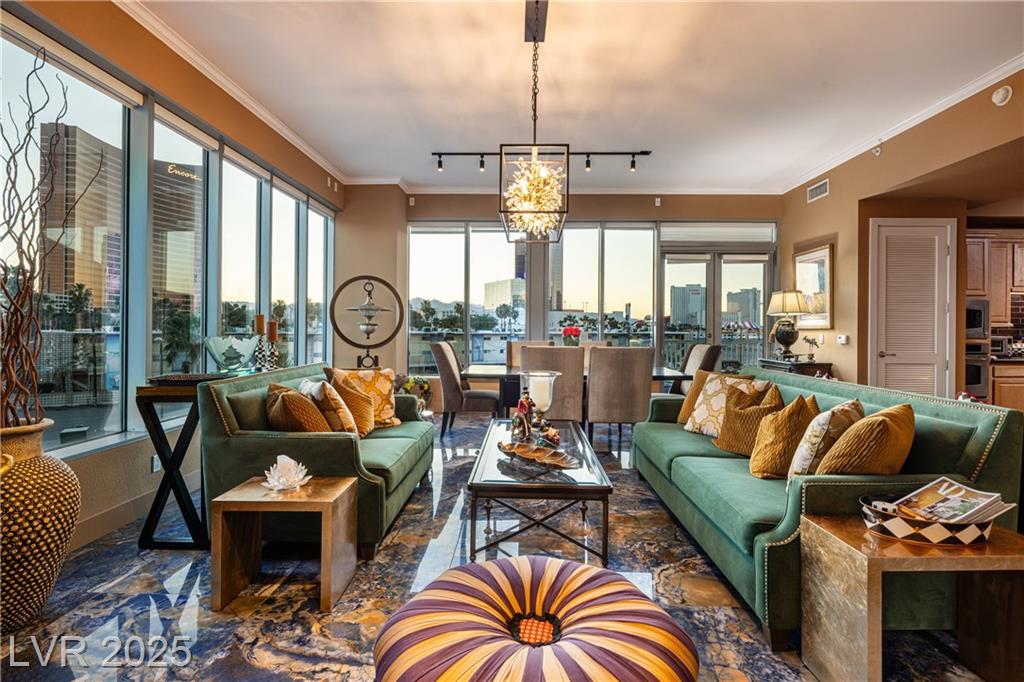 Live in one of Las Vegas’s most architecturally distinctive high-rises, The Metropolis, where Art Deco design meets panoramic views. This stunning residence offers views of the Las Vegas Strip & Sphere. Two private balconies are perfect for taking in the Las Vegas skyline. The living and dining areas with imported flooring bosts dramatic views. The chef’s kitchen is equipped with top-of-the-line GE Profile appliances, including a gas stove-top range, double ovens, warming drawer, granite countertops, flowing seamlessly. The primary suite has direct balcony access, a walk-in closet, and a en-suite bath with soaking tub & separate shower. Bedroom 2 has its own en-suite & private balcony. Additionally, you’ll find a versatile space for a private office, or library. Additionally this unit has 2 side by side parking spaces, and a 6'x9' Sq Ft Storage unit. The Metropolis amenities include: a heated pool, gym, 24-hour security, doggy park, BBQ area, & putting green!