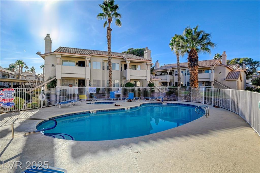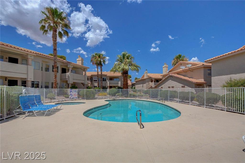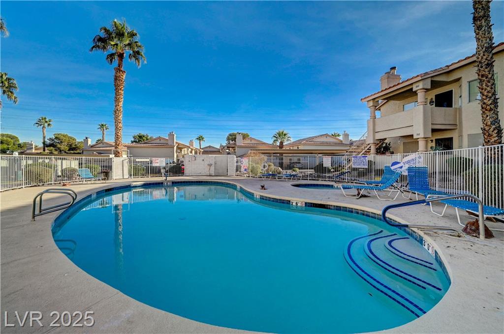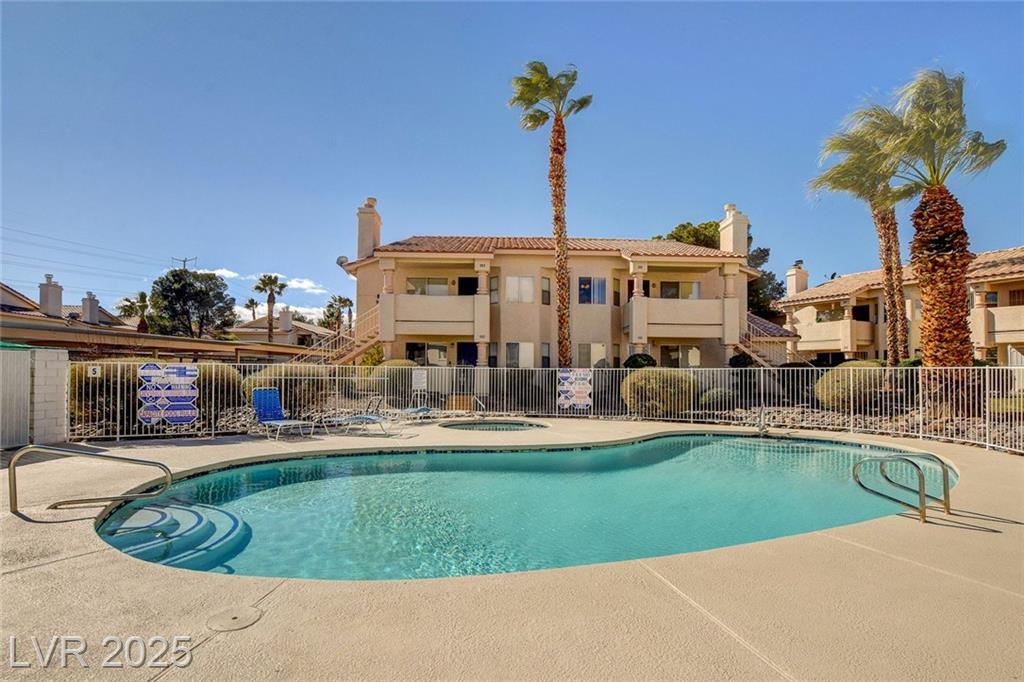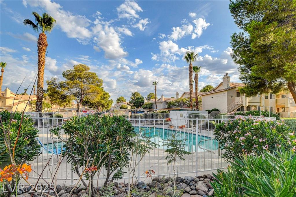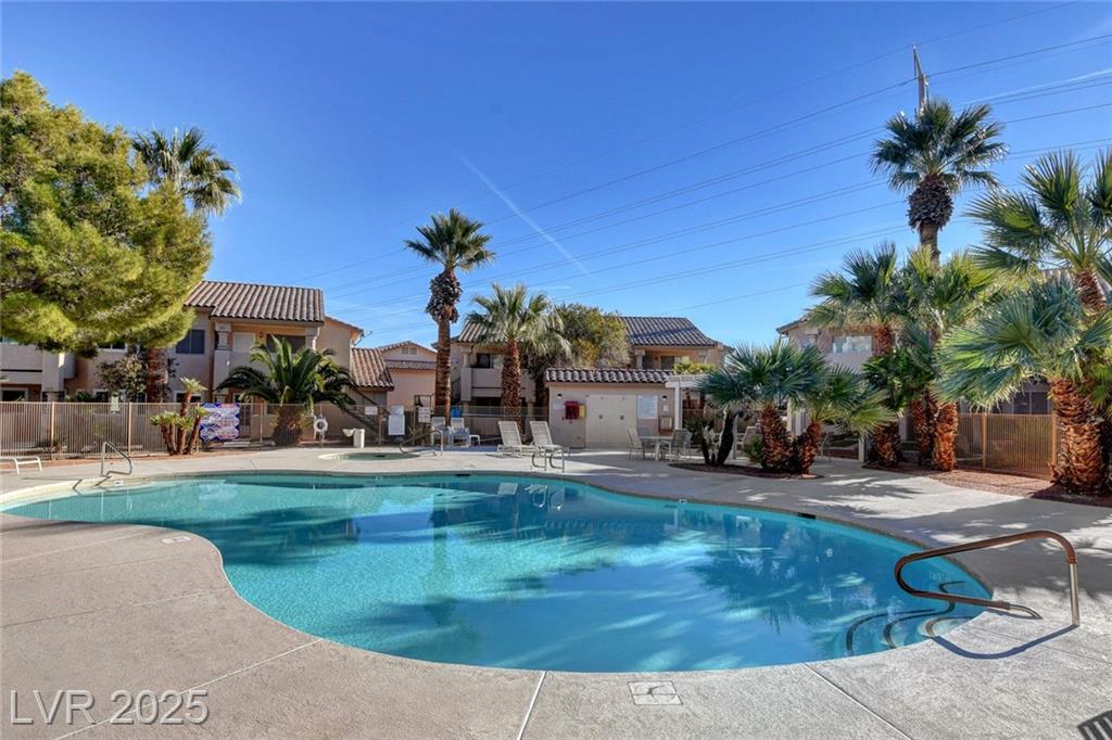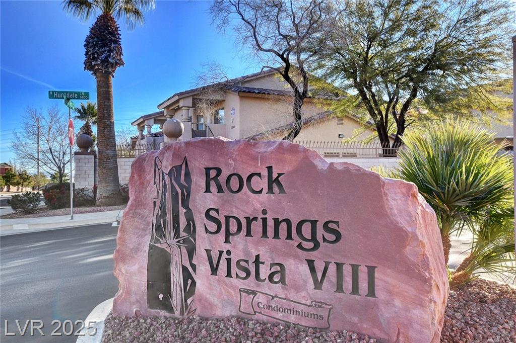 Spacious first-floor condo in Rock Springs Vista, just outside Summerlin! This 2 bedroom, 2 bathroom home offers 1,136 sq ft with an open floor plan featuring a cozy fireplace, breakfast bar, and bright dining nook. Both bedrooms are generously sized. Shaded by mature trees, the private patio creates a lush and relaxing retreat. Enjoy being just steps from the sparkling community pool and spa. Additional highlights include in-unit laundry with washer & dryer included, covered parking, and a prime location close to shopping, dining, and freeway access. A perfect blend of comfort, convenience, and resort-style living!