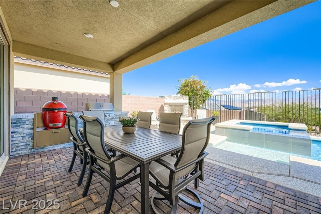 This home has it ALL! Less than 2yrs old and showcasing over $300K in upgrades, this BETTER than new home features every upgrade one could dream of. Owned and paid off solar panels! SID fee of over $13,000 paid off! Private pool & spa and panoramic, breathtaking mountain views offer an ideal space for relaxation. Eastern facing backyard offers covered patio, outdoor kitchen, and fireplace perfect for enjoying morning sunrises. The great room features multi-slide stacked door which allows for a smooth transition from indoor to outdoor living. The kitchen is a true entertainer's fantasy: 42" white cabinetry with straight edge crown molding, Chef kitchen design, oversized island, upgraded appliance package, and pantry. Trilogy Sunstone is a resort-style 55+ community featuring outdoor pool & spa, fitness center, pickleball courts, coffee bar, restaurant, event center and MUCH MORE. One of a kind community. Your dream home is complete and ready for you—no construction delays, no waiting.